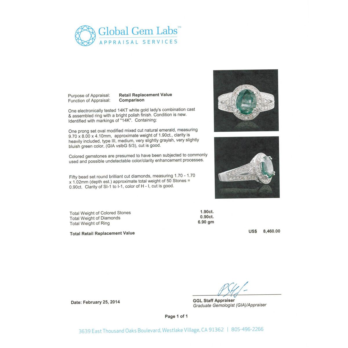 Great Condition! One electronically tested 14KT white gold Ladies combination cast & assembled ring with a bright polish finish. Condition is new. Identified with markings of "14K". Containing: One prong set oval modified mixed cut natural emerald, measuring 9.70 x 8.00 x 4.10mm, approximate weight of 1.90ct., clarity is heavily included, type III, medium, very slightly grayish, very slightly bluish green color, (GIA vslbG 5/3), cut is good. Colored gemstones are presumed to have been subjected to commonly used and possible undetectable color/clarity enhancement processes. Fifty bead set round brilliant cut diamonds, measuring 1.70 - 1.70 x 1.02mm (depth est.) approximate total weight of 50 Stones = 0.90ct. Clarity of SI-1 to I-1, Color of H - I, Cut is Good. Total Weight of Colored Stones 1.90ct. Total Weight of Diamonds 0.90ct. Total Weight of Ring 6.90 grams. GGL Appraised at $8,460.00.