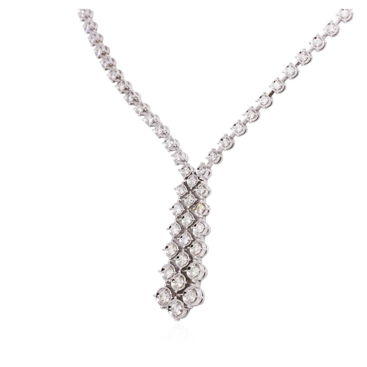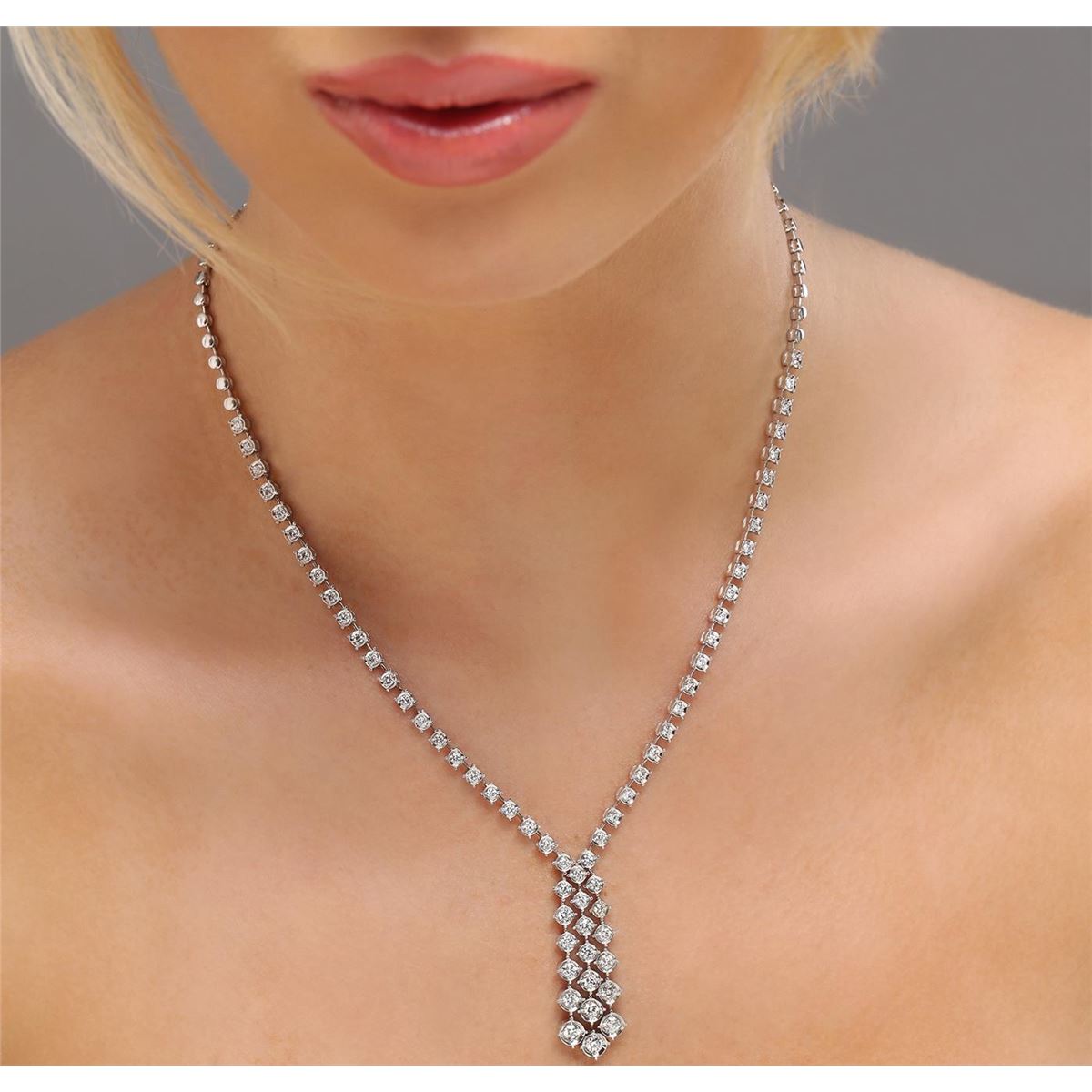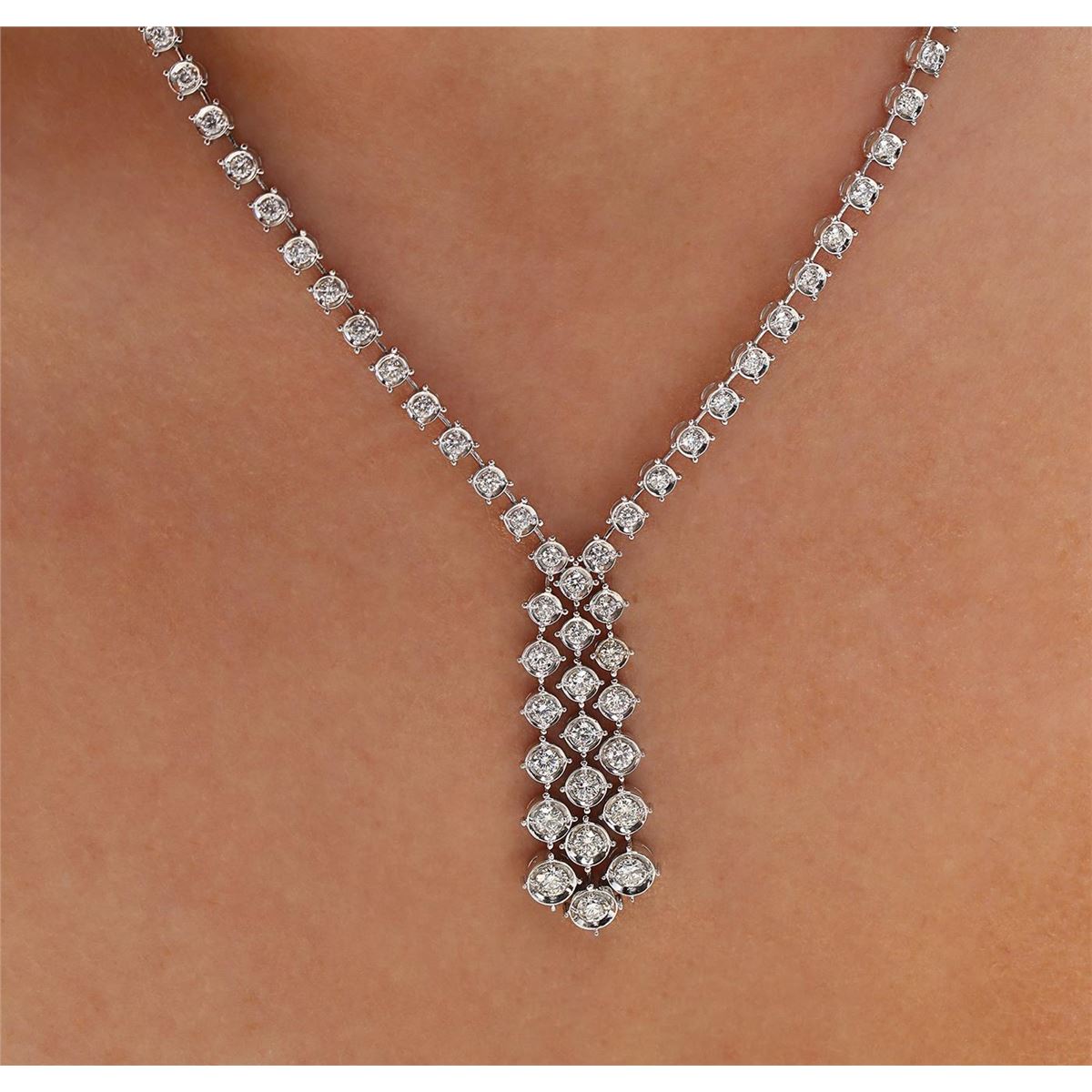 One electronically tested 14KT white gold ladies combination cast & assembled diamond necklace with a hidden box clasp with safety closer with a bright polish finish. Identified with markings of "14K". Condition is new. Containing: Sixty-Five prong set round brilliant cut diamonds, measuring 2.00 - 2.00 x 1.20mm (depth est.) approximate total weight of 65 Stones = 1.90ct. Clarity: SI-1 to SI-2. Color: I - J, Cut is Good. All diamonds are graded in the mounting, unless otherwise stated. Total Weight of Diamonds 1.90ct. Total Weight of Necklace 24.10 grams. GGL Appraised at $11,360.00.