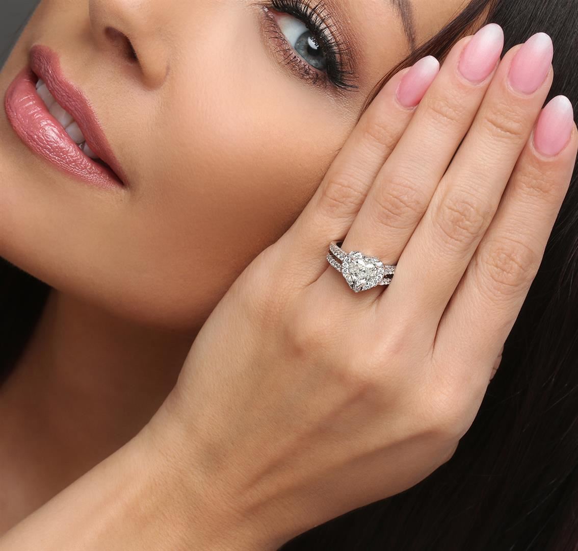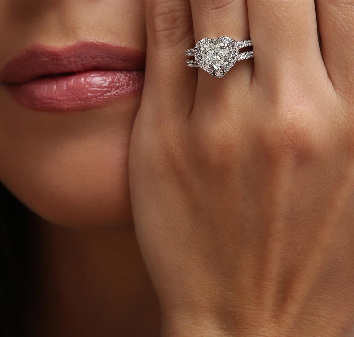One electronically tested 14KT white gold ladies cast diamond engagement ring with a bright polish finish. Condition is new. Containing: One prong set heart shaped cut diamond, measuring 7.50 x 6.50 x 4.88mm (depth est.) approximate weight of 1.40ct. Clarity: SI. Color: K, Cut is Good. Forty prong set round brilliant cut diamonds, measuring 1.50 - 1.50 x 0.90mm (depth est.) approximate total weight of 40 Stones = 0.49ct. Clarity: SI-1 to SI-2. Color: I - J, Cut is Good. All diamonds are graded in the mounting, unless otherwise stated. Total Weight of Diamonds 1.90ct. Total Weight of Engagement Ring 6.10 grams. GGL Appraised at $10,780.00.