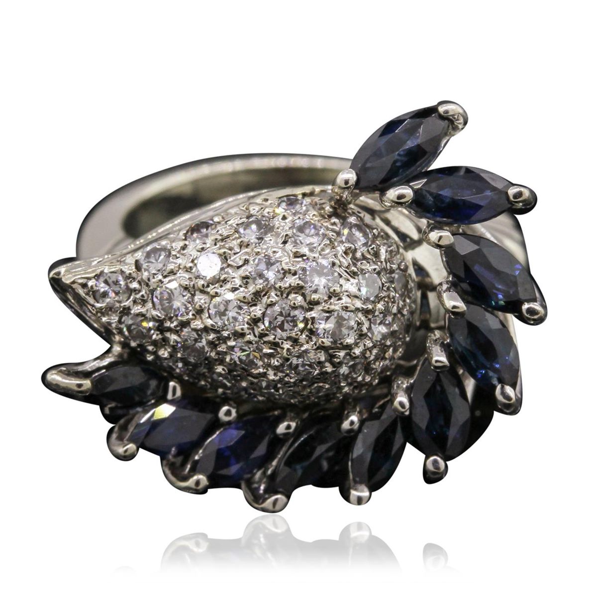 One electronically tested 14KT white gold ladies cast & assembled diamond and sapphire ring with a bright polish finish. Condition is good. The ring features a diamond set center set within a cascading sapphire bezel, supported by diagonally lobed white gold shoulders and completed by a two and one-half millimeter wide band. Containing: Ten prong set marquise mixed cut natural blue sapphires, measuring 5.30 x 2.70 x 1.76mm, approximate. Total Weight of 1.90ct., clarity is eye clean, type II, dark, strong, violetish blue color, (GIA vB 7/5), cut is good. Transmitting light with no distortion, transparent. Partial color zoning present. Measurements & the color grade are an average for the group. Graded in the setting. Thirty-One pav‚ set round brilliant cut diamonds, measuring 2.00 - 1.80 x 1.14mm (depth est.) approximate. Total Weight of 31 Stones = 0.81ct. Faint brown secondary color throughout. Graded in the setting. Clarity: SI-1 to SI-2. Color: J - L. Total Weight of Colored Stones 1.90ct. Total Weight of Diamonds 0.81ct. Total Weight of Ring 9.60 grams. AIG Appraised at $4,385.00.