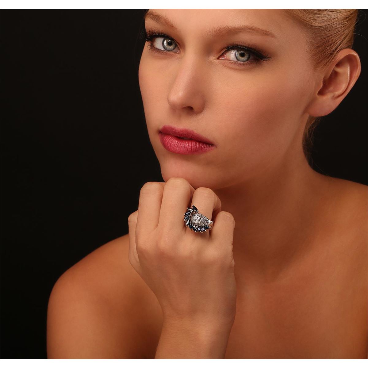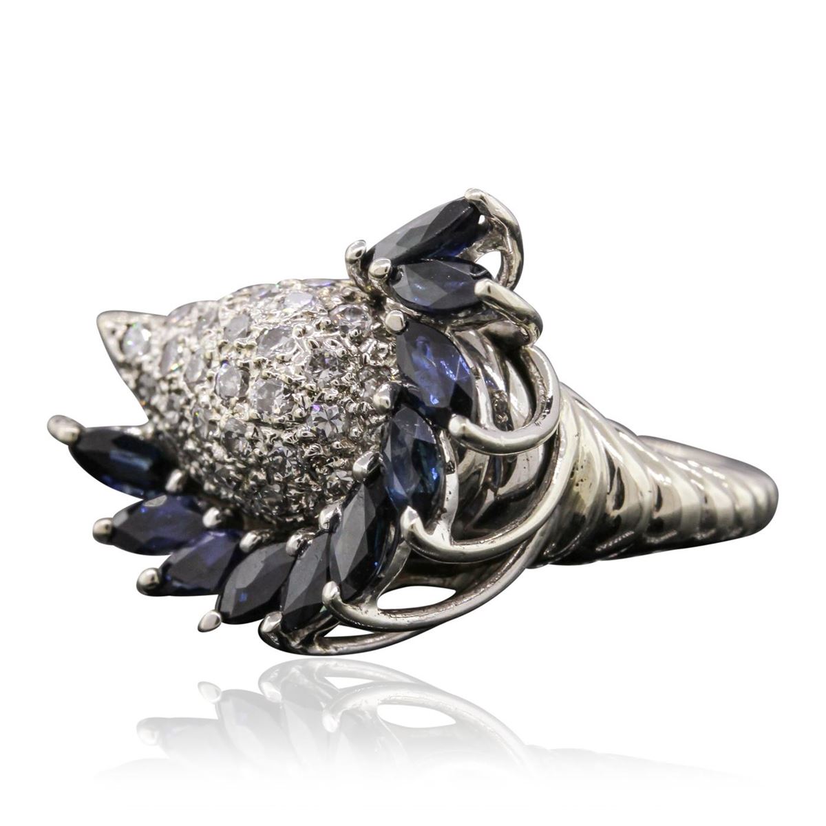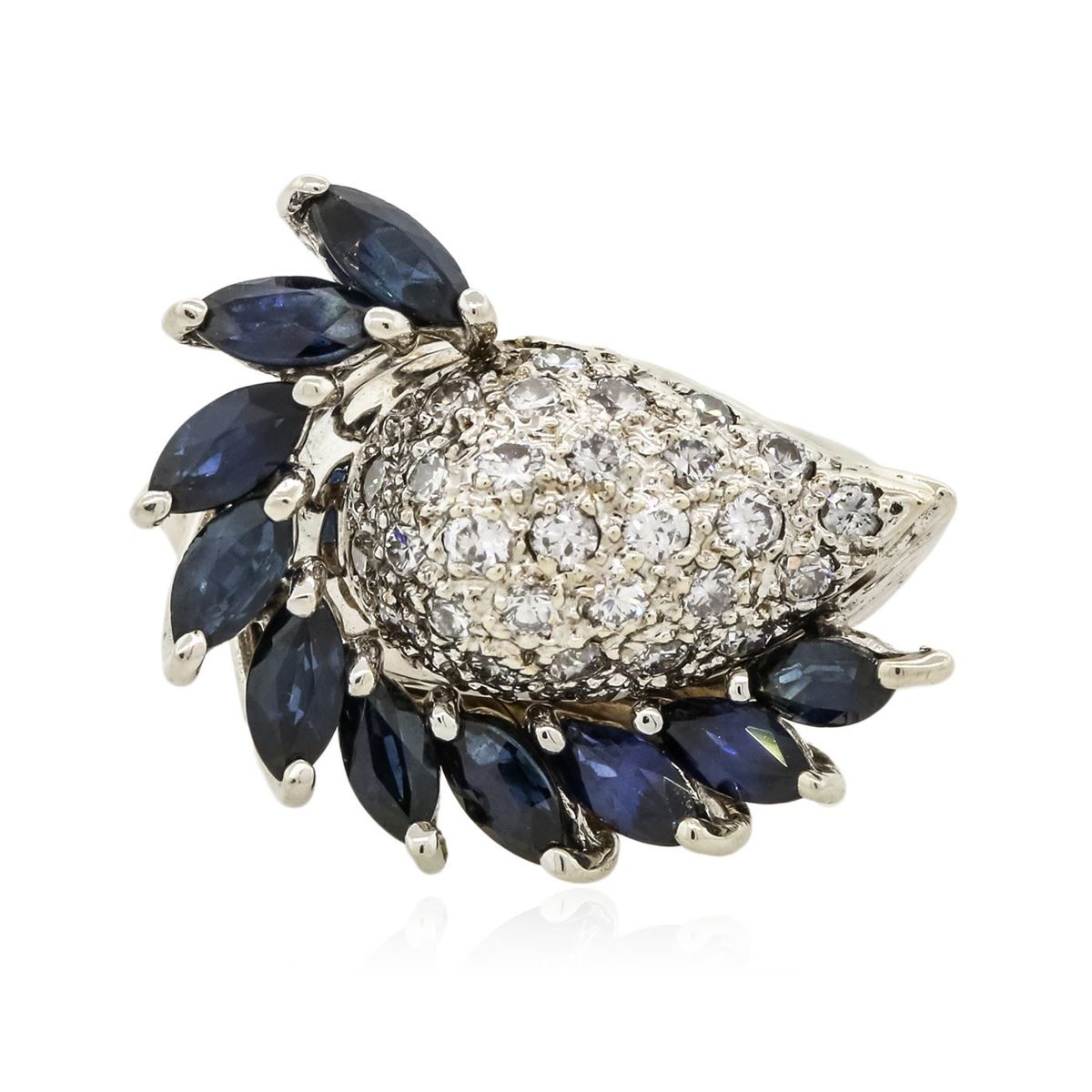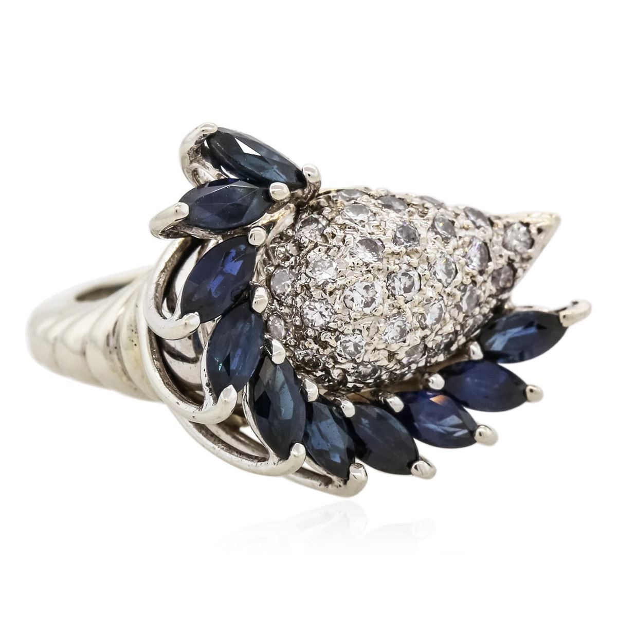 One electronically tested 14KT white gold ladies cast & assembled diamond and sapphire ring with a bright polish finish. Condition is good. The ring features a diamond set center set within a cascading sapphire bezel, supported by diagonally lobed white gold shoulders and completed by a two and one-half millimeter wide band. Containing: Ten prong set marquise mixed cut natural blue sapphires, measuring 5.30 x 2.70 x 1.76mm, approximate. Total Weight of 1.90ct., clarity is eye clean, type II, dark, strong, violetish blue color, (GIA vB 7/5), cut is good. Transmitting light with no distortion, transparent. Partial color zoning present. Measurements & the color grade are an average for the group. Graded in the setting. Thirty-One pav‚ set round brilliant cut diamonds, measuring 2.00 - 1.80 x 1.14mm (depth est.) approximate. Total Weight of 31 Stones = 0.81ct. Faint brown secondary color throughout. Graded in the setting. Clarity: SI-1 to SI-2. Color: J - L. Total Weight of Colored Stones 1.90ct. Total Weight of Diamonds 0.81ct. Total Weight of Ring 9.60 grams. AIG Appraised at $4,385.00.