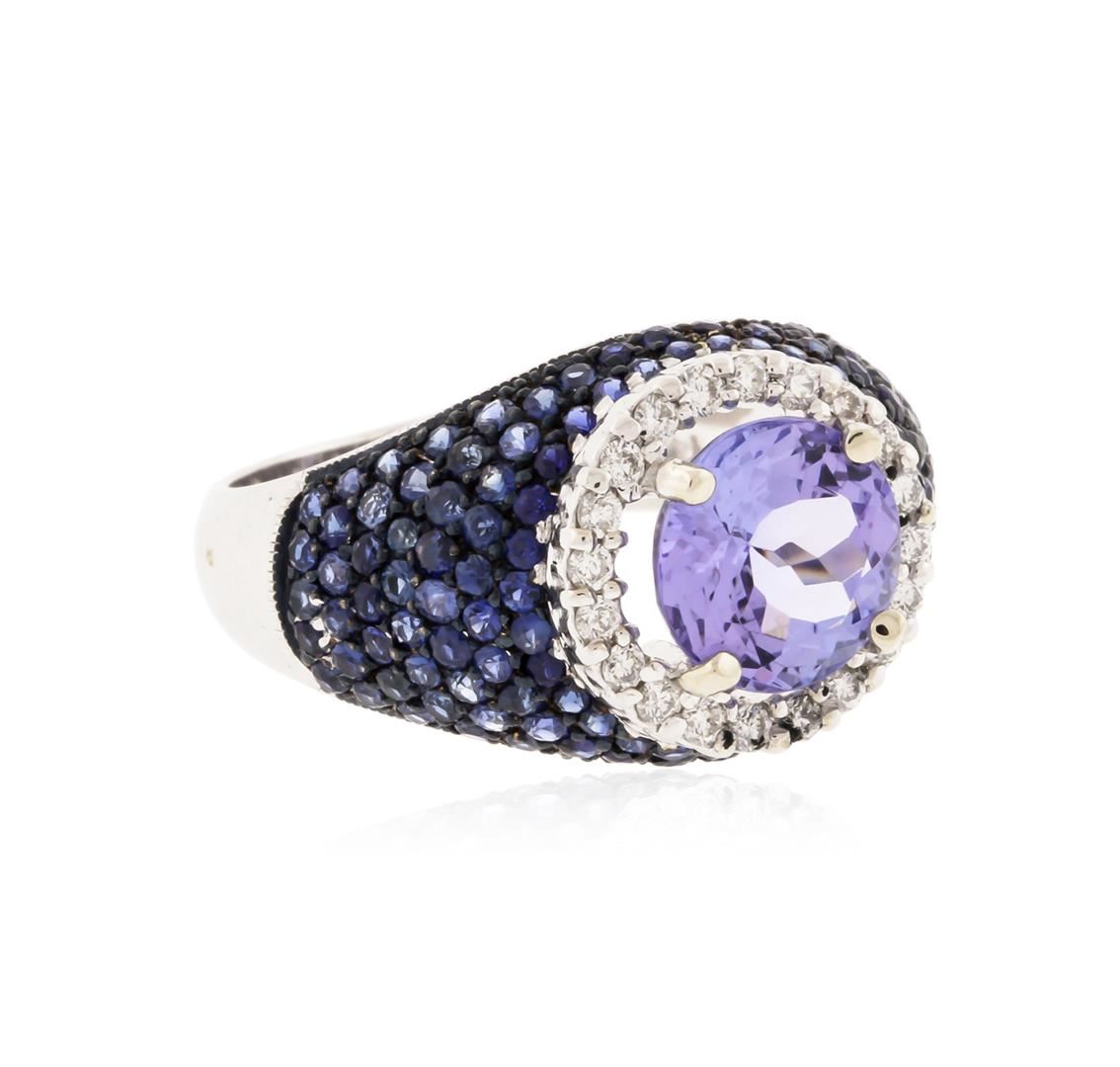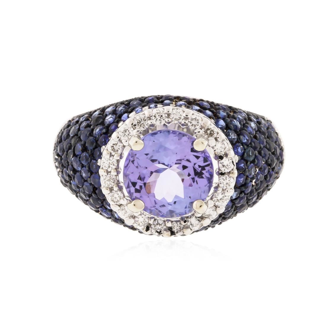 One electronically tested 14KT white gold ladies cast tanzanite, sapphire and diamond ring with a bright polish finish. Identified with markings of "14K". Condition is new. Containing: One prong set round modified brilliant cut natural tanzanite, measuring 7.60 - 7.60 x 4.94 mm, approximate weight of 1.91ct., clarity is eye clean, type I, medium light, very slightly grayish, violet color, (GIA V 4/3), cut is good. One hundred twelve prong set round modified brilliant cut natural blue sapphires, measuring 1.50 - 1.50 x 0.98 mm, approximate total weight of 2.24ct., clarity is moderately included, type II, medium dark, moderately strong, blue color, (GIA B 6/4), cut is good. Twenty prong set round brilliant cut diamonds, measuring 1.30 - 1.30 x 0.78mm (depth est.) approximate total weight of 20 Stones = 0.16ct. Clarity: SI-1 to SI-2. Color: H - I, Cut is Good. Colored gemstones are presumed to have been subjected to commonly used enhancement processes. All diamonds and colored gemstones are graded in the mounting, unless otherwise stated. Total Weight of Colored Stones 4.15ct. Total Weight of Diamonds 0.16ct. Total Weight of Ring 5.20 grams. GGL Appraised at $4,005.00.