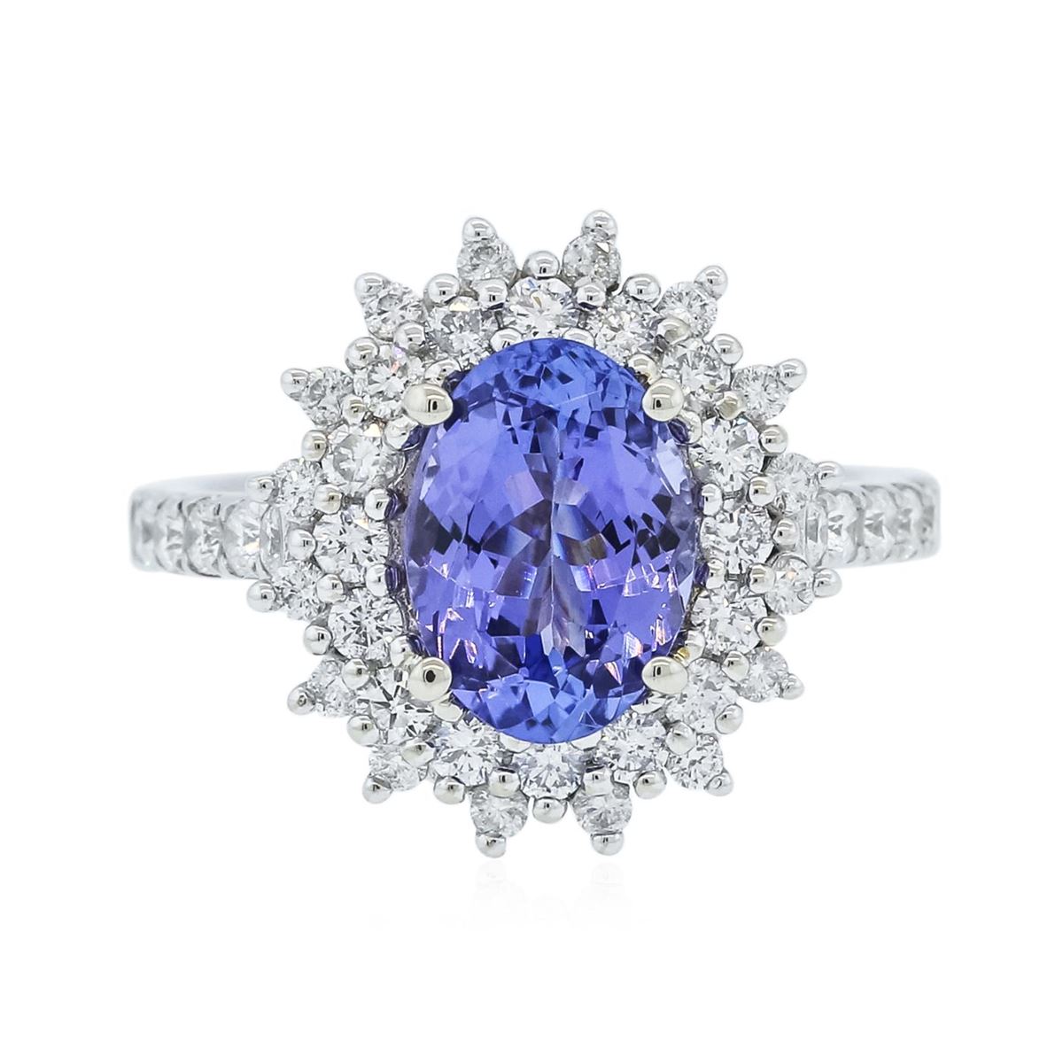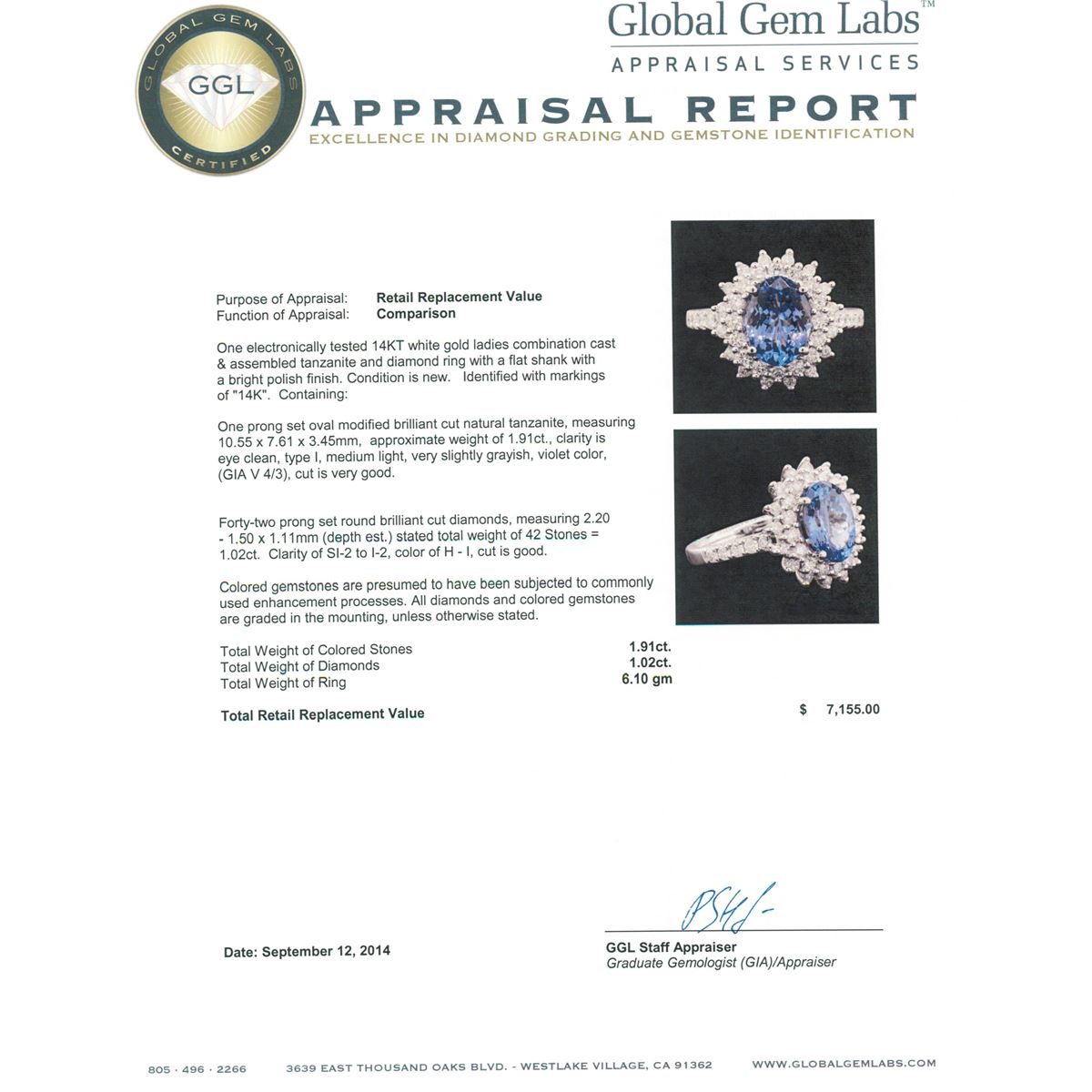 One electronically tested 14KT white gold ladies combination cast & assembled tanzanite and diamond ring with a flat shank with a bright polish finish. Identified with markings of "14K". Condition is new. Containing: One prong set oval modified brilliant cut natural tanzanite, measuring 10.55 x 7.61 x 3.45mm, approximate weight of 1.91ct., clarity is eye clean, type I, medium light, very slightly grayish, violet color, (GIA V 4/3), cut is very good. Forty-Two prong set round brilliant cut diamonds, measuring 2.20 - 1.50 x 1.11mm (depth est.) stated total weight of 42 Stones = 1.02ct. Clarity: SI-2 to I-2. Color: H - I, Cut is Good. Colored gemstones are presumed to have been subjected to commonly used enhancement processes. All diamonds and colored gemstones are graded in the mounting, unless otherwise stated total weight of Colored Stones 1.91ct. Total Weight of Diamonds 1.02ct. Total Weight of Ring 6.10 grams. GGL Appraised at $7,155.00.