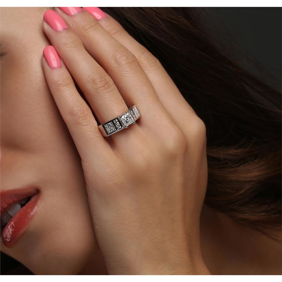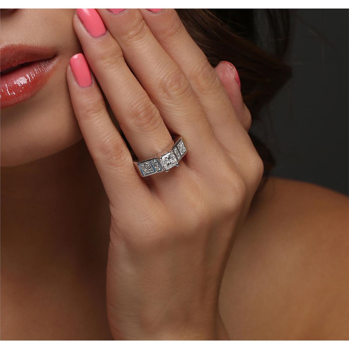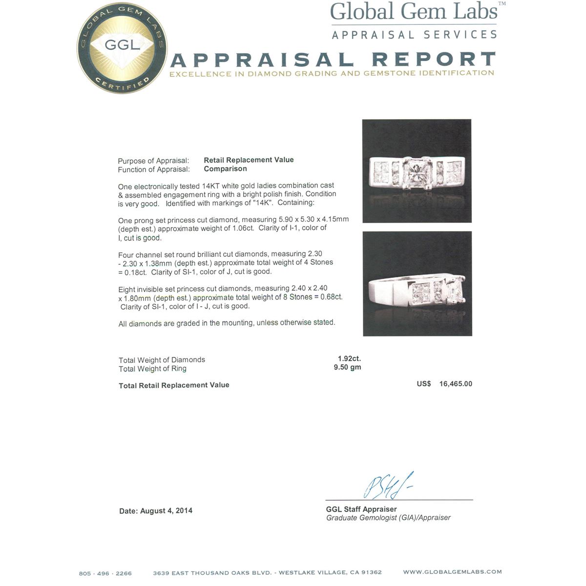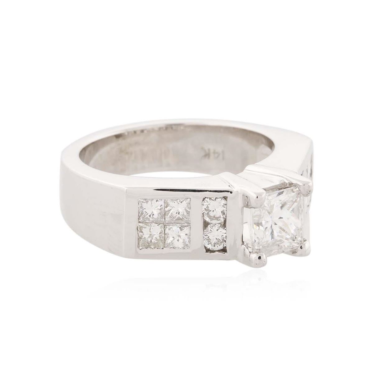 One electronically tested 14KT white gold ladies combination cast & assembled engagement ring with a bright polish finish. Condition is very good. Identified with markings of "14K". Containing: One prong set princess cut diamond, measuring 5.90 x 5.30 x 4.15mm (depth est.) approximate weight of 1.06ct. Clarity: I-1. Color: I, Cut is Good. Four channel set round brilliant cut diamonds, measuring 2.30 - 2.30 x 1.38mm (depth est.) approximate. Total Weight of 4 Stones = 0.18ct. Clarity: SI-1. Color: J, Cut is Good. Eight invisible set princess cut diamonds, measuring 2.40 x 2.40 x 1.80mm (depth est.) approximate. Total Weight of 8 Stones = 0.68ct. Clarity: SI-1. Color: I - J, Cut is Good. All diamonds are graded in the mounting, unless otherwise stated. Total Weight of Diamonds 1.92ct. Total Weight of Ring 9.50 grams. GGL Appraised at $16,465.00.