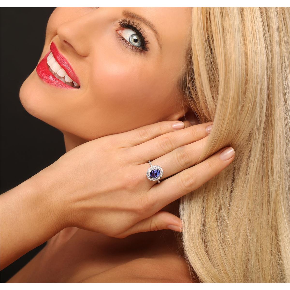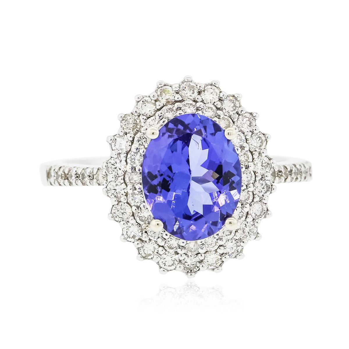 One electronically tested 14KT white gold ladies cast tanzanite and diamond ring with a bright polish finish. Condition is new, good workmanship. The featured tanzanite is set within a two tiered diamond bezel supported by diamond set shoulders, completed by a two millimeter wide band. Identified with markings of "585". Containing: One prong set oval brilliant cut natural tanzanite, measuring 9.35 x 7.10 x 4.00mm, 6%. bulge factor, approximate weight of 1.92ct., clarity is eye clean, type I, medium dark, very slightly grayish, violetish blue color, (GIA vB 6/3), cut is good. Transmitting light with no distortion, transparent. Graded in the setting. Tanzanite is a very rare gemstone that is only found in the country of Tanzania. Originally discovered in 1967. Tiffany & Company, named the stone Tanzanite. It is found in the Usumburu Mountains that border the Umba Valley of northern Tanzania. Tanzanite occurs in gray, brown, violet, blue, reddish-purple, & green. The gem is interesting because of its exceptional pleochroism. Rotated in different directions a tanzanite will exhibit multiple changes of color. Tanzanite has a low tolerance to ultrasonic cleaning, and should not be cleaned using this method. Fifty-Two prong set round brilliant cut diamonds, measuring 1.50 - 1.20 x 0.81mm (depth est.) approximate. Total Weight of 52 Stones = 0.56ct. Graded in the setting. Clarity: VS-2 to SI-2. Color: H - J. Total Weight of Colored Stones 1.92ct. Total Weight of Diamonds 0.56ct. Total Weight of Ring 4.51 grams. AIG Appraised at $6,700.00.