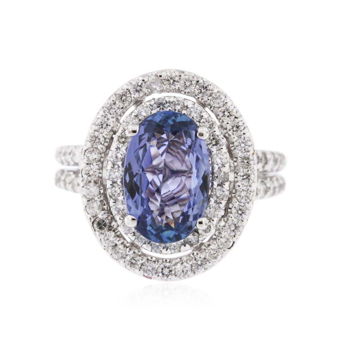 One electronically tested 14KT white gold ladies combination cast & assembled tanzanite and diamond ring with a bright polish finish. Identified with markings of "14K". Condition is new. Containing: One prong set oval modified brilliant cut natural tanzanite, measuring 11.00 x 7.20 x 3.45mm, approximate weight of 1.92ct., clarity is eye clean, type I, medium light, very slightly grayish, violet color, (GIA V 4/3), cut is good. Seventy-Nine prong set round brilliant cut diamonds, measuring 1.30 - 1.30 x 0.78mm (depth est.) approximate total weight of 79 Stones = 0.63ct. Clarity: SI-2 to I-1. Color: I - J, Cut is Good. Colored gemstones are presumed to have been subjected to commonly used enhancement processes. All diamonds and colored gemstones are graded in the mounting, unless otherwise stated. Total Weight of Colored Stones 1.92ct. Total Weight of Diamonds 0.63ct. Total Weight of Ring 7.00 grams. GGL Appraised at $4,920.00.