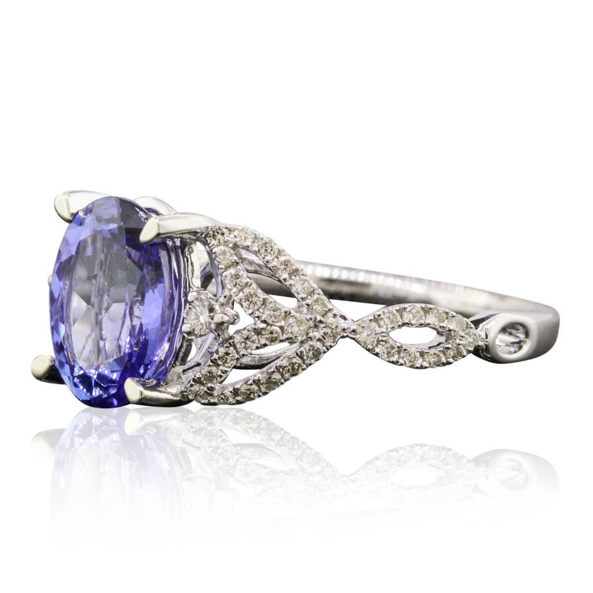 One electronically tested 14KT white gold ladies cast tanzanite and diamond ring with a bright polish finish. Condition is new, good workmanship. The featured tanzanite is supported by diamond set floral inspired shoulders, completed by a one and one-half millimeter wide band. Trademark is PMI. Identified with markings of "14K". Containing: One prong set oval mixed cut natural tanzanite, measuring 9.00 x 7.10 x 4.10mm, 8%. bulge factor, approximate weight of 1.92ct., clarity is eye clean, type I, medium dark, very slightly grayish, bluish violet color, (GIA bV 6/3), cut is good. Transmitting light with no distortion, transparent. Graded in the setting. Tanzanite is a very rare gemstone that is only found in the country of Tanzania. Originally discovered in 1967. Tiffany & Company, named the stone Tanzanite. It is found in the Usumburu Mountains that border the Umba Valley of northern Tanzania. Tanzanite occurs in gray, brown, violet, blue, reddish-purple, & green. The gem is interesting because of its exceptional pleochroism. Rotated in different directions a tanzanite will exhibit multiple changes of color. Tanzanite has a low tolerance to ultrasonic cleaning, and should not be cleaned using this method. Two prong set round brilliant cut diamonds, measuring 1.60 - 1.50 x 0.93mm (depth est.) approximate. Total Weight of 2 Stones = 0.05ct. The clarity & color grade reflect the overall average for the pair. Graded in the setting. Clarity: SI-1. Color: I Sixty-Four prong set round brilliant cut diamonds, measuring 1.20 - 1.00 x 0.66mm (depth est.) approximate. Total Weight of 64 Stones = 0.40ct. Graded in the setting. Clarity: SI-1 to I-1. Color: H - J. Total Weight of Colored Stones 1.92ct. Total Weight of Diamonds 0.45ct. Total Weight of Ring 2.78 grams. AIG Appraised at $5,880.00.