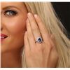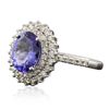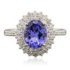 One electronically tested 14KT white gold ladies cast tanzanite and diamond ring with a bright polish finish. Condition is new, good workmanship. The featured tanzanite is set within a two tiered diamond bezel supported by diamond set shoulders, completed by a two millimeter wide band. Identified with markings of "585". Containing: One prong set oval brilliant cut natural tanzanite, measuring 9.35 x 7.10 x 4.00mm, 6%. bulge factor, approximate weight of 1.92ct., clarity is eye clean, type I, medium dark, very slightly grayish, violetish blue color, (GIA vB 6/3), cut is good. Transmitting light with no distortion, transparent. Graded in the setting. Tanzanite is a very rare gemstone that is only found in the country of Tanzania. Originally discovered in 1967. Tiffany & Company, named the stone Tanzanite. It is found in the Usumburu Mountains that border the Umba Valley of northern Tanzania. Tanzanite occurs in gray, brown, violet, blue, reddish-purple, & green. The gem is interesting because of its exceptional pleochroism. Rotated in different directions a tanzanite will exhibit multiple changes of color. Tanzanite has a low tolerance to ultrasonic cleaning, and should not be cleaned using this method. Fifty-Two prong set round brilliant cut diamonds, measuring 1.50 - 1.20 x 0.81mm (depth est.) approximate. Total Weight of 52 Stones = 0.56ct. Graded in the setting. Clarity: VS-2 to SI-2. Color: H - J. Total Weight of Colored Stones 1.92ct. Total Weight of Diamonds 0.56ct. Total Weight of Ring 4.51 grams. AIG Appraised at $6,700.00.