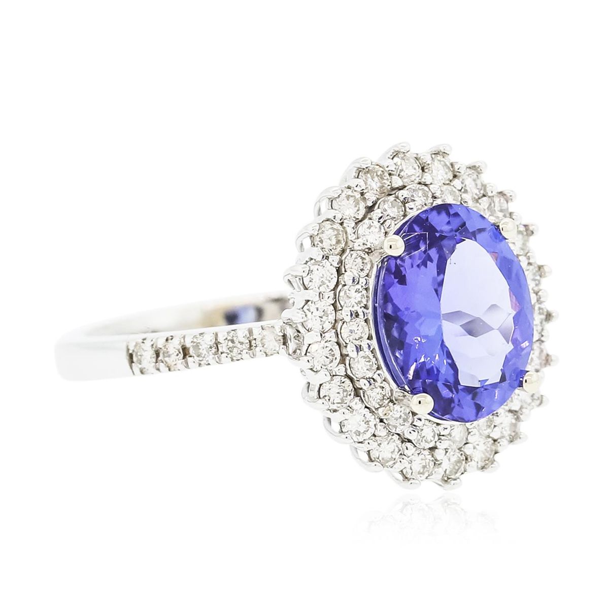 One electronically tested 14KT white gold ladies cast tanzanite and diamond ring with a bright polish finish. Condition is new, good workmanship. The featured tanzanite is set within a two tiered diamond bezel supported by diamond set shoulders, completed by a two millimeter wide band. Identified with markings of "585". Containing: One prong set oval brilliant cut natural tanzanite, measuring 9.35 x 7.10 x 4.00mm, 6%. bulge factor, approximate weight of 1.92ct., clarity is eye clean, type I, medium dark, very slightly grayish, violetish blue color, (GIA vB 6/3), cut is good. Transmitting light with no distortion, transparent. Graded in the setting. Tanzanite is a very rare gemstone that is only found in the country of Tanzania. Originally discovered in 1967. Tiffany & Company, named the stone Tanzanite. It is found in the Usumburu Mountains that border the Umba Valley of northern Tanzania. Tanzanite occurs in gray, brown, violet, blue, reddish-purple, & green. The gem is interesting because of its exceptional pleochroism. Rotated in different directions a tanzanite will exhibit multiple changes of color. Tanzanite has a low tolerance to ultrasonic cleaning, and should not be cleaned using this method. Fifty-Two prong set round brilliant cut diamonds, measuring 1.50 - 1.20 x 0.81mm (depth est.) approximate. Total Weight of 52 Stones = 0.56ct. Graded in the setting. Clarity: VS-2 to SI-2. Color: H - J. Total Weight of Colored Stones 1.92ct. Total Weight of Diamonds 0.56ct. Total Weight of Ring 4.51 grams. AIG Appraised at $6,700.00.