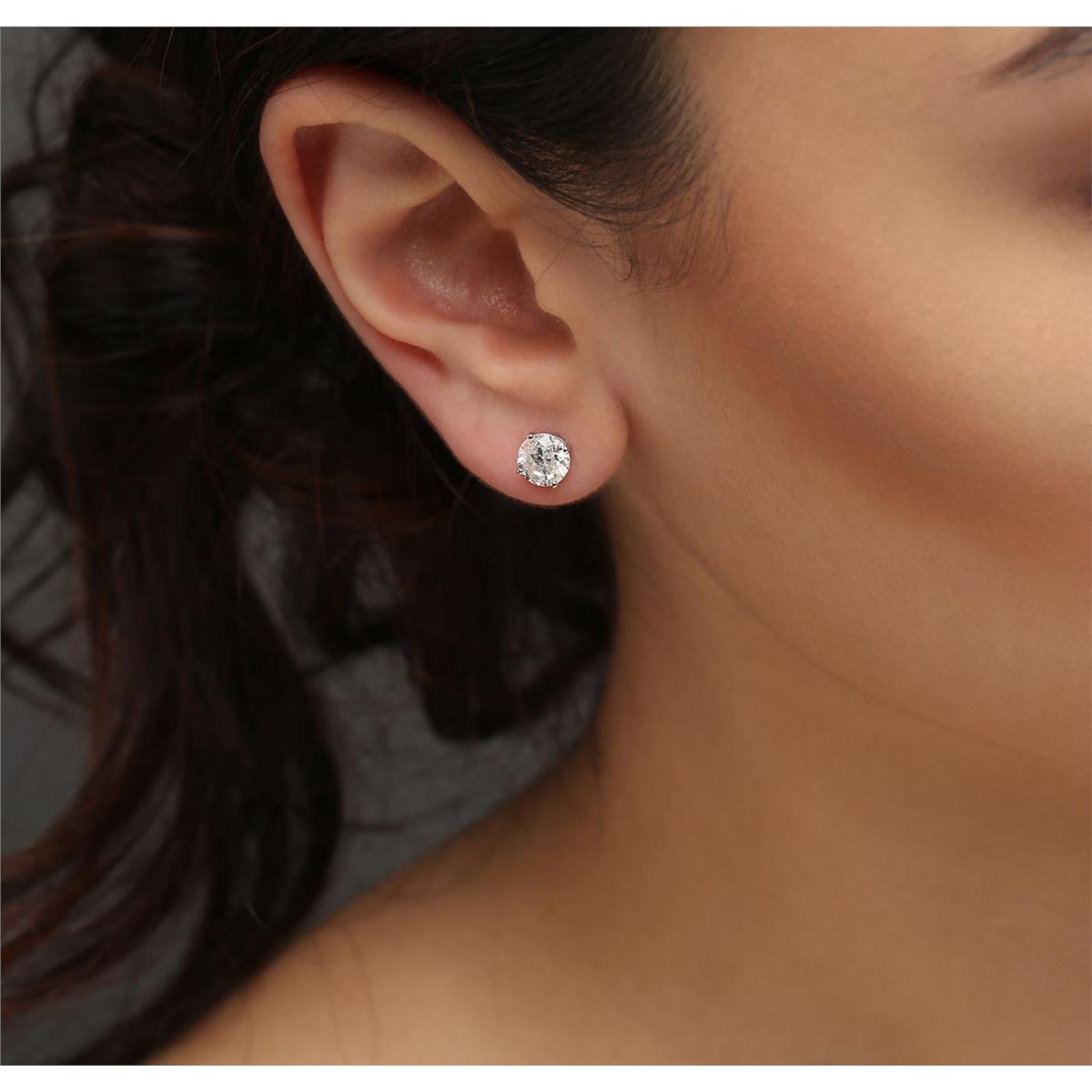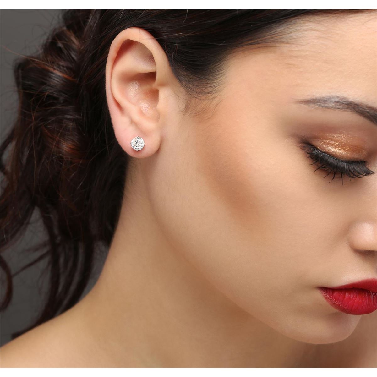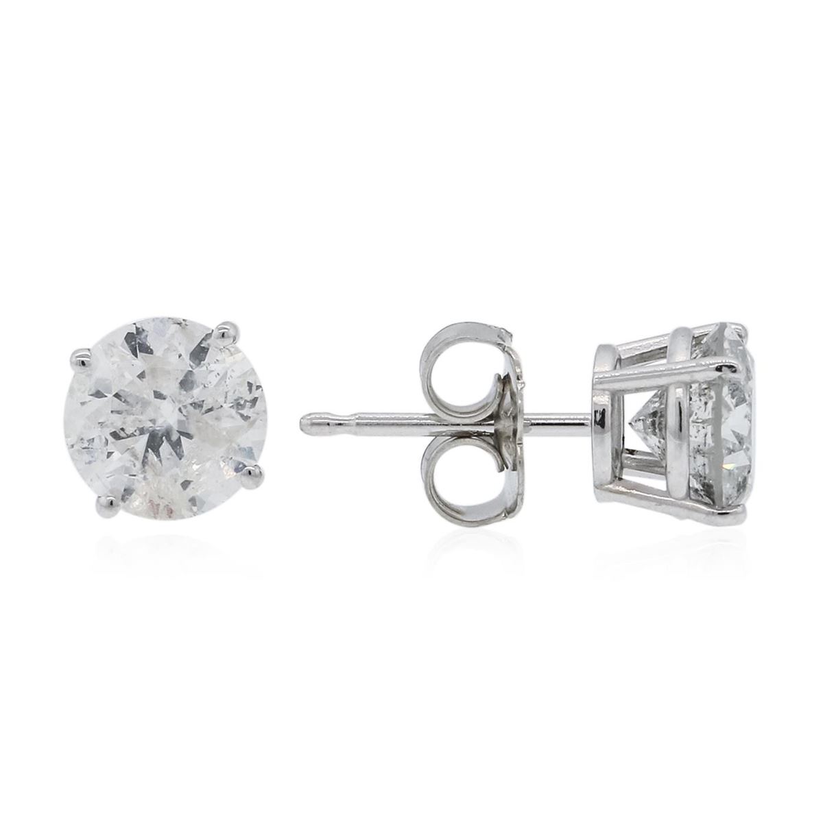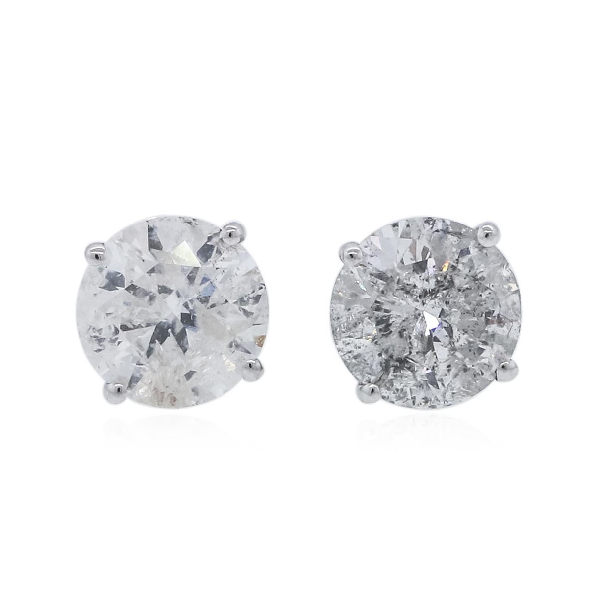 One pair electronically tested 14KT white gold ladies cast diamond stud earrings with friction posts with a bright polish finish. Identified with markings of "14K". Condition is new. Containing: One prong set round brilliant cut diamond, measuring 6.40 - 6.40 x 3.84mm (depth est.) approximate weight of 0.96ct. Clarity: I-2. Color: J, Cut is Good. One prong set round brilliant cut diamond, measuring 6.40 - 6.40 x 3.84mm (depth est.) approximate weight of 0.96ct. Clarity: I-3. Color: J, Cut is Good. All diamonds are graded in the mounting, unless otherwise stated. Total Weight of Diamonds 1.92ct. Total Weight of Earrings 1.20 grams. GGL Appraised at $7,750.00.