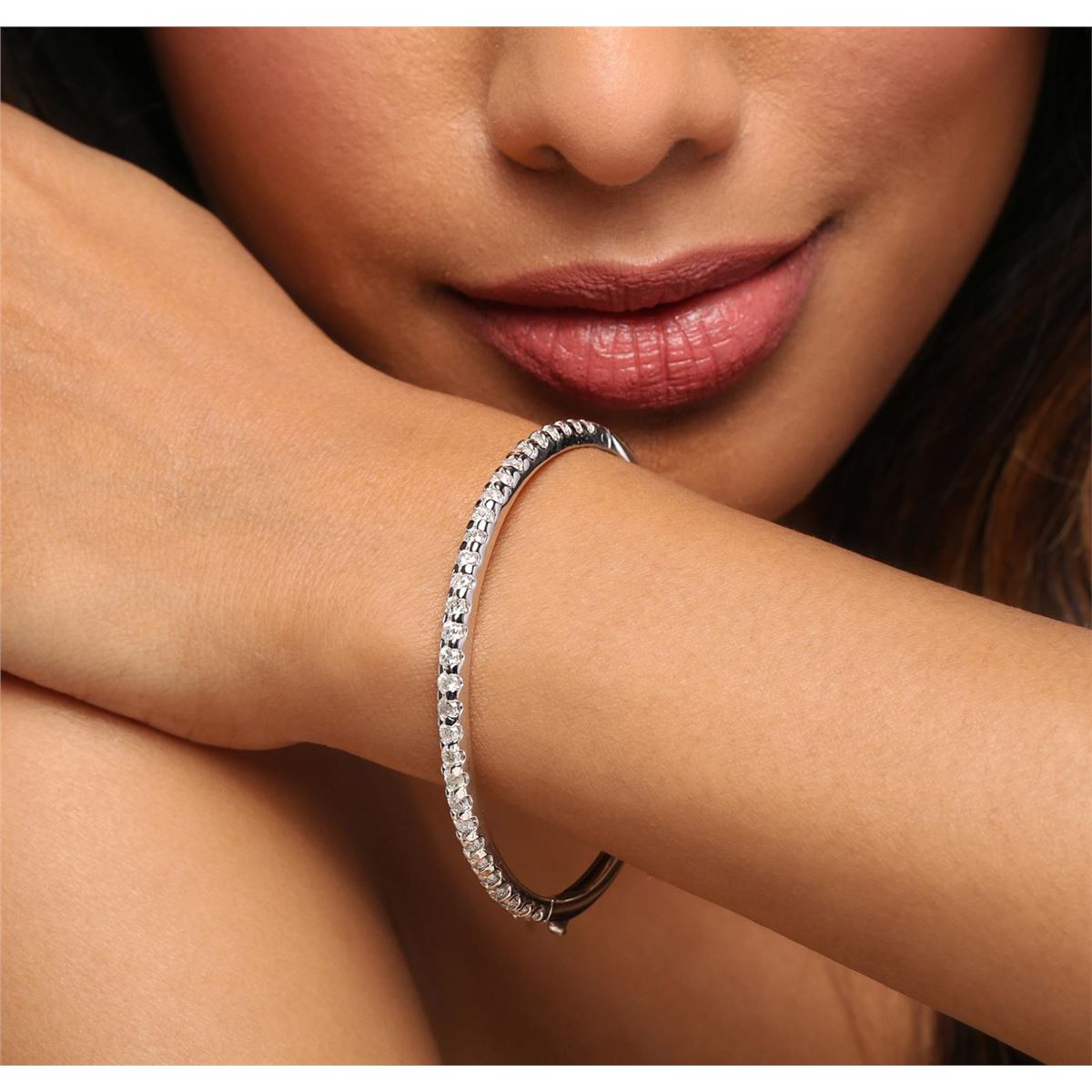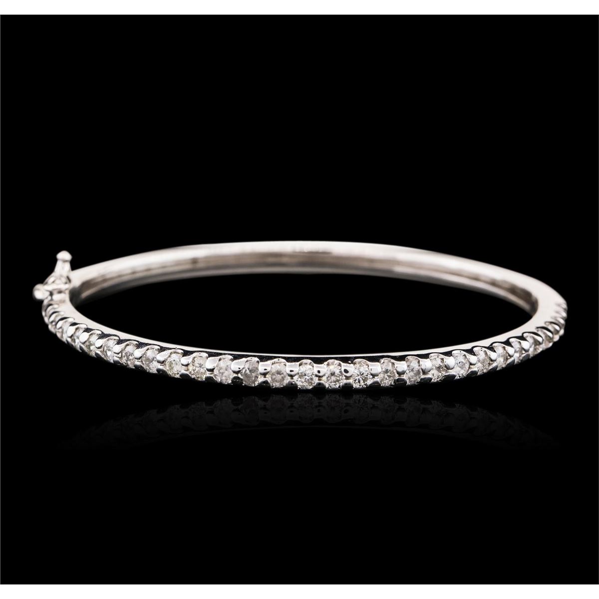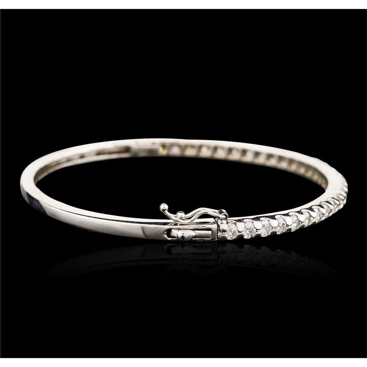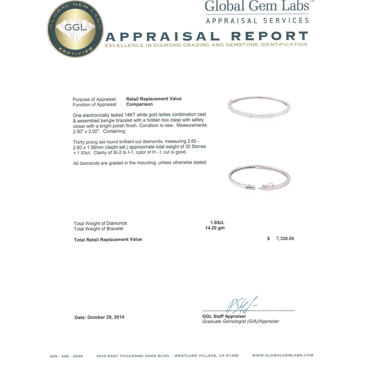 One electronically tested 14KT white gold ladies combination cast & assembled bangle bracelet with a hidden box clasp with safety closer with a bright polish finish. Measurements: 2.50 x 2.00. Condition is new. Containing: Thirty prong set round brilliant cut diamonds, measuring 2.60 - 2.60 x 1.56mm (depth est.) approximate total weight of 30 Stones = 1.93ct. Clarity: SI-2 to I-1. Color: H - I, Cut is Good. All diamonds are graded in the mounting, unless otherwise stated. Total Weight of Diamonds 1.93ct. Total Weight of Bracelet 14.20 grams. GGL Appraised at $7,330.00.