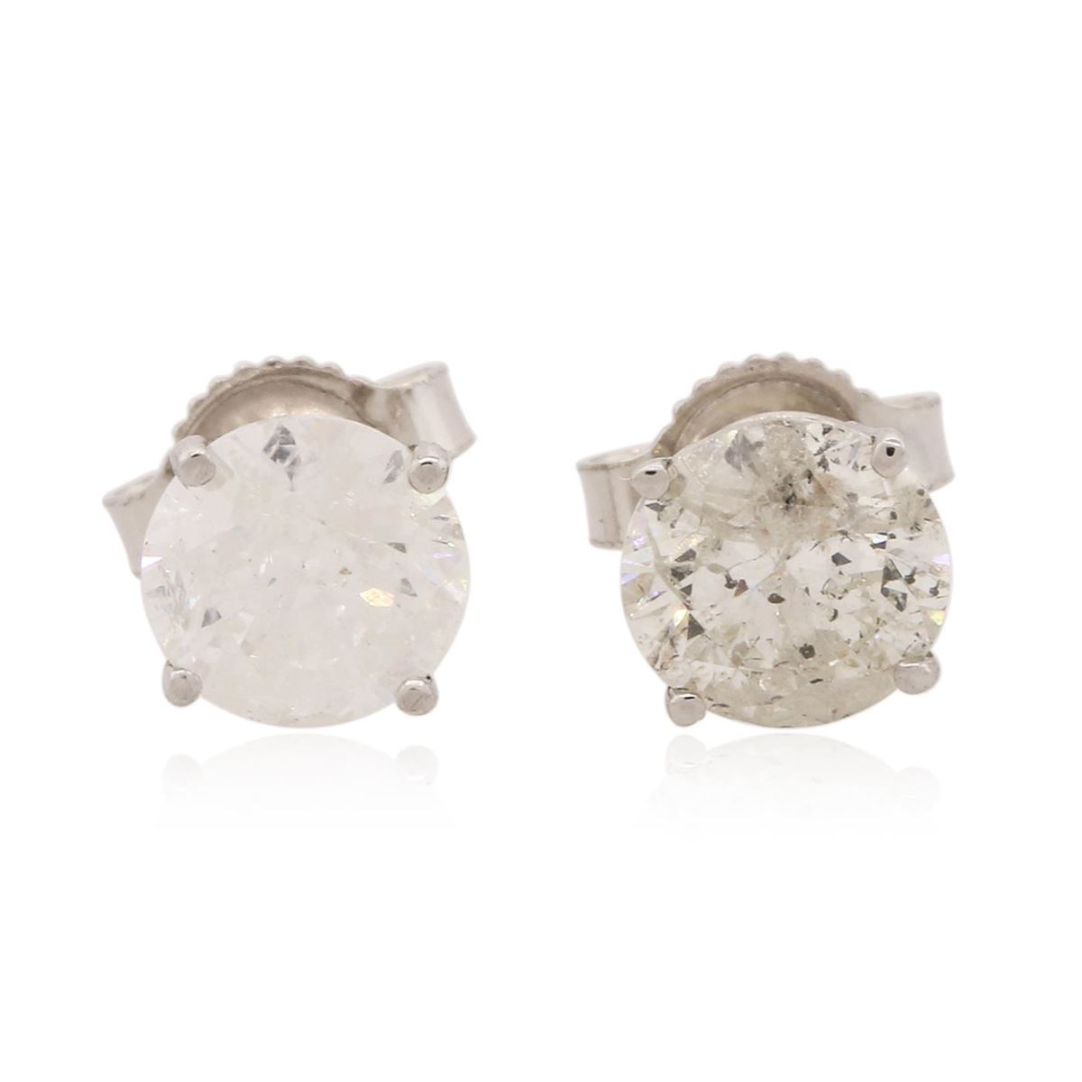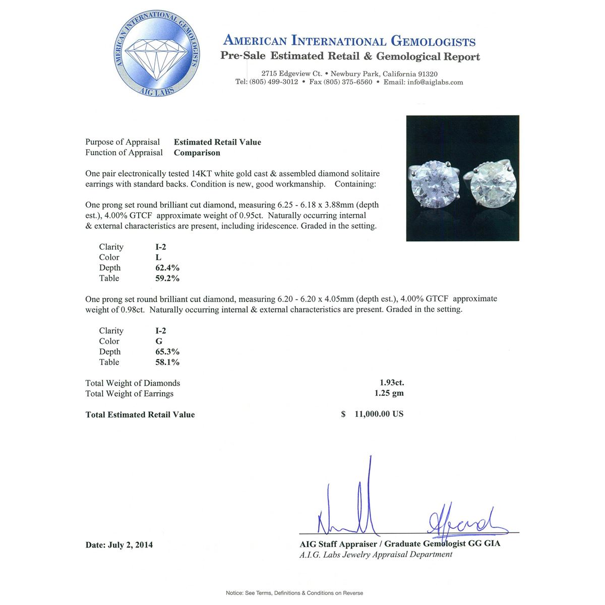 One pair electronically tested 14KT white gold cast & assembled diamond solitaire earrings with standard backs. Condition is new, good workmanship. Containing: One prong set round brilliant cut diamond, measuring 6.25-6.18x3.88mm (depth est) 4.00% GTCF approximate weight of 0.95ct. Naturally occurring internal and external characteristics are present. Graded in the setting. Clarity I-2 Color L Depth 62.40% Table 59.20%. One prong set round brilliant cut diamond, measuring 6.20-6.20x4.05mm (depth est) 4.00% GTCF approximate weight of 0.98ct. Naturally occurring internal and external characteristics are present. Graded in the setting. Clarity I-2 Color G Depth 65.30% Table 58.10%. Total weight of diamonds 1.93ct. Total weight of earrings 1.25 grams. AIG Appraised at $11,000.00.