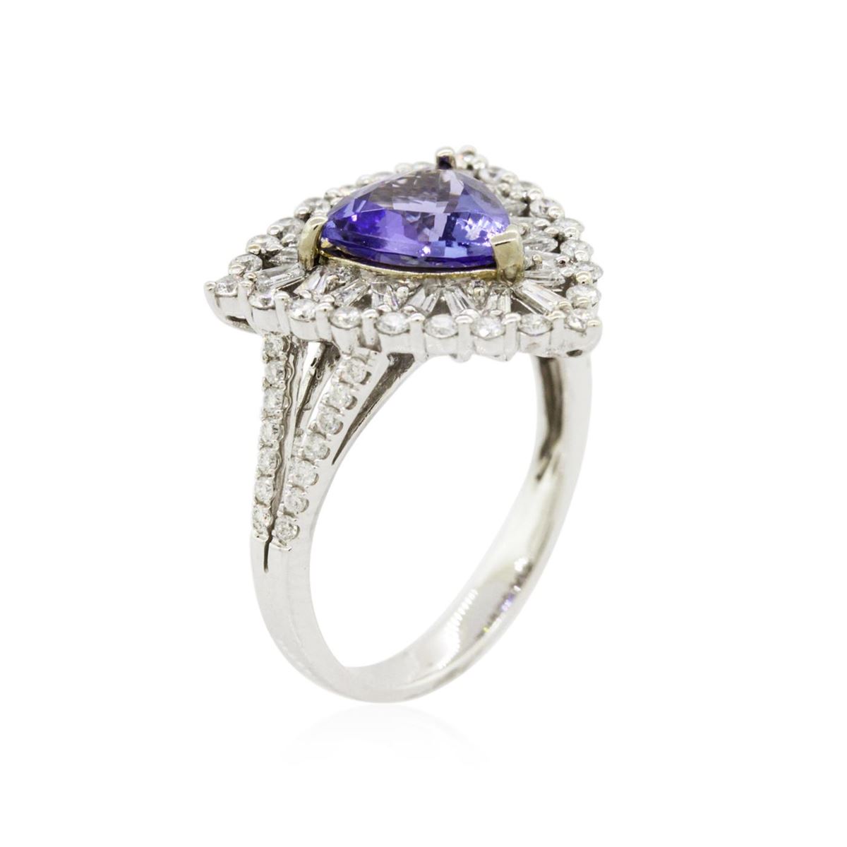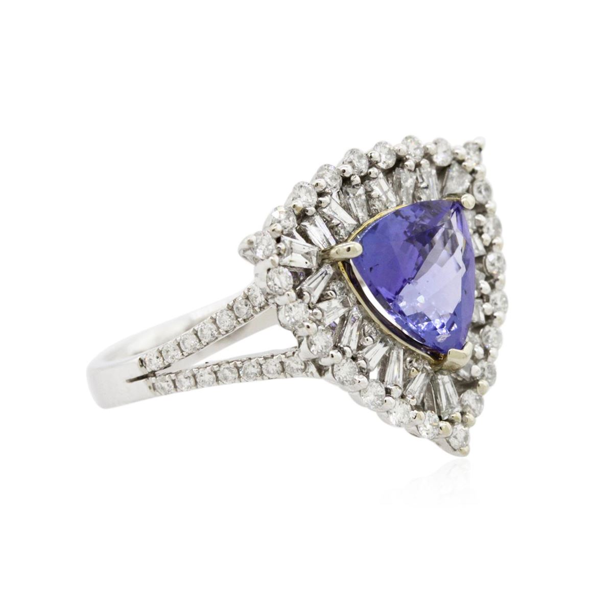One electronically tested 14KT white gold Ladies combination cast & assembled ring with a bright polish finish. Condition is new. Identified with markings of "14K". Containing: One prong set triangle modified brilliant cut natural tanzanite, measuring 8.00 x 8.00 x 4.99mm, approximate weight of 1.93ct., clarity is eye clean, type I, medium, moderately strong, violet color, (GIA V 5/4), cut is good. Colored gemstones are presumed to have been subjected to commonly used color/clarity enhancement processes. Fifty-Nine prong set round brilliant cut diamonds, measuring 1.50 - 1.30 x 0.84mm (depth est.) approximate. Total Weight of 59 Stones = 0.59ct. Clarity: I-1 to I-2. Color: I - J, Cut is Good. Twenty-One prong set baguette cut diamonds, measuring 3.00 x 1.50 x 1.28mm (depth est.) approximate. Total Weight of 21 Stones = 1.00ct. Clarity: SI-2 to I-1. Color: H - I, Cut is Good. Total Weight of Colored Stones 1.93ct. Total Weight of Diamonds 1.59ct. Total Weight of Ring 4.60 grams. GGL Appraised at $7,365.00.