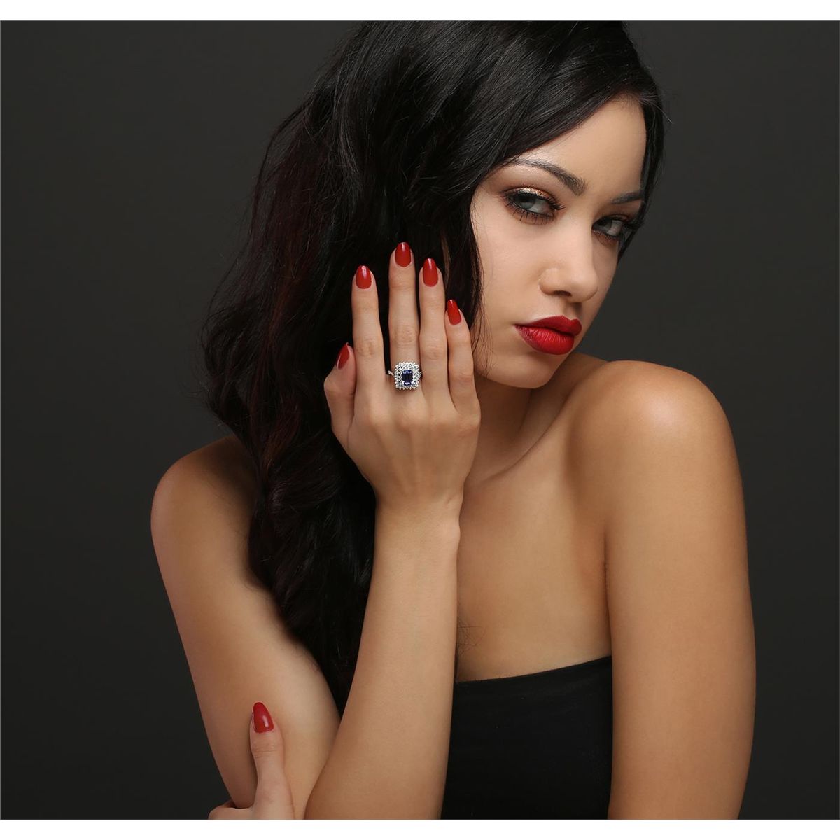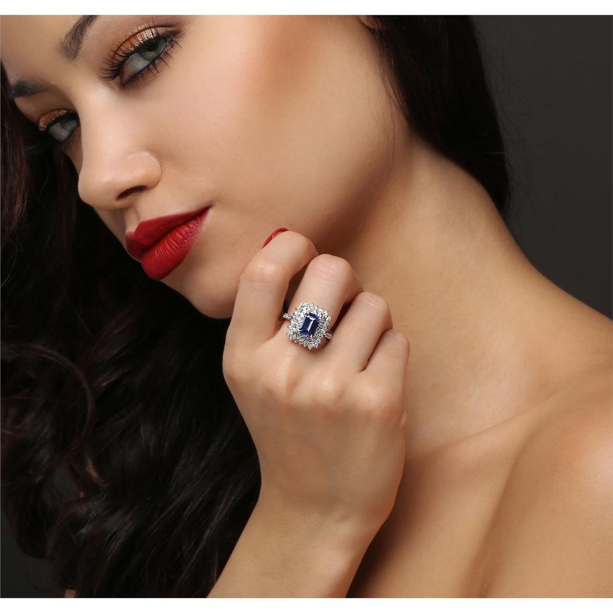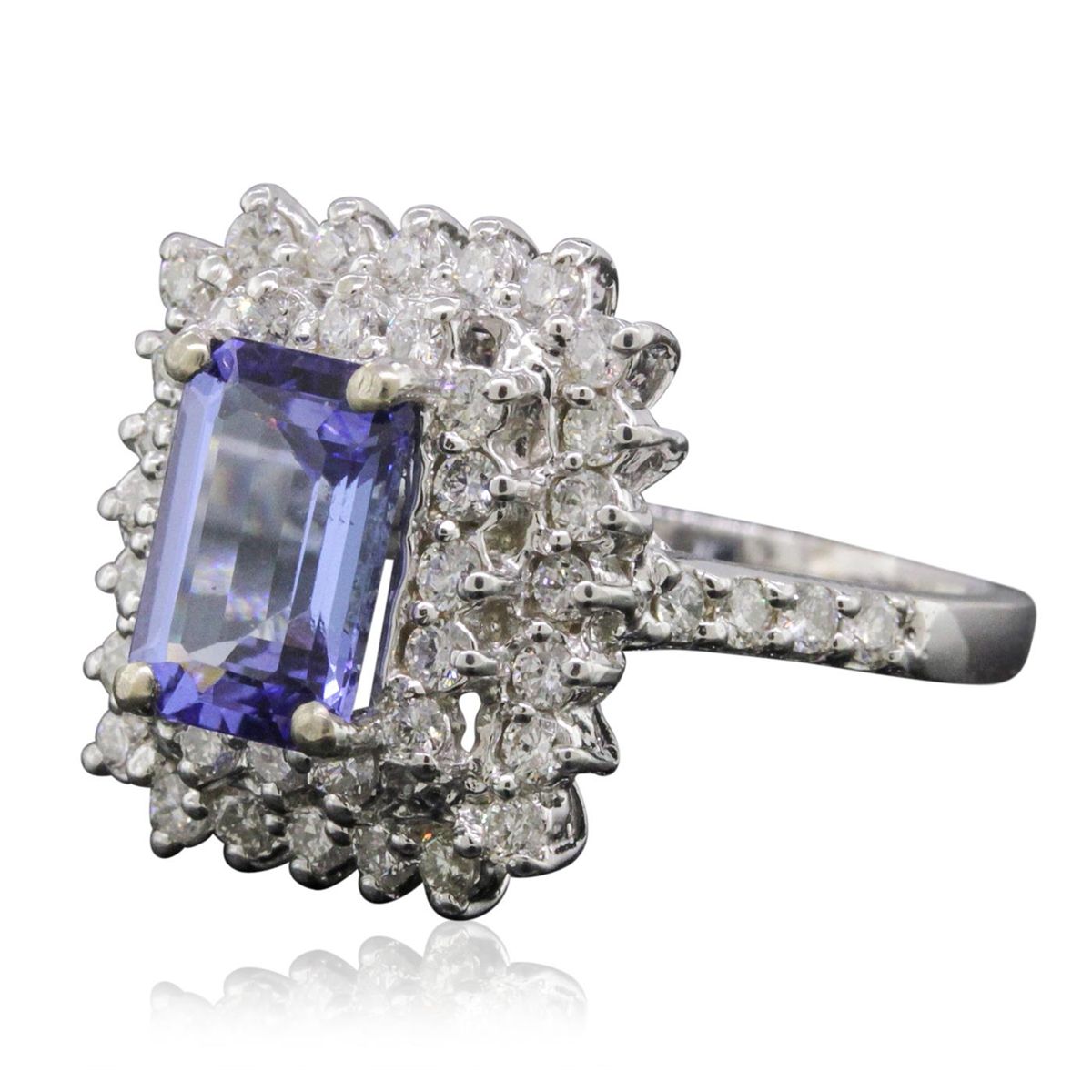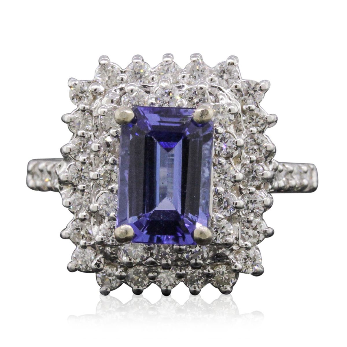 One electronically tested 14KT white gold ladies combination cast & assembled tanzanite and diamond ring with a flat shank with a bright polish finish. Identified with markings of "14K". Condition is new. Containing: One prong set emerald standard step cut natural tanzanite, measuring 9.12 x 6.13 x 3.82mm, approximate weight of 1.93ct., clarity is eye clean, type I, medium light, very slightly grayish, violet color, (GIA V 4/3), cut is good. Forty-Eight prong set round brilliant cut diamonds, measuring 1.60 - 1.60 x 0.96mm (depth est.) approximate total weight of 48 Stones = 0.72ct. Clarity: I-1 to I-2. Color: I - J, Cut is Good. Colored gemstones are presumed to have been subjected to commonly used enhancement processes. All diamonds and colored gemstones are graded in the mounting, unless otherwise stated. Total Weight of Colored Stones 1.93ct. Total Weight of Diamonds 0.72ct. Total Weight of Ring 6.00 grams. GGL Appraised at $5,990.00.