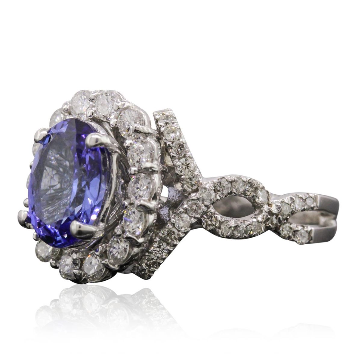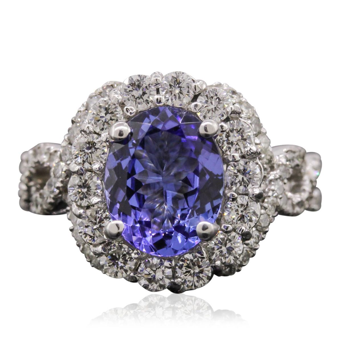 One electronically tested 14KT white gold Ladies combination cast & assembled ring with a bright polish finish. Condition is new. Identified with markings of "K14". Containing: One prong set oval modified brilliant cut natural tanzanite, measuring 9.50 x 7.80 x 3.84mm, approximate weight of 1.93ct., clarity is eye clean, type I, medium, moderately strong, bluish violet color, (GIA bV 5/4), cut is good. Colored gemstones are presumed to have been subjected to commonly used color/clarity enhancement processes. Sixty-Five prong set round brilliant cut diamonds, measuring 1.30 - 1.30 x 0.78mm (depth est.) approximate. Total Weight of 65 Stones = 0.52ct. Clarity: I-1 to I-2. Color: I - J, Cut is Good. Fourteen prong set round brilliant cut diamonds, measuring 2.50 - 2.50 x 1.50mm (depth est.) approximate. Total Weight of 14 Stones = 0.80ct. Clarity: SI-2 to I-1. Color: I - J, Cut is Good. Total Weight of Colored Stones 1.93ct. Total Weight of Diamonds 1.32ct. Total Weight of Ring 7.00 grams. GGL Appraised at $8,555.00.