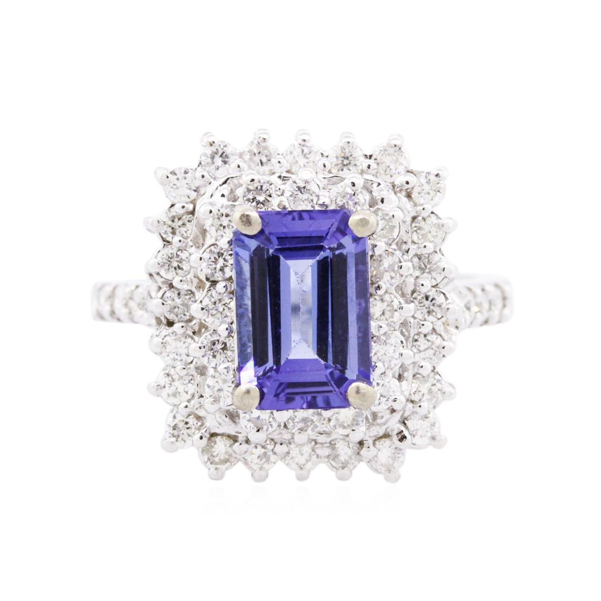 One electronically tested 14KT white gold ladies combination cast & assembled tanzanite and diamond ring with a flat shank with a bright polish finish. Identified with markings of "14K". Condition is new. Containing: One prong set emerald standard step cut natural tanzanite, measuring 9.12 x 6.13 x 3.82mm, approximate weight of 1.93ct., clarity is eye clean, type I, medium light, very slightly grayish, violet color, (GIA V 4/3), cut is good. Forty-Eight prong set round brilliant cut diamonds, measuring 1.60 - 1.60 x 0.96mm (depth est.) approximate total weight of 48 Stones = 0.72ct. Clarity: I-1 to I-2. Color: I - J, Cut is Good. Colored gemstones are presumed to have been subjected to commonly used enhancement processes. All diamonds and colored gemstones are graded in the mounting, unless otherwise stated. Total Weight of Colored Stones 1.93ct. Total Weight of Diamonds 0.72ct. Total Weight of Ring 6.00 grams. GGL Appraised at $5,990.00.