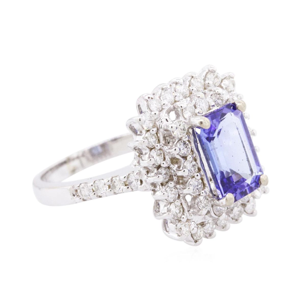 One electronically tested 14KT white gold ladies combination cast & assembled tanzanite and diamond ring with a flat shank with a bright polish finish. Identified with markings of "14K". Condition is new. Containing: One prong set emerald standard step cut natural tanzanite, measuring 9.12 x 6.13 x 3.82mm, approximate weight of 1.93ct., clarity is eye clean, type I, medium light, very slightly grayish, violet color, (GIA V 4/3), cut is good. Forty-Eight prong set round brilliant cut diamonds, measuring 1.60 - 1.60 x 0.96mm (depth est.) approximate total weight of 48 Stones = 0.72ct. Clarity: I-1 to I-2. Color: I - J, Cut is Good. Colored gemstones are presumed to have been subjected to commonly used enhancement processes. All diamonds and colored gemstones are graded in the mounting, unless otherwise stated. Total Weight of Colored Stones 1.93ct. Total Weight of Diamonds 0.72ct. Total Weight of Ring 6.00 grams. GGL Appraised at $5,990.00.