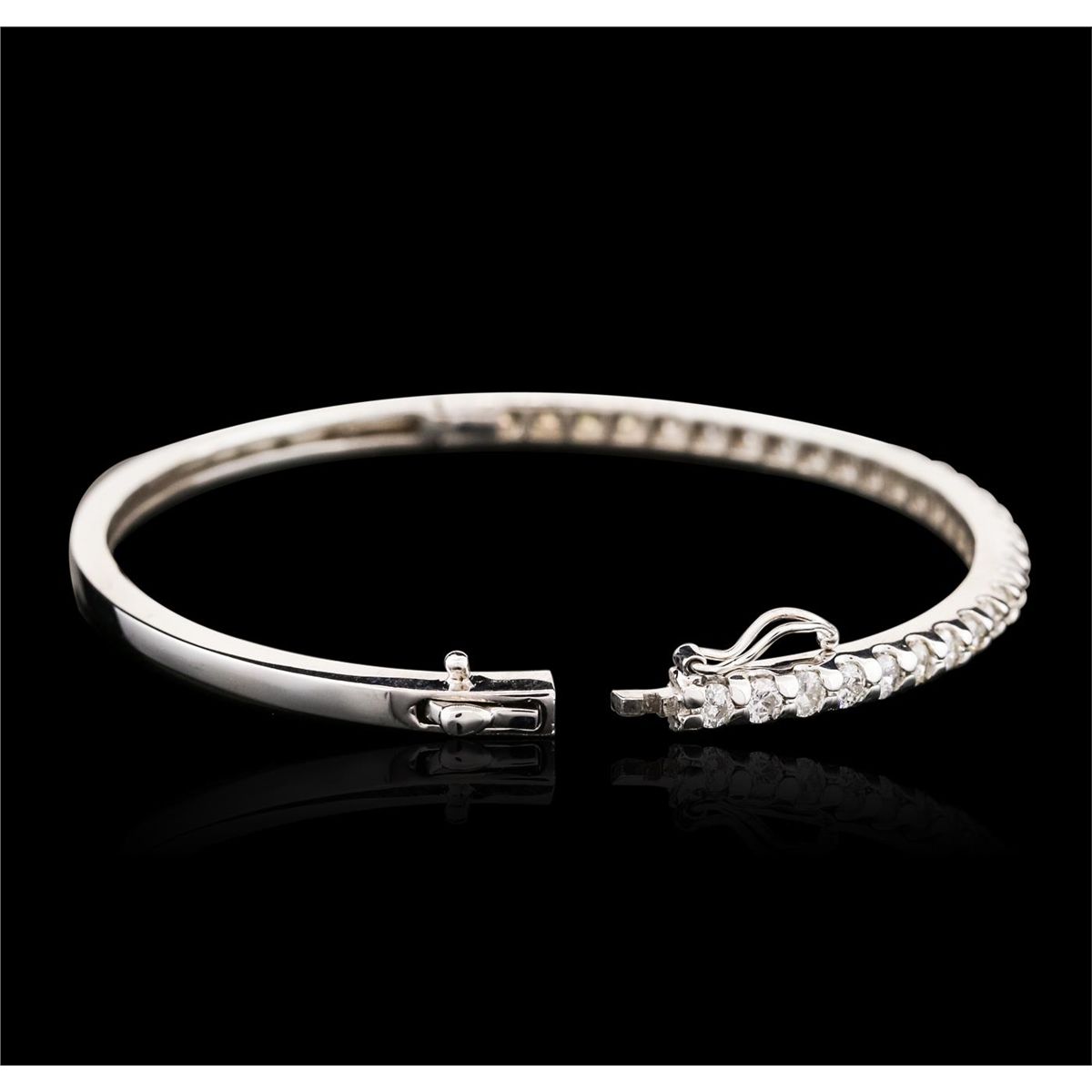 One electronically tested 14KT white gold ladies combination cast & assembled bangle bracelet with a hidden box clasp with safety closer with a bright polish finish. Measurements: 2.50 x 2.00. Condition is new. Containing: Thirty prong set round brilliant cut diamonds, measuring 2.60 - 2.60 x 1.56mm (depth est.) approximate total weight of 30 Stones = 1.93ct. Clarity: SI-2 to I-1. Color: H - I, Cut is Good. All diamonds are graded in the mounting, unless otherwise stated. Total Weight of Diamonds 1.93ct. Total Weight of Bracelet 14.20 grams. GGL Appraised at $7,330.00.
