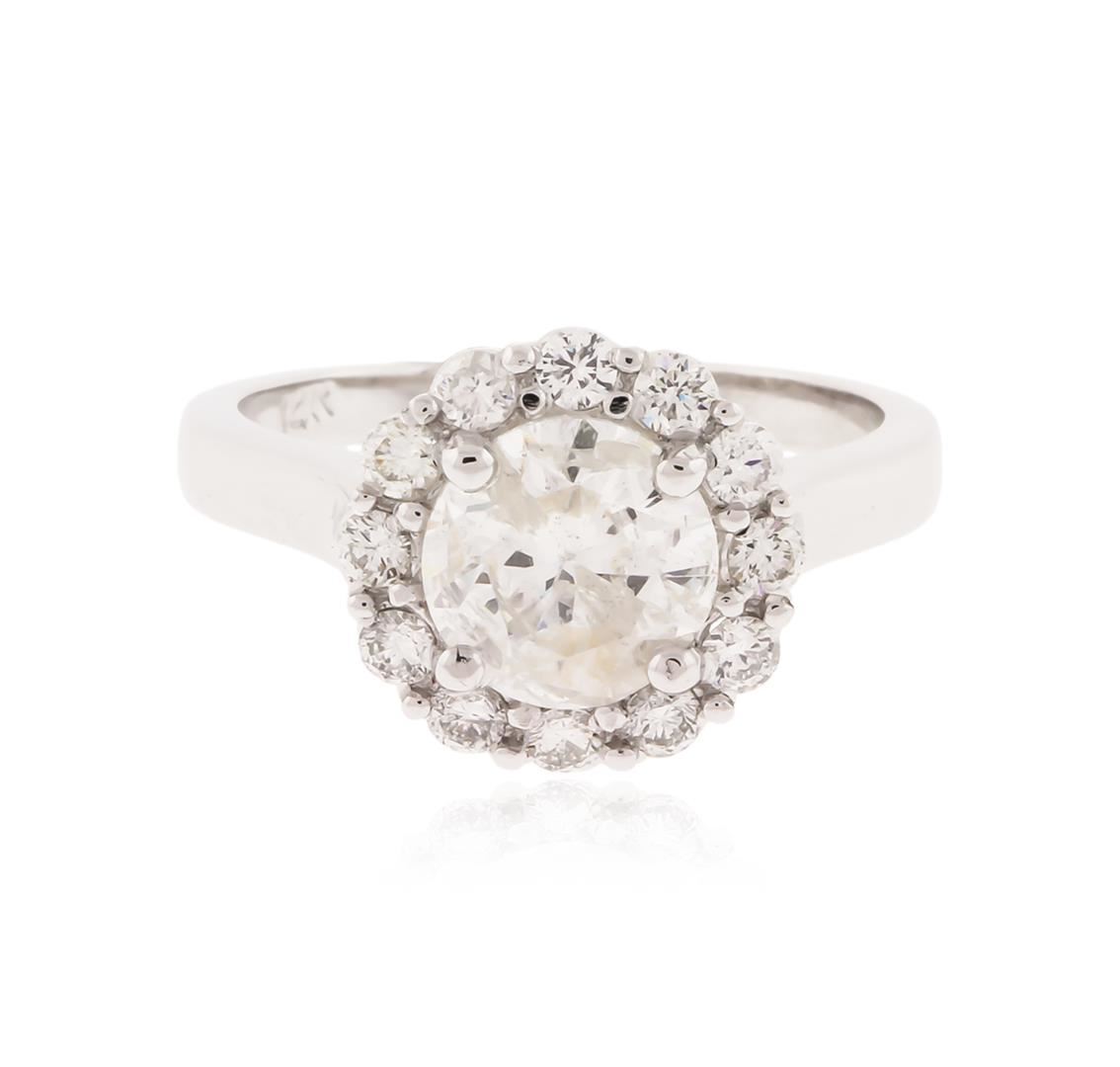 One electronically tested 14KT white gold ladies cast diamond unity ring with a bright polish finish. The featured diamond is set within a diamond bezel, completed by a two millimeter wide band. Identified with markings of "14K". Condition is new, good workmanship. Containing: One prong set round brilliant cut diamond, measuring 7.25 - 7.30 x 4.28mm (depth est.), 6.00.% GTCF approximate weight of 1.47ct with a medium strong blue fluorescence. Naturally occurring internal & external characteristics are present, including natural iridescence. Graded in the setting. Clarity: I-2. Color: I. Depth 58.8%. Table 61.8%. Twelve prong set round brilliant cut diamonds, measuring 2.10 - 2.00 x 1.23mm (depth est.) approximate total weight of 12 Stones = 0.47ct. Graded in the setting. Clarity: SI-1 to SI-2. Color: G - I. Total Weight of Diamonds 1.94ct. Total Weight of Ring 4.45 grams. AIG Appraised at $12,305.00.