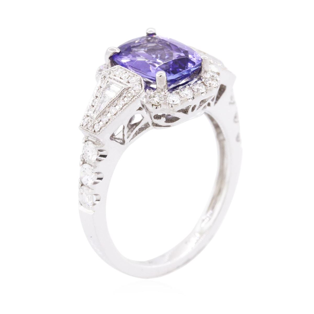 One electronically tested 14KT white gold ladies cast tanzanite & diamond ring with a bright finish. The featured tanzanite is set within a diamond bezel, supported by tapering diamond set shoulders, completed by a two millimeter wide band. Trademark is UCG. Identified with markings of "14K 585". Condition is good. Containing: One prong set rectangular cushion mixed cut natural tanzanite, measuring 8.80 x 6.80 x 4.00mm, 3% bulge factor, exact weight 1.94ct., clarity is eye clean, type I, medium dark, slightly grayish, bluish violet color, (GIA bV 6/2), cut is good. Transmitting light with no distortion, transparent. Graded in the setting. Tanzanite is a very rare gemstone that is only found in the country of Tanzania. Originally discovered in 1967. It is found in the Usumburu Mountains that border the Umba Valley of northern Tanzania. Tanzanite occurs in gray, brown, violet, blue, reddish-purple, & green. The gem is interesting because of its exceptional pleochroism. Rotated in different directions a tanzanite will exhibit multiple changes of color. Tanzanite has a low tolerance to ultrasonic cleaning, and should not be cleaned using this method. Four channel set baguette cut (tapered) diamonds, measuring from 2.30 x 1.30 x 0.88mm (depth est.) to 2.40 x 1.75 x 1.19mm (depth est.) approximate total weight of 4 Stones = 0.14ct. Graded in the setting. Clarity: VS-2 to SI-1. Color: G - H Eighteen prong set round brilliant cut diamonds, measuring 2.30 - 1.55 x 1.16mm (depth est.) approximate total weight of 18 Stones = 0.44ct. Graded in the setting. Clarity: SI-2 to I-1. Color: G - H Thirty-Two prong set round brilliant cut diamonds, measuring 0.90 - 0.80 x 0.51mm (depth est.) approximate total weight of 32 Stones = 0.08ct. Graded in the setting. Clarity: SI-2 to I-1. Color: G - I. Total Weight of Colored Stones 1.94ct. Total Weight of Diamonds 0.66ct. Total Weight of Ring 5.07 grams. AIG Appraised at $6,050.00.