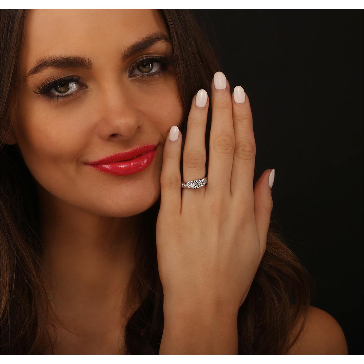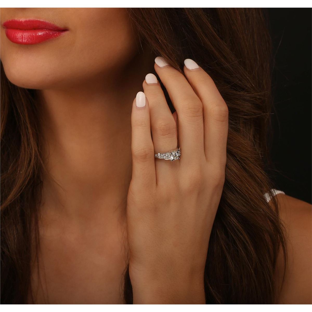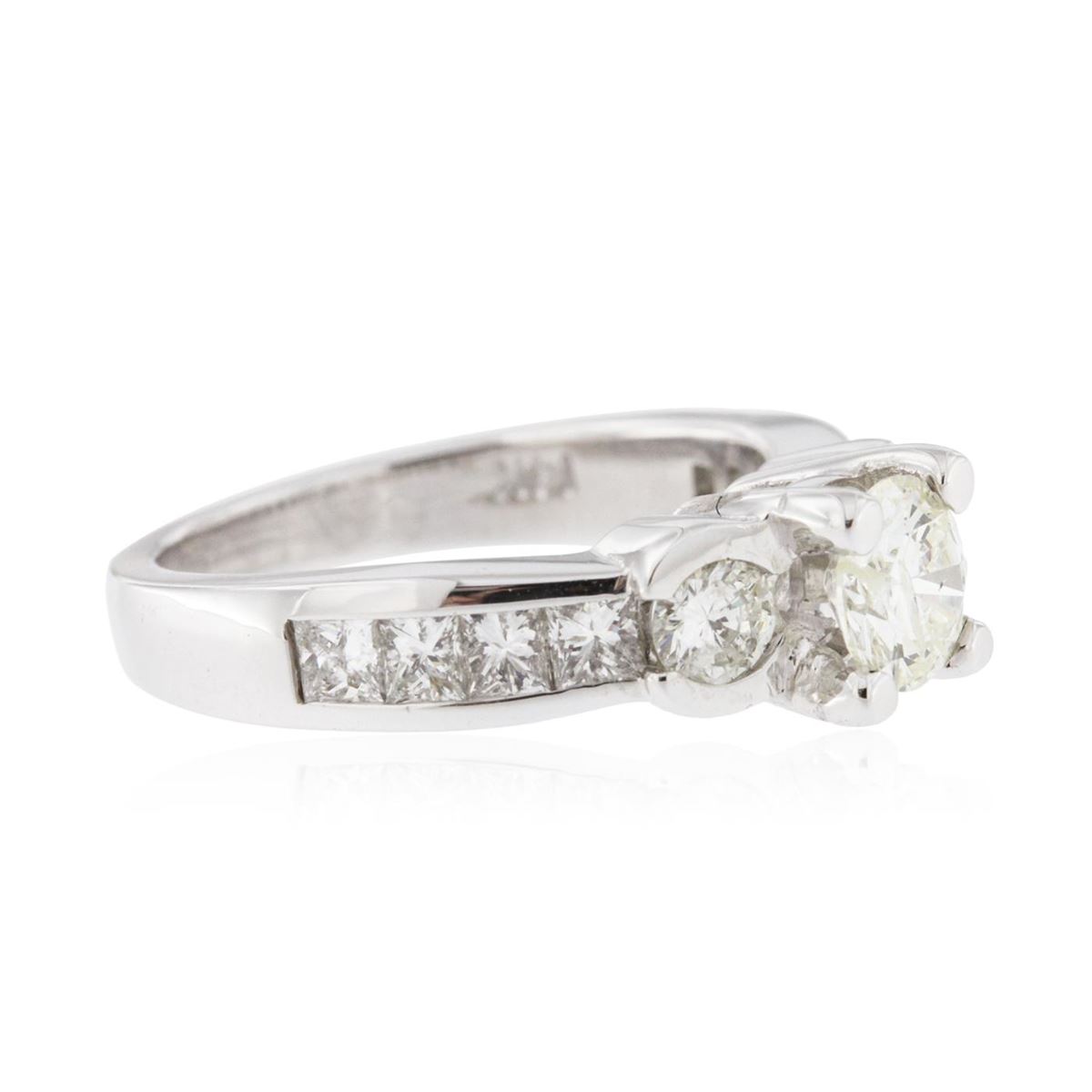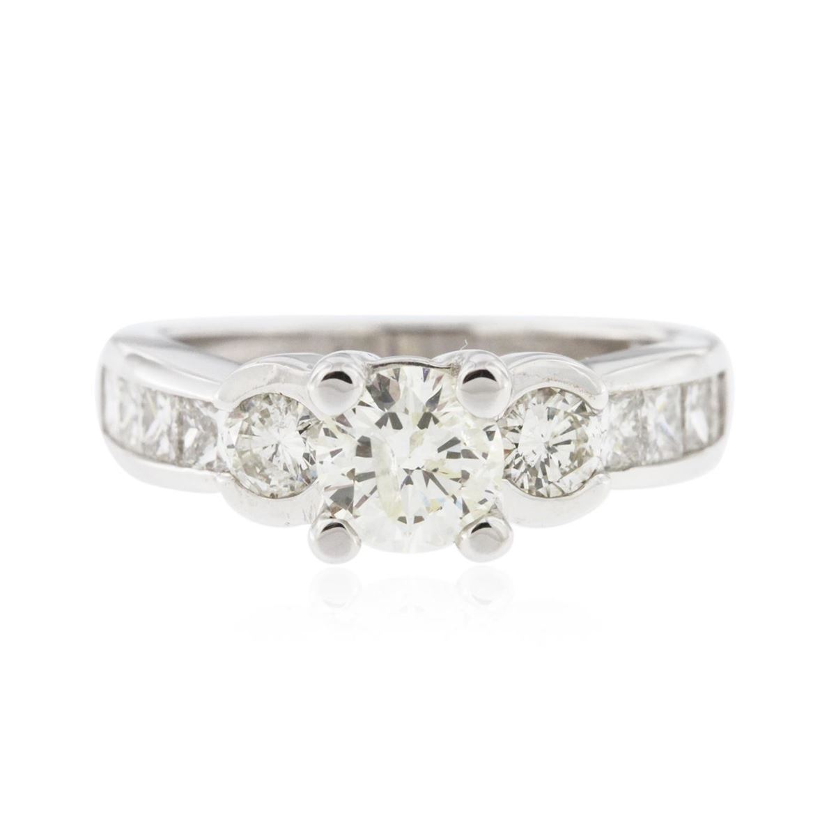 One electronically tested 14KT white gold ladies cast diamond unity ring with a bright polish finish. Condition is new, good workmanship. The featured diamond is supported by diamond set shoulders, completed by a two and one-half millimeter wide band. Identified with markings of "14K". Containing: One prong set round brilliant cut diamond, measuring 5.70 - 5.65 x 3.30mm (depth est.) approximate weight of 0.75ct. Graded in the setting. Clarity: I-1 . Color: 58.1%. Table 40.9%. Two bezel set round brilliant cut diamonds, measuring 3.80 - 3.70 x 2.25mm (depth est.) approximate. Total Weight of 2 Stones = 0.40ct. Graded in the setting. Clarity: SI-2 to I-1 . Color: I - J Eight channel set princess cut diamonds, measuring 2.50 x 2.40 x 1.80mm (depth est.) approximate. Total Weight of 8 Stones = 0.80ct. Graded in the setting. Clarity: VVS-2 to VS-2. Color: H - I. Total Weight of Diamonds 1.95ct.. Total Weight of Ring 5.53 grams. AIG Appraised at $9,380.00.