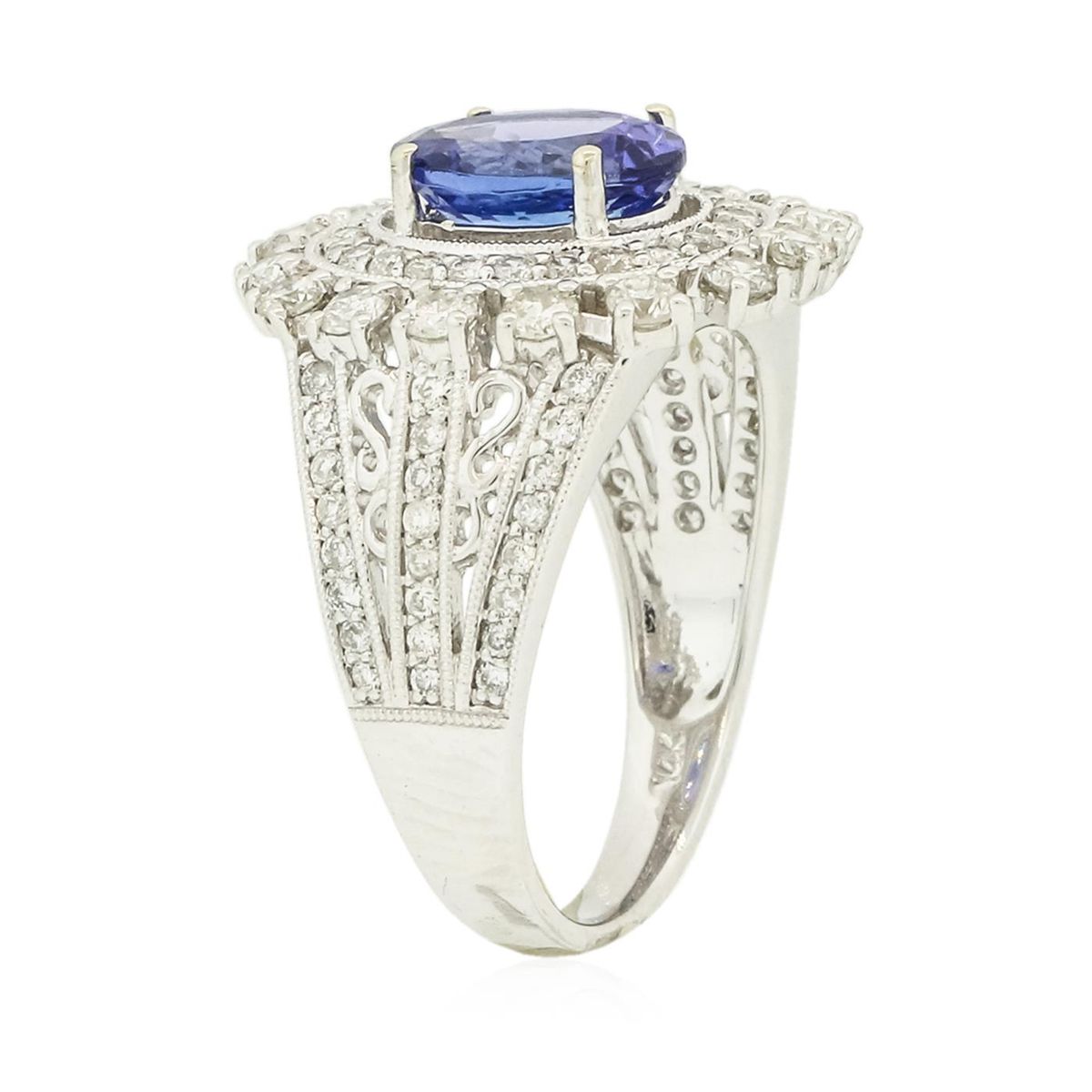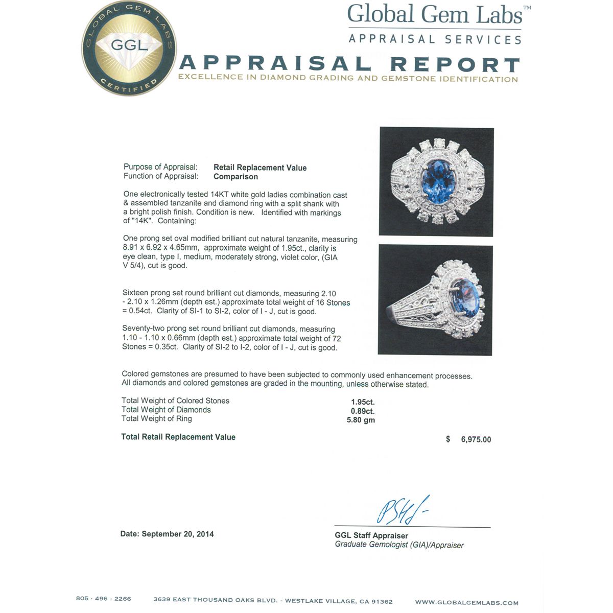 One electronically tested 14KT white gold ladies combination cast & assembled tanzanite and diamond ring with a split shank with a bright polish finish. Identified with markings of "14K". Condition is new. Containing: One prong set oval modified brilliant cut natural tanzanite, measuring 8.91 x 6.92 x 4.65mm, approximate weight of 1.95ct., clarity is eye clean, type I, medium, moderately strong, violet color, (GIA V 5/4), cut is good. Sixteen prong set round brilliant cut diamonds, measuring 2.10 - 2.10 x 1.26mm (depth est.) approximate total weight of 16 Stones = 0.54ct. Clarity: SI-1 to SI-2. Color: I - J, Cut is Good. Seventy-Two prong set round brilliant cut diamonds, measuring 1.10 - 1.10 x 0.66mm (depth est.) approximate total weight of 72 Stones = 0.35ct. Clarity: SI-2 to I-2. Color: I - J, Cut is Good. Colored gemstones are presumed to have been subjected to commonly used enhancement processes. All diamonds and colored gemstones are graded in the mounting, unless otherwise stated. Total Weight of Colored Stones 1.95ct. Total Weight of Diamonds 0.89ct. Total Weight of Ring 5.80 grams. GGL Appraised at $6,975.00.