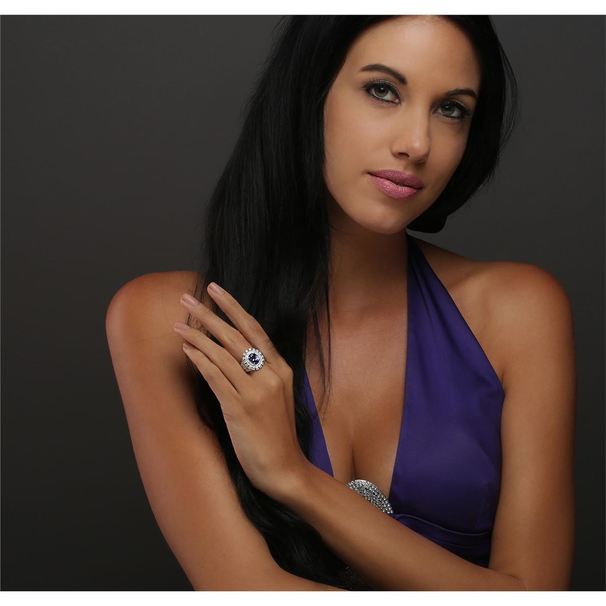 One electronically tested 14KT white gold ladies combination cast & assembled tanzanite and diamond ring with a split shank with a bright polish finish. Identified with markings of "14K". Condition is new. Containing: One prong set oval modified brilliant cut natural tanzanite, measuring 8.91 x 6.92 x 4.65mm, approximate weight of 1.95ct., clarity is eye clean, type I, medium, moderately strong, violet color, (GIA V 5/4), cut is good. Sixteen prong set round brilliant cut diamonds, measuring 2.10 - 2.10 x 1.26mm (depth est.) approximate total weight of 16 Stones = 0.54ct. Clarity: SI-1 to SI-2. Color: I - J, Cut is Good. Seventy-Two prong set round brilliant cut diamonds, measuring 1.10 - 1.10 x 0.66mm (depth est.) approximate total weight of 72 Stones = 0.35ct. Clarity: SI-2 to I-2. Color: I - J, Cut is Good. Colored gemstones are presumed to have been subjected to commonly used enhancement processes. All diamonds and colored gemstones are graded in the mounting, unless otherwise stated. Total Weight of Colored Stones 1.95ct. Total Weight of Diamonds 0.89ct. Total Weight of Ring 5.80 grams. GGL Appraised at $6,975.00.