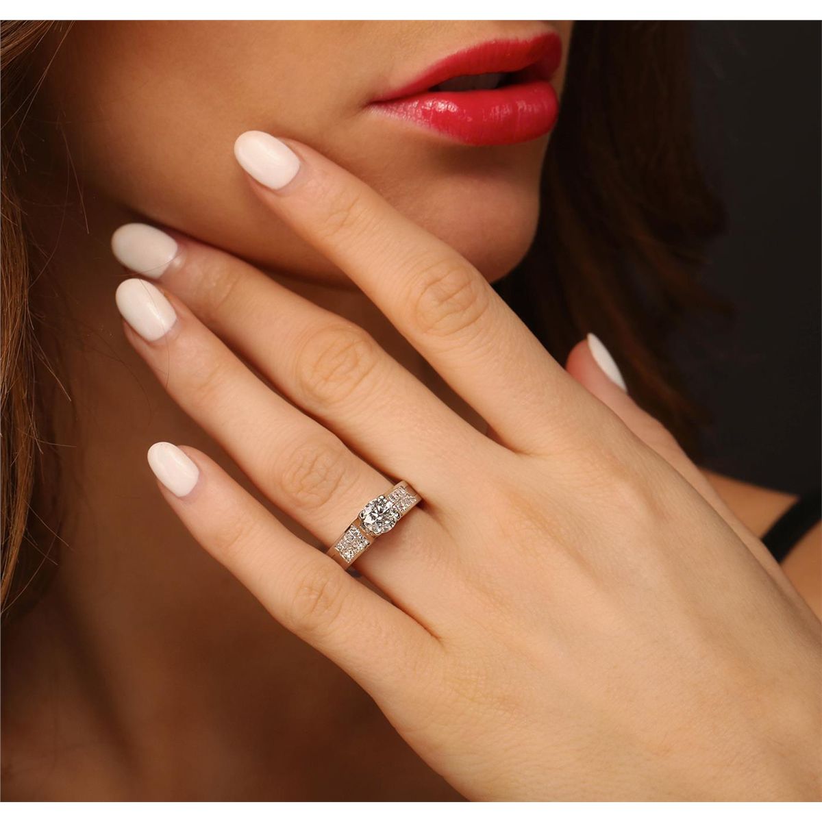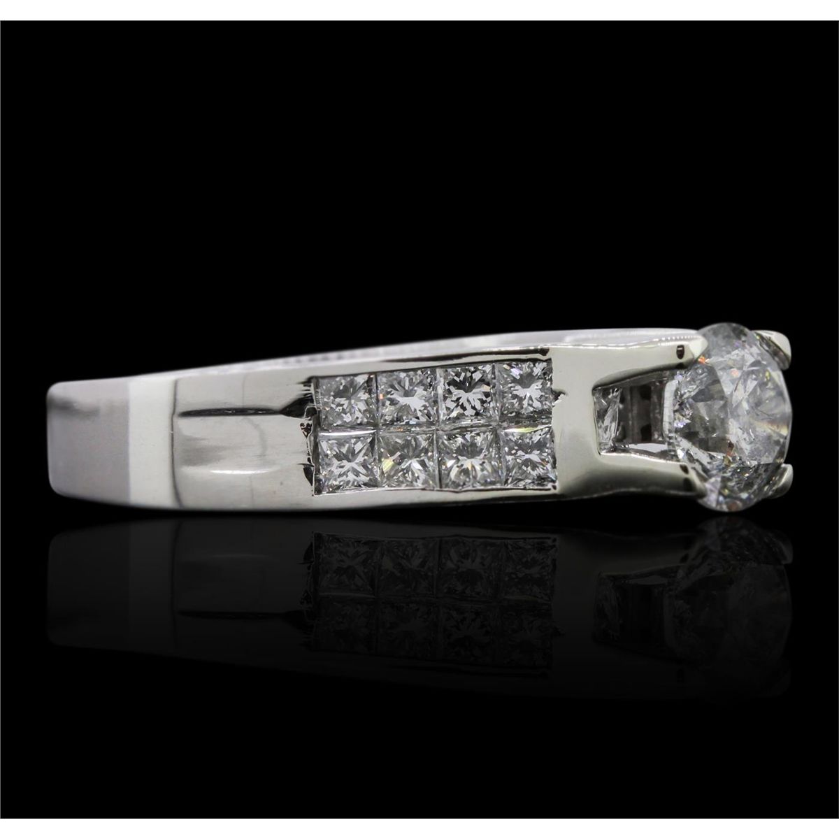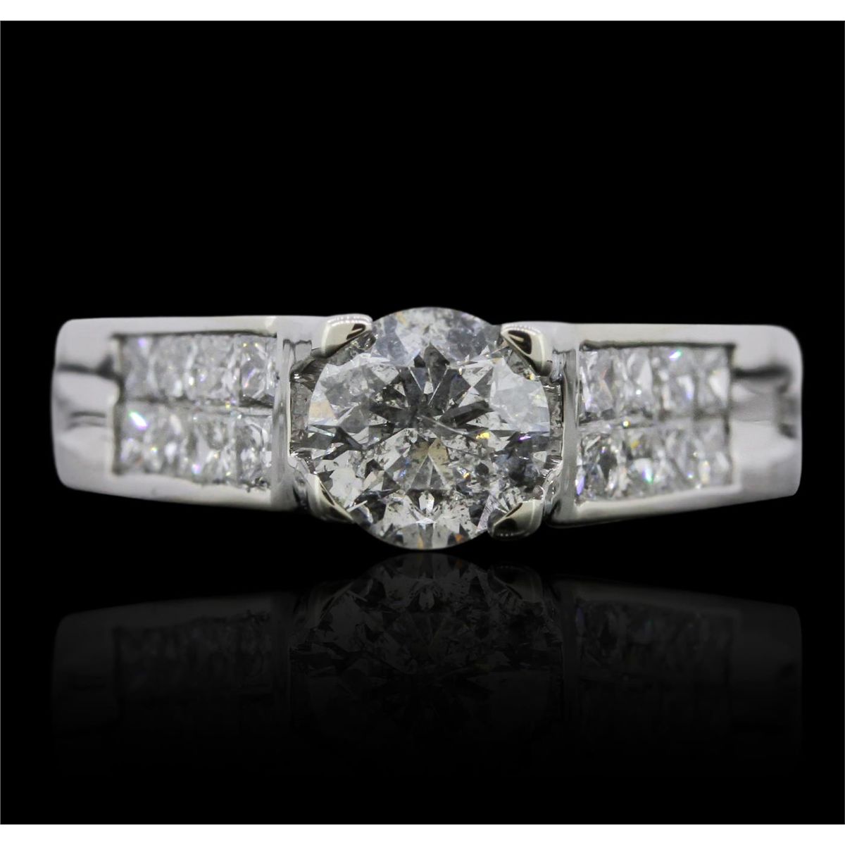 One electronically tested 14KT white gold ladies cast diamond unity ring with a bright polish finish. Condition is new, good workmanship. The featured diamond is cathedral set supported by diamond set shoulders, completed by a three millimeter wide band. Identified with markings of "14K". Containing: One prong set round brilliant cut diamond, measuring 6.05 - 6.00 x 4.05mm (depth est.), 4.05%. GTCF approximate weight of 1.03ct. Graded in the setting. Clarity: I-2. Color: I Depth 67.2%. Table 56.4%. Sixteen channel set princess cut diamonds, measuring 2.10 x 2.00 x 1.50mm (depth est.) approximate. Total Weight of 16 Stones = 0.92ct. Graded in the setting. Clarity: VS-1 to SI-1. Color: G - I. Total Weight of Diamonds 1.95ct. Total Weight of Ring 6.52 grams. AIG Appraised at $12,335.00.