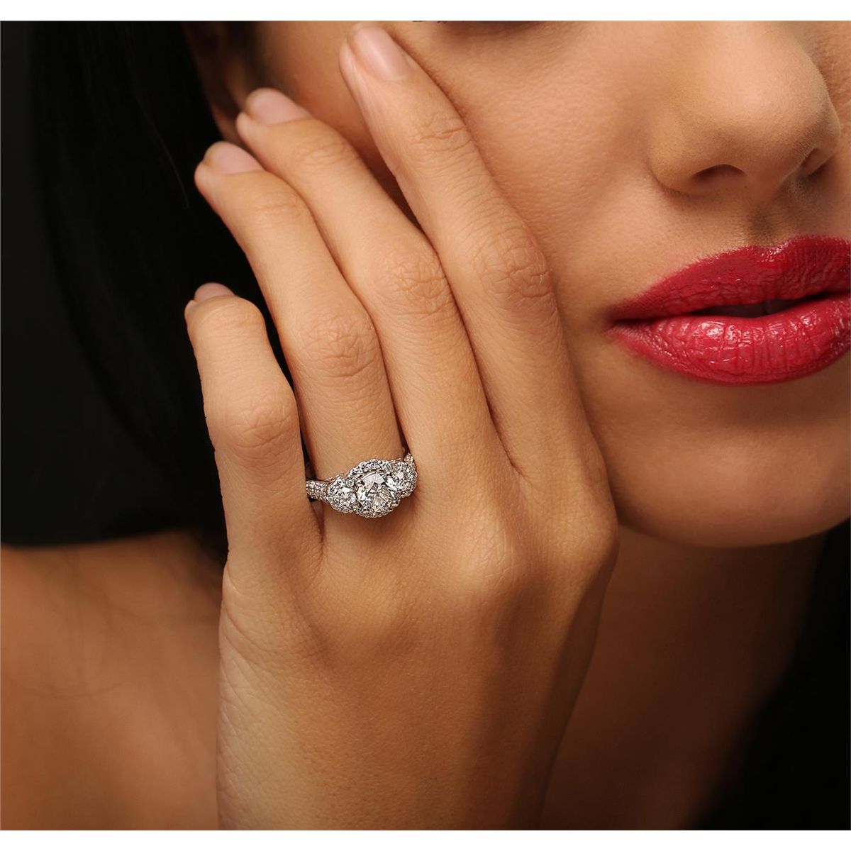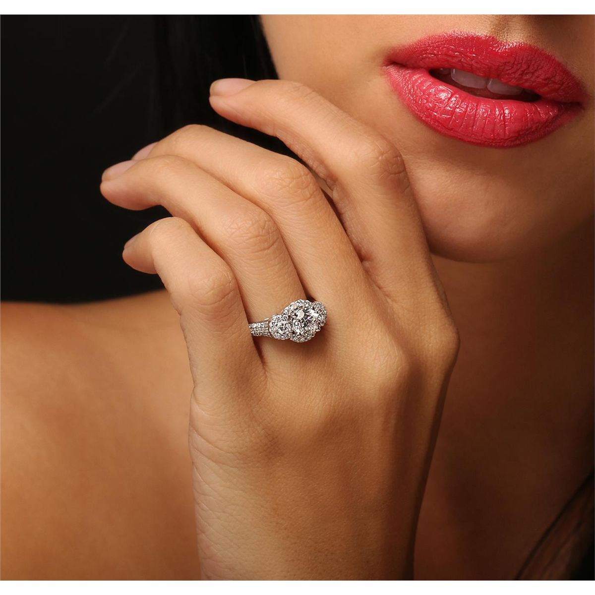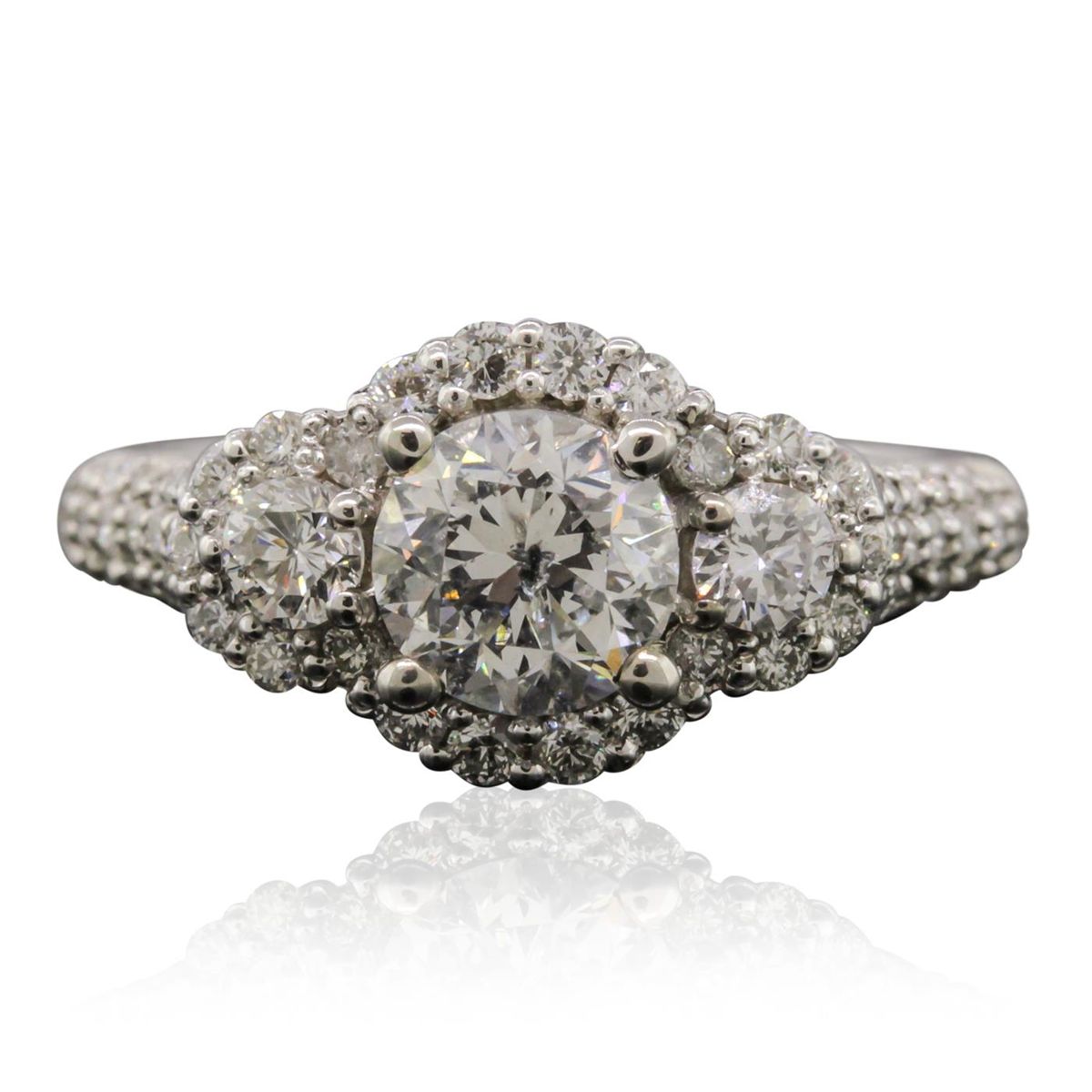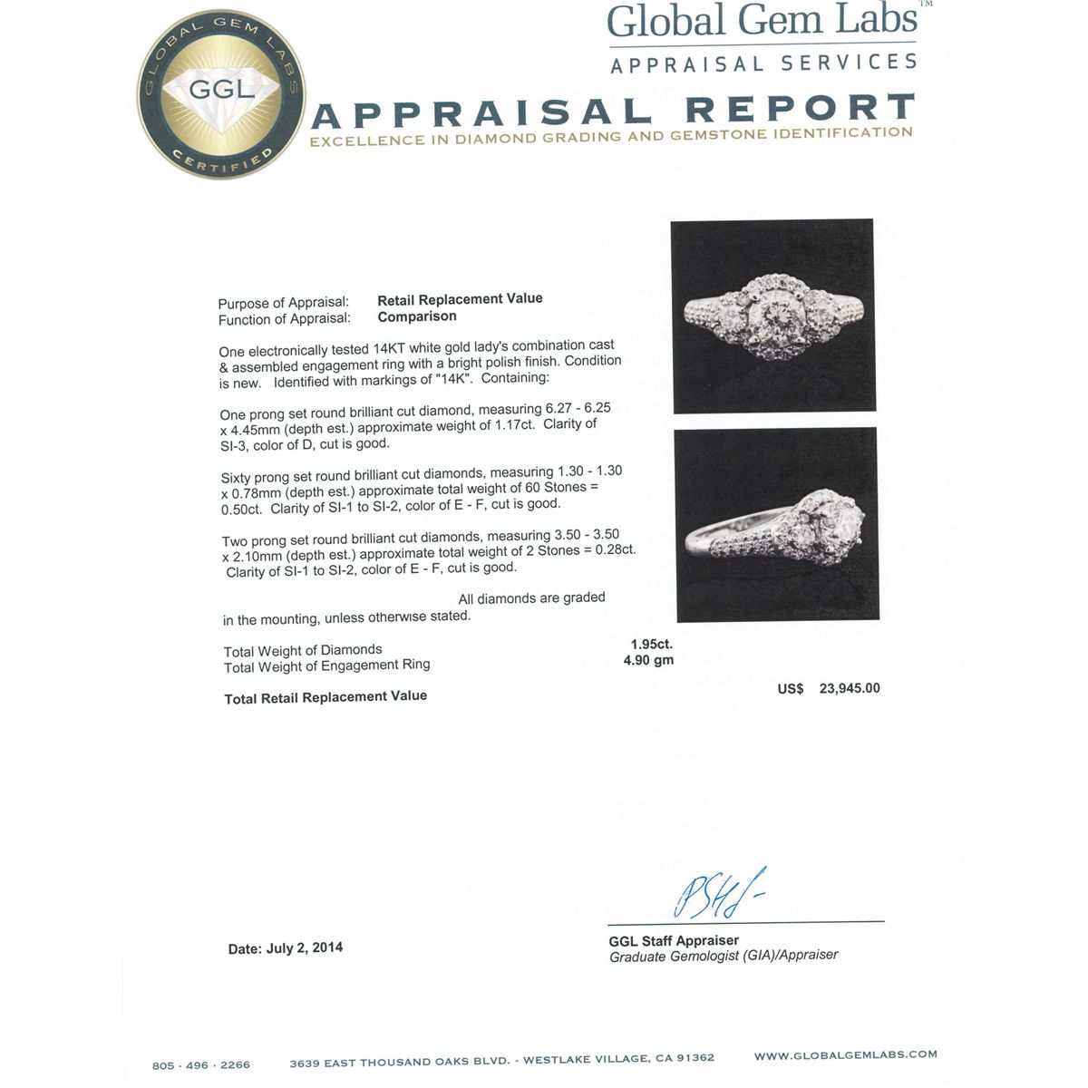 One electronically tested 14KT white gold Ladies combination cast & assembled engagement ring with a bright polish finish. Condition is new. Identified with markings of "14K". Containing: One prong set round brilliant cut diamond, measuring 6.27 - 6.25 x 4.45mm (depth est.) approximate weight of 1.17ct. Clarity: SI-3. Color: D, Cut is Good. Sixty prong set round brilliant cut diamonds, measuring 1.30 - 1.30 x 0.78mm (depth est.) approximate. Total Weight of 60 Stones = 0.50ct. Clarity: SI-1 to SI-2. Color: E - F, Cut is Good. Two prong set round brilliant cut diamonds, measuring 3.50 - 3.50 x 2.10mm (depth est.) approximate. Total Weight of 2 Stones = 0.28ct. Clarity: SI-1 to SI-2. Color: E - F, Cut is Good. EGL USA GEM ID# US 911348422D. All diamonds are graded in the mounting, unless otherwise stated. Total Weight of Diamonds 1.95ct. Total Weight of Engagement Ring 4.90 grams. GGL Appraised at $23,945.00.