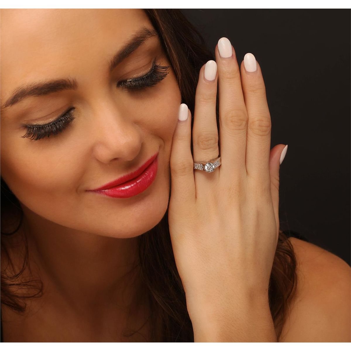 One electronically tested 14KT white gold ladies cast diamond unity ring with a bright polish finish. Condition is new, good workmanship. The featured diamond is cathedral set supported by diamond set shoulders, completed by a three millimeter wide band. Identified with markings of "14K". Containing: One prong set round brilliant cut diamond, measuring 6.05 - 6.00 x 4.05mm (depth est.), 4.05%. GTCF approximate weight of 1.03ct. Graded in the setting. Clarity: I-2. Color: I Depth 67.2%. Table 56.4%. Sixteen channel set princess cut diamonds, measuring 2.10 x 2.00 x 1.50mm (depth est.) approximate. Total Weight of 16 Stones = 0.92ct. Graded in the setting. Clarity: VS-1 to SI-1. Color: G - I. Total Weight of Diamonds 1.95ct. Total Weight of Ring 6.52 grams. AIG Appraised at $12,335.00.