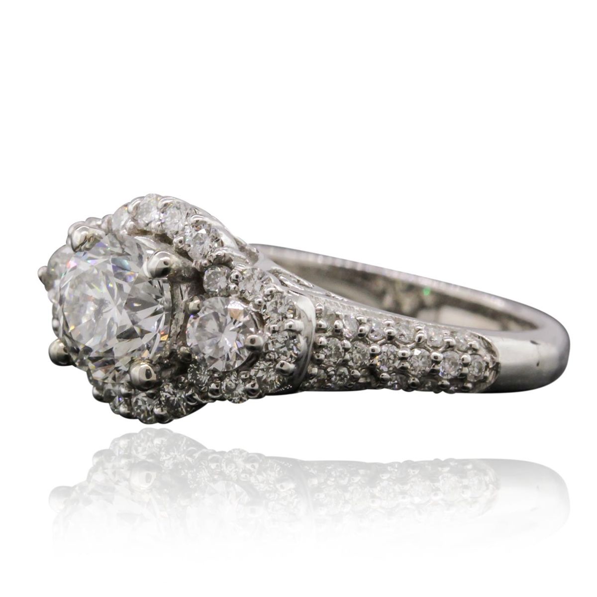 One electronically tested 14KT white gold Ladies combination cast & assembled engagement ring with a bright polish finish. Condition is new. Identified with markings of "14K". Containing: One prong set round brilliant cut diamond, measuring 6.27 - 6.25 x 4.45mm (depth est.) approximate weight of 1.17ct. Clarity: SI-3. Color: D, Cut is Good. Sixty prong set round brilliant cut diamonds, measuring 1.30 - 1.30 x 0.78mm (depth est.) approximate. Total Weight of 60 Stones = 0.50ct. Clarity: SI-1 to SI-2. Color: E - F, Cut is Good. Two prong set round brilliant cut diamonds, measuring 3.50 - 3.50 x 2.10mm (depth est.) approximate. Total Weight of 2 Stones = 0.28ct. Clarity: SI-1 to SI-2. Color: E - F, Cut is Good. EGL USA GEM ID# US 911348422D. All diamonds are graded in the mounting, unless otherwise stated. Total Weight of Diamonds 1.95ct. Total Weight of Engagement Ring 4.90 grams. GGL Appraised at $23,945.00.