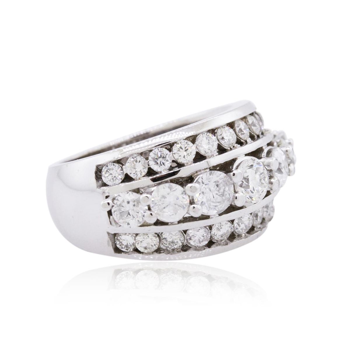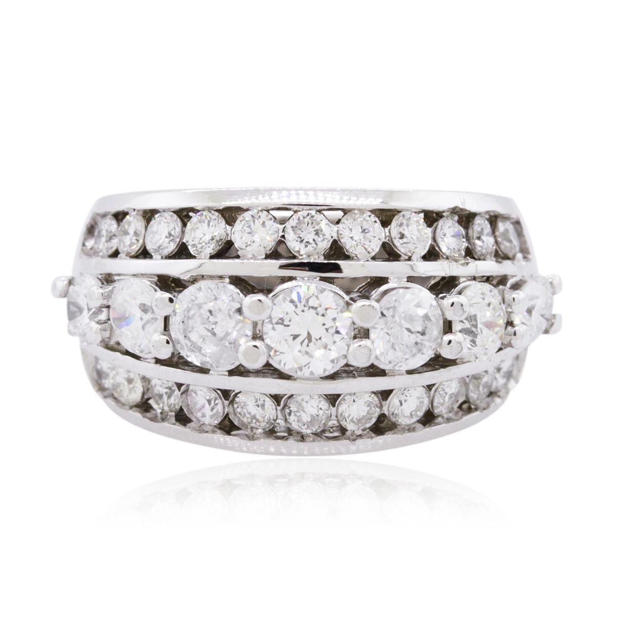 One electronically tested 14KT white gold ladies combination cast & assembled diamond ring with a bright polish finish. Identified with markings of "14K". Condition is new. Containing: Seven prong set round brilliant cut diamonds, measuring 4.00 - 3.50 x 2.25mm (depth est.) approximate total weight of 7 Stones = 1.35ct. Clarity: SI-1 to SI-2. Color: H - J, Cut is Good. Twenty-Two channel set round brilliant cut diamonds, measuring 2.00 - 1.90 x 1.17mm (depth est.) approximate total weight of 22 Stones = 0.60ct. Clarity: SI-2 to I-1. Color: I - J, Cut is Good. All diamonds are graded in the mounting, unless otherwise stated. Total Weight of Diamonds 1.95ct. Total Weight of Ring 12.50 grams. GGL Appraised at $8,885.00.