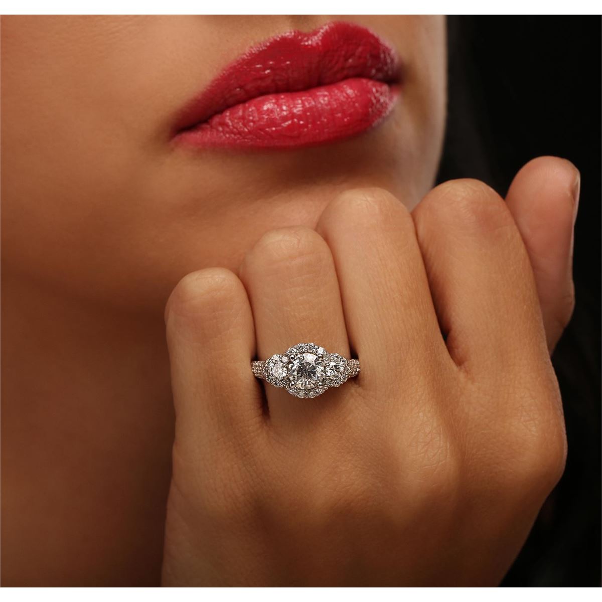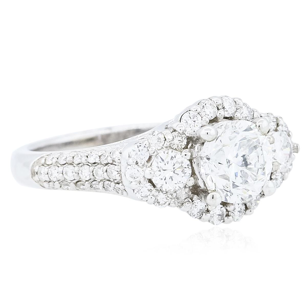 One electronically tested 14KT white gold Ladies combination cast & assembled engagement ring with a bright polish finish. Condition is new. Identified with markings of "14K". Containing: One prong set round brilliant cut diamond, measuring 6.27 - 6.25 x 4.45mm (depth est.) approximate weight of 1.17ct. Clarity: SI-3. Color: D, Cut is Good. Sixty prong set round brilliant cut diamonds, measuring 1.30 - 1.30 x 0.78mm (depth est.) approximate. Total Weight of 60 Stones = 0.50ct. Clarity: SI-1 to SI-2. Color: E - F, Cut is Good. Two prong set round brilliant cut diamonds, measuring 3.50 - 3.50 x 2.10mm (depth est.) approximate. Total Weight of 2 Stones = 0.28ct. Clarity: SI-1 to SI-2. Color: E - F, Cut is Good. EGL USA GEM ID# US 911348422D. All diamonds are graded in the mounting, unless otherwise stated. Total Weight of Diamonds 1.95ct. Total Weight of Engagement Ring 4.90 grams. GGL Appraised at $23,945.00.