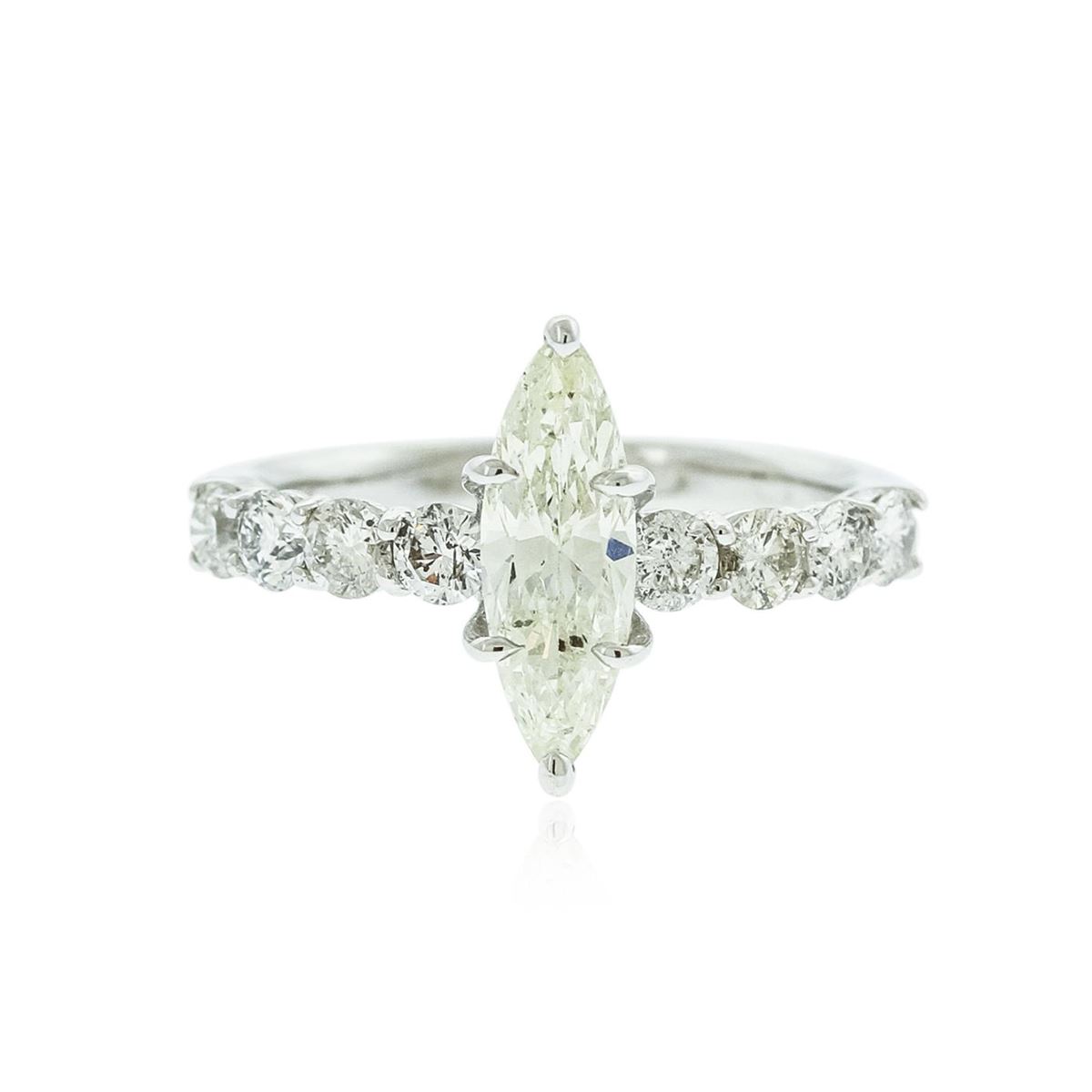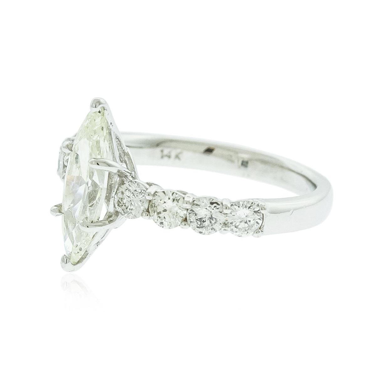 One electronically tested 14KT white gold ladies cast diamond unity ring with a bright polish finish. The featured diamond is supported by diamond set shoulders, completed by a two millimeter wide band. Identified with markings of "14K". Condition is new, good workmanship. Containing: One prong set marquise shaped cut diamond, measuring 13.00 x 4.45 x 2.95mm (depth est.) approximate weight of 1.11ct with a faint red fluorescence. Graded in the setting. Clarity: SI-2. Color: L. Depth 66.3%. Table 60.7%. Eight prong set round brilliant cut diamonds, measuring 3.00 - 2.90 x 1.77mm (depth est.) approximate total weight of 8 Stones = 0.85ct. Graded in the setting. Clarity: SI-1 to I-1. Color: G - I. Total Weight of Diamonds 1.96ct. Total Weight of Unity Ring 3.14 grams. AIG Appraised at $13,735.00.