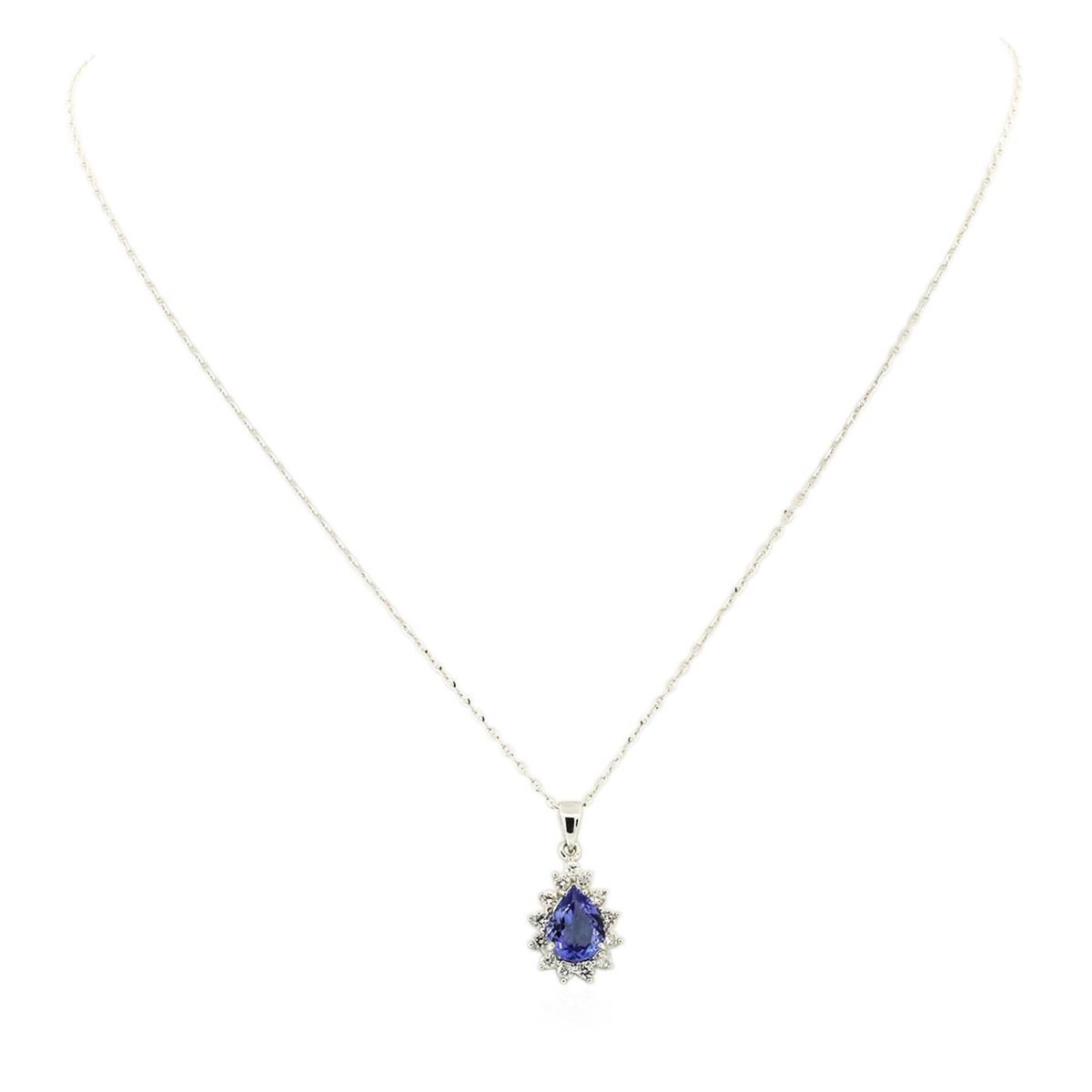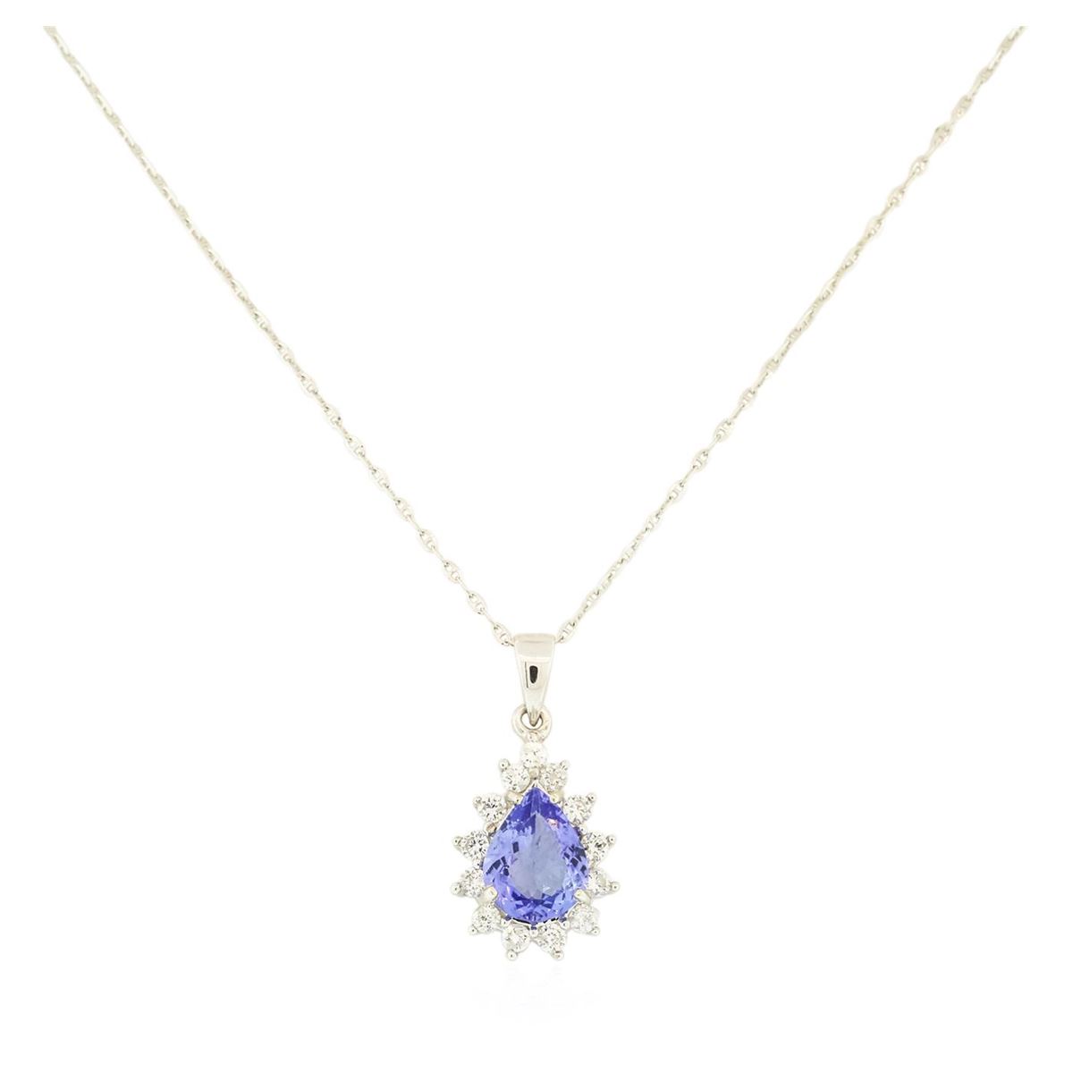 One electronically tested 14KT white gold ladies cast & assembled tanzanite and diamond pendant with chain. The pendant features a tanzanite set within a diamond bezel, completed by a white gold bail. The pendant is supported by an eighteen inch length 14KT white gold designer style chain, terminating in a spring ring clasp. Bright polish finish. Trademark is Orianne. Identified with markings of "14K". Condition is new, good workmanship. Containing: One prong set pear brilliant cut natural tanzanite, measuring 9.70 x 7.50 x 3.80mm, 6% bulge factor, approximate weight of 1.96ct., clarity is eye clean, type I, medium dark, very slightly grayish, bluish violet color, (GIA bV 6/3), cut is good. Transmitting light with no distortion, transparent. Graded in the setting. Tanzanite is a very rare gemstone that is only found in the country of Tanzania. Originally discovered in 1967. Tiffany & Company, named the stone Tanzanite. It is found in the Usumburu Mountains that border the Umba Valley of northern Tanzania. Tanzanite occurs in gray, brown, violet, blue, reddish-purple, & green. The gem is interesting because of its exceptional pleochroism. Rotated in different directions a tanzanite will exhibit multiple changes of color. Tanzanite has a low tolerance to ultrasonic cleaning, and should not be cleaned using this method. Thirteen prong set round brilliant cut diamonds, measuring 2.30 - 2.20 x 1.35mm (depth est.) approximate total weight of 13 Stones = 0.64ct. Graded in the setting. Clarity: SI-1 to I-1. Color: G - I. Total Weight of Colored Stones 1.96ct. Total Weight of Diamonds 0.64ct. Total Weight of Pendant With Chain 3.58 grams. AIG Appraised at $6,250.00.