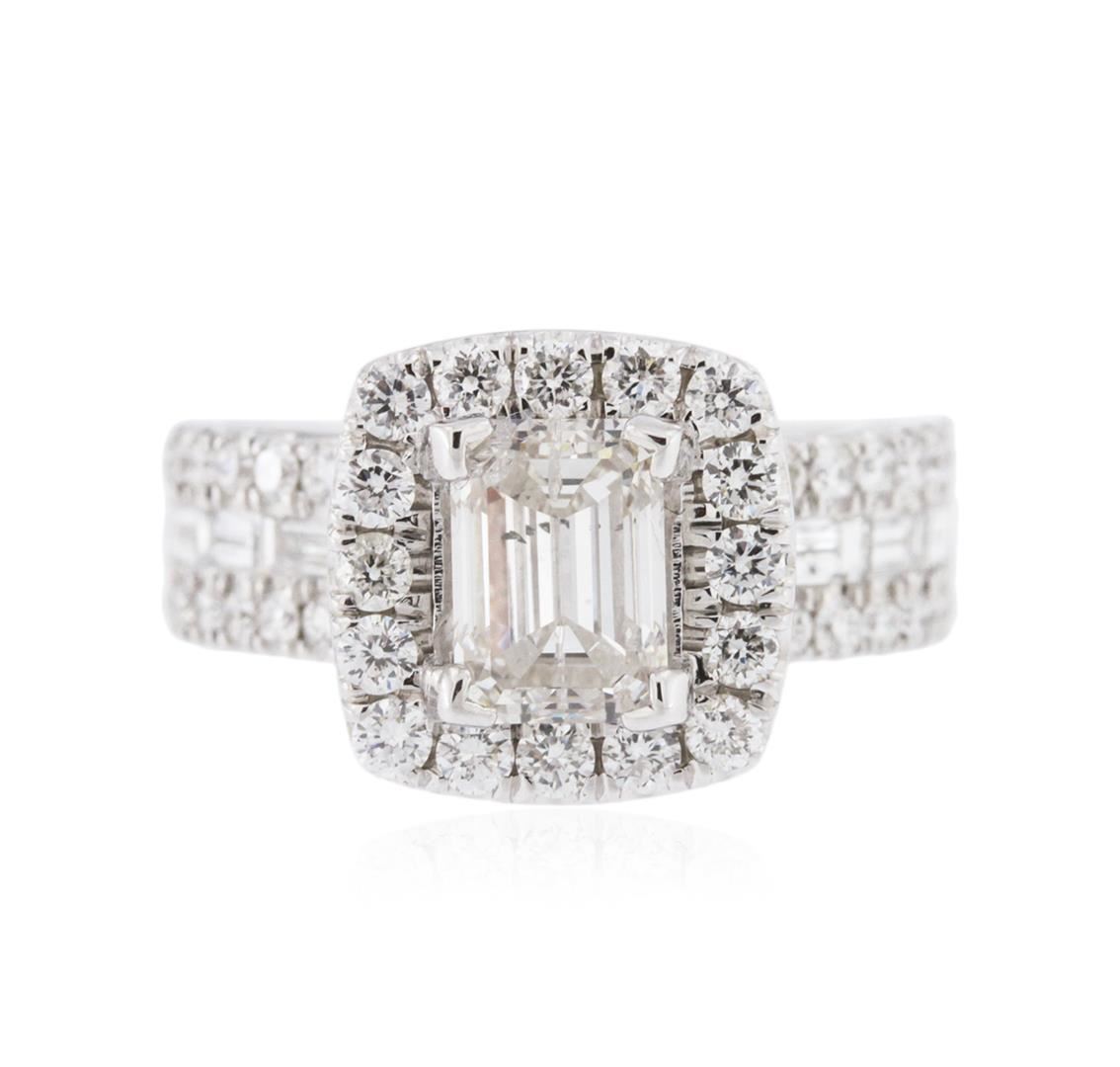 One electronically tested 14KT white gold ladies combination cast & assembled diamond engagement ring with a flat shank with a bright polish finish. Identified with markings of "14K". Condition is new. Containing: One prong set emerald cut diamond, measuring 6.80 x 4.76 x 3.50mm (depth est.) approximate weight of 1.04ct. Clarity: SI-2. Color: I, Cut is Good. Eight channel set baguette cut diamonds, measuring 2.50 x 1.50 x 1.28mm (depth est.) approximate total weight of 8 Stones = 0.35ct. Clarity: VS-2. Color: I, Cut is Good. Seventy-Two prong set round brilliant cut diamonds, measuring 1.30 - 1.30 x 0.78mm (depth est.) approximate total weight of 72 Stones = 0.58ct. Clarity: SI-1. Color: I - J, Cut is Good. All diamonds are graded in the mounting, unless otherwise stated. Total Weight of Diamonds 1.97ct. Total Weight of Engagement Ring 5.60 grams. GGL Appraised at $11,445.00.