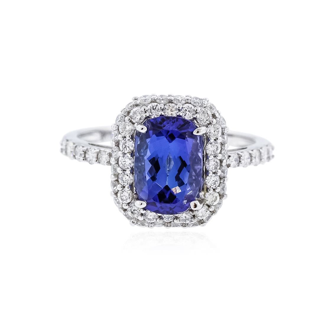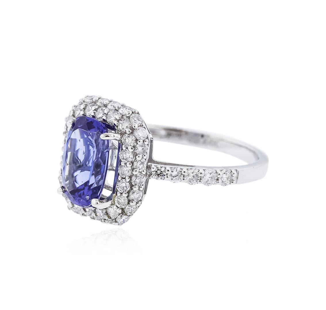 One electronically tested 14KT white gold ladies cast tanzanite and diamond ring with a flat shank with a bright polish finish. Trademark is Orianne. Identified with markings of "14K". Condition is new. Containing: One prong set rectangular cushion modified brilliant cut natural tanzanite, measuring 9.32 x 6.39 x 4.20mm, approximate weight of 1.97ct., clarity is eye clean, type I, medium light, very slightly grayish, violetish blue color, (GIA vB 4/3), cut is good. Fifty-Four prong set round brilliant cut diamonds, measuring 1.60 - 1.50 x 0.93mm (depth est.) approximate total weight of 54 Stones = 0.73ct. Clarity: SI-2 to I-2. Color: I - J, Cut is Good. All diamonds and colored gemstones are graded in the mounting, unless otherwise stated. Colored gemstones are presumed to have been subjected to commonly used enhancement processes. Total Weight of Colored Stones 1.97ct. Total Weight of Diamonds 0.73ct. Total Weight of Ring 3.00 grams. GGL Appraised at $3,755.00.