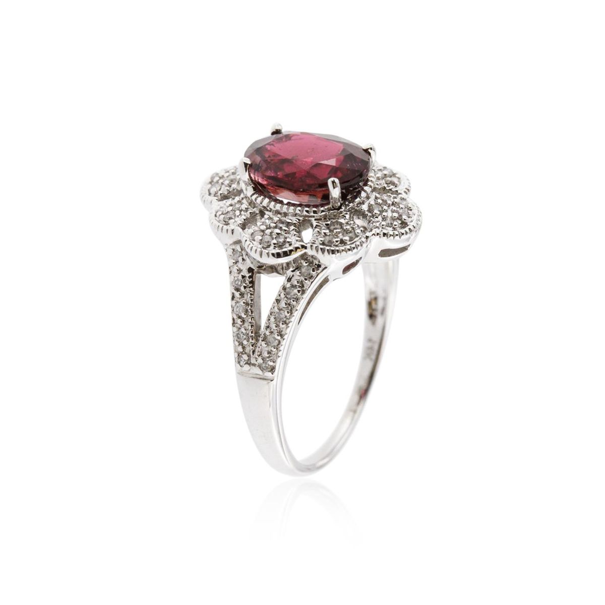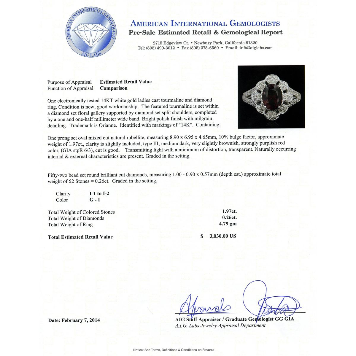 One electronically tested 14KT white gold ladies cast tourmaline and diamond ring. Condition is new, good workmanship. The featured tourmaline is set within a diamond set floral gallery supported by diamond set split shoulders, completed by a one and one-half millimeter wide band. Bright polish finish with milgrain detailing. Trademark is Orianne. Identified with markings of "14K". Containing: One prong set oval mixed cut natural rubellite, measuring 8.90 x 6.95 x 4.65mm, 10%. bulge factor, approximate weight of 1.97ct., clarity is slightly included, type III, medium dark, very slightly brownish, strongly purplish red color, (GIA stpR 6/3), cut is good. Transmitting light with a minimum of distortion, transparent. Naturally occurring internal & external characteristics are present. Graded in the setting. Fifty-Two bead set round brilliant cut diamonds, measuring 1.00 - 0.90 x 0.57mm (depth est.) approximate. Total Weight of 52 Stones = 0.26ct. Graded in the setting. Clarity: I-1 to I-2. Color: G - I. Total Weight of Colored Stones 1.97ct. Total Weight of Diamonds 0.26ct. Total Weight of Ring 4.79 grams. AIG Appraised at $3,030.00.