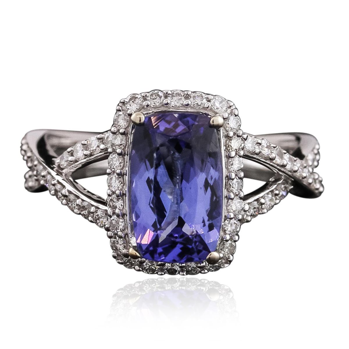 One electronically tested 14KT white gold ladies combination cast & assembled tanzanite and diamond ring with a split shank with a bright polish finish. Identified with markings of "14K". Condition is new. Containing: One prong set rectangular cushion modified brilliant cut natural tanzanite, measuring 10.21 x 6.14 x 3.99mm, approximate weight of 1.97ct., clarity is eye clean, type I, medium light, very slightly grayish, violet color, (GIA V 4/3), cut is good. Fifty-Six prong set round brilliant cut diamonds, measuring 1.30 - 1.30 x 0.78mm (depth est.) approximate total weight of 56 Stones = 0.45ct. Clarity: SI-2 to I-2. Color: I - J, Cut is Good. All colored gemstones are graded in the mounting, unless otherwise stated. All diamonds and colored gemstones are graded in the mounting, unless otherwise stated. Total Weight of Colored Stones 1.97ct. Total Weight of Diamonds 0.45ct. Total Weight of Ring 4.20 grams. GGL Appraised at $5,165.00.