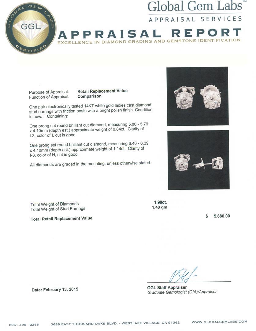 One pair electronically tested 14KT white gold ladies cast diamond stud earrings with friction posts with a bright polish finish. Condition is new. Containing: One prong set round brilliant cut diamond, measuring 5.80 - 5.79 x 4.10mm (depth est.) approximate weight of 0.84ct. Clarity: I-3. Color: I, Cut is Good. One prong set round brilliant cut diamond, measuring 6.40 - 6.39 x 4.10mm (depth est.) approximate weight of 1.14ct. Clarity: I-3. Color: H, Cut is Good. All diamonds are graded in the mounting, unless otherwise stated. Total Weight of Diamonds 1.98ct. Total Weight of Stud Earrings 1.40 grams. GGL Appraised at $5,880.00.