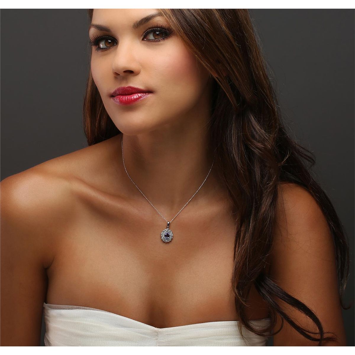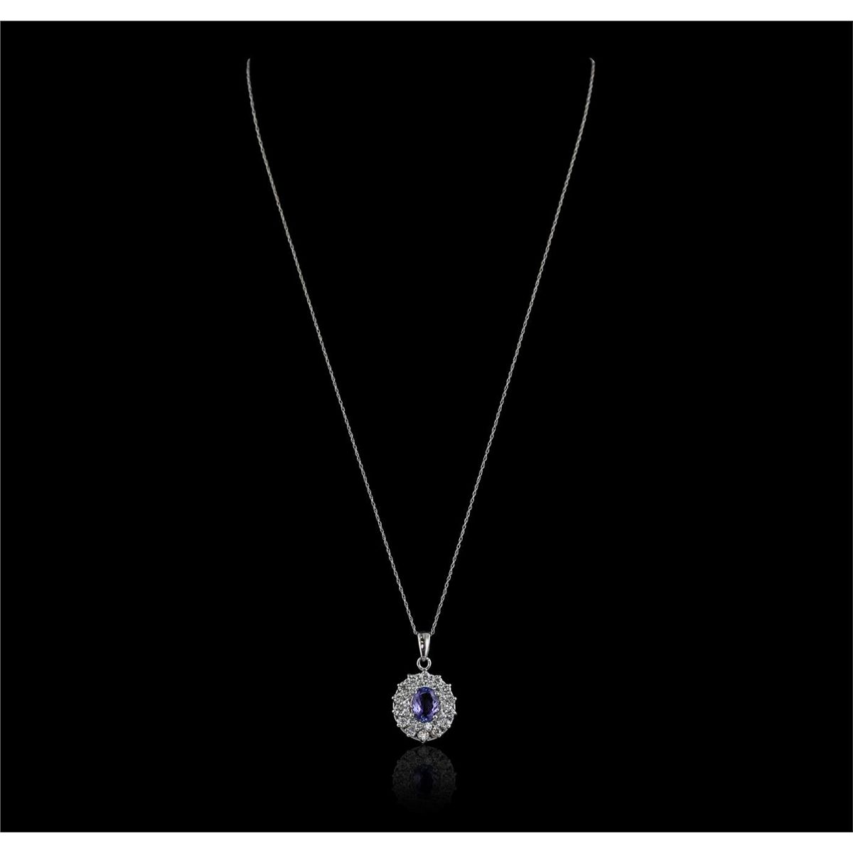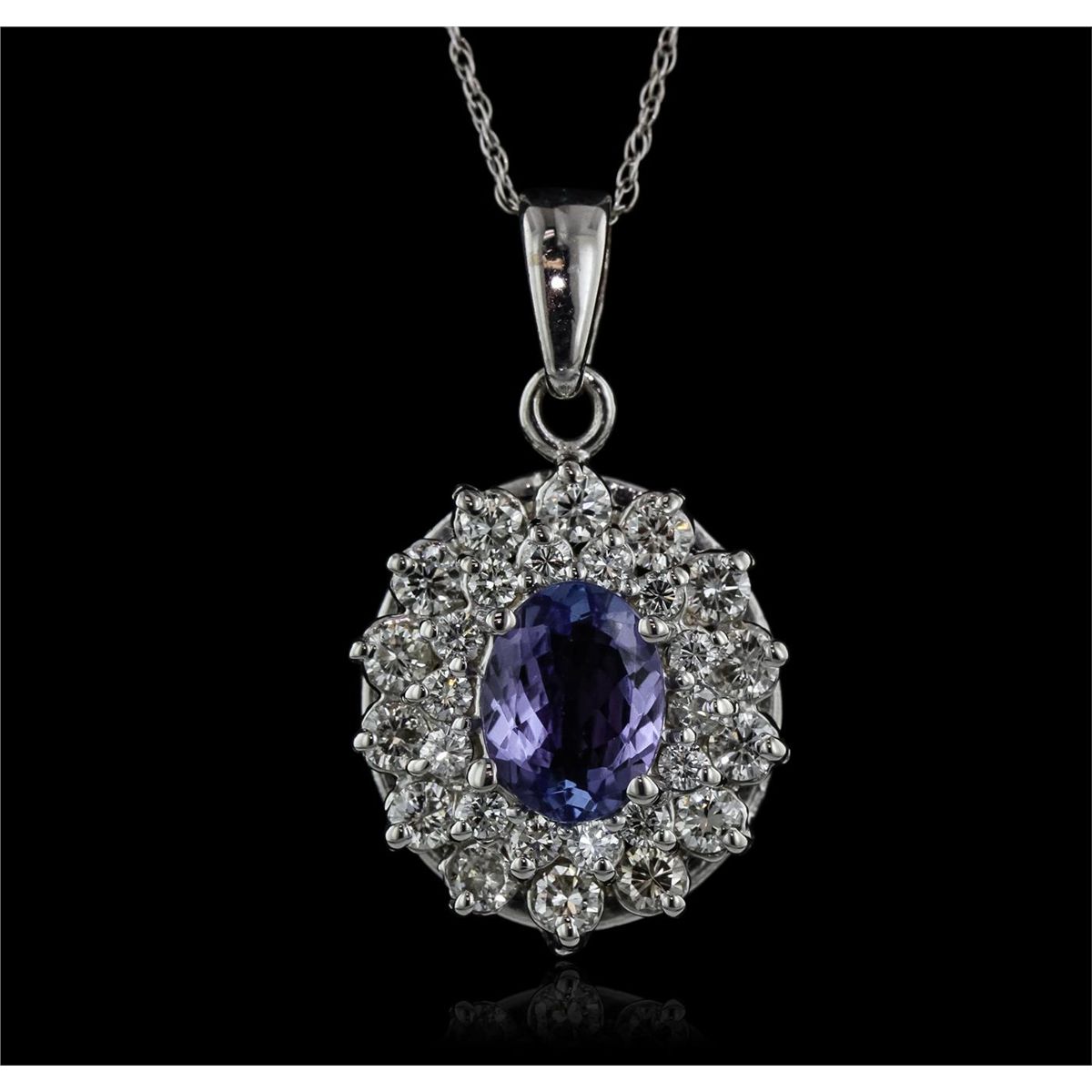 One pendant with chain featuring: 14KT white gold with a total weight of 3.68 grams, tanzanite with a total weight of 1.98ct, and diamonds with a total weight of 0.97ctw.