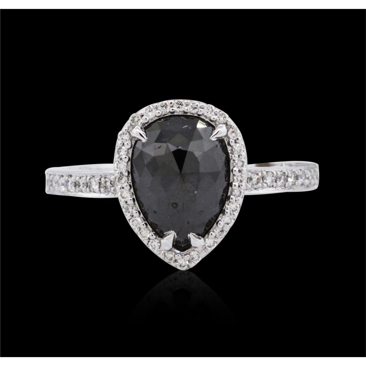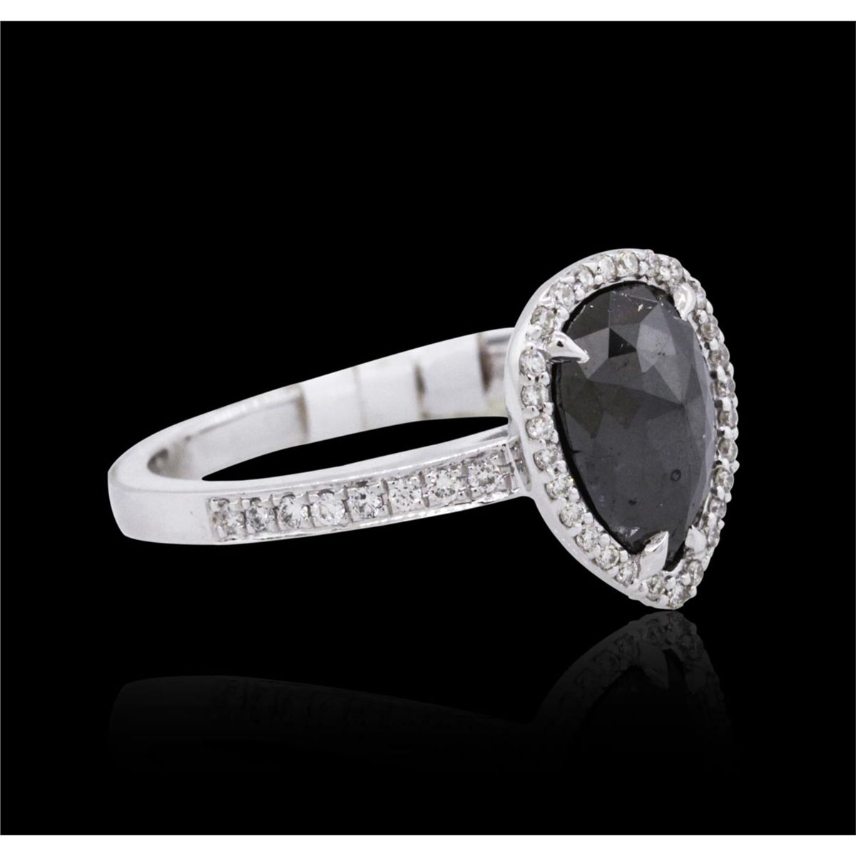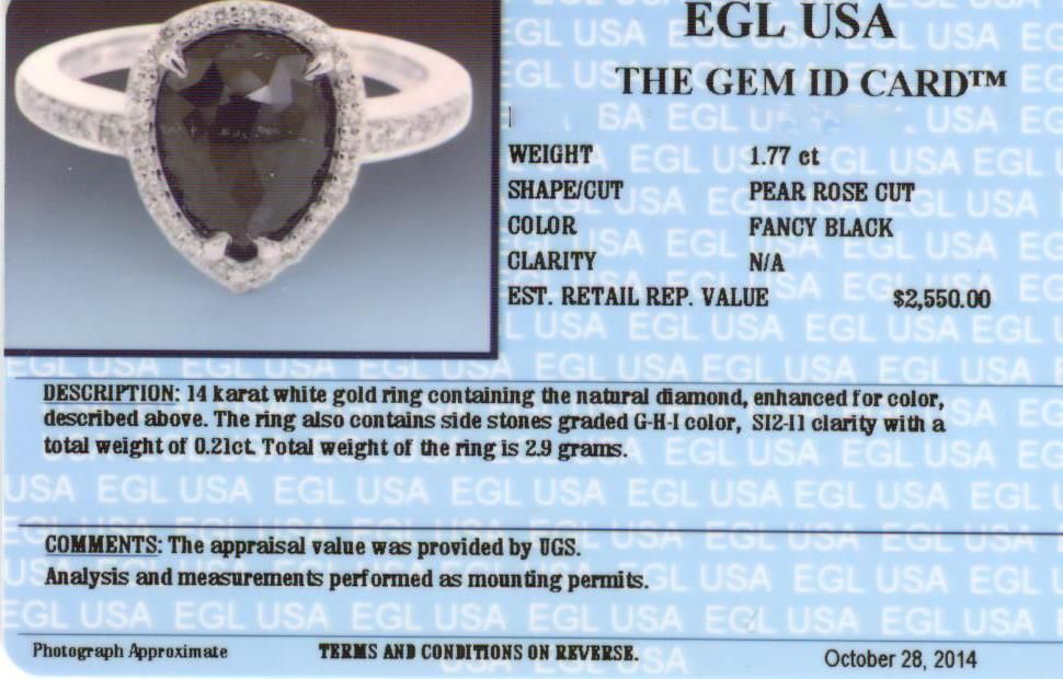 One 14KT white gold ring containing one natural pear rose cut fancy black diamond, enhanced for color, with a total weight of 0.77ct. The ring also contains side stones graded G-H-I color, SI2-I1 clarity with a total weight of 0.21ct. Total weight of the ring is 2.90 grams. EGL Appraised at $2,550.00.