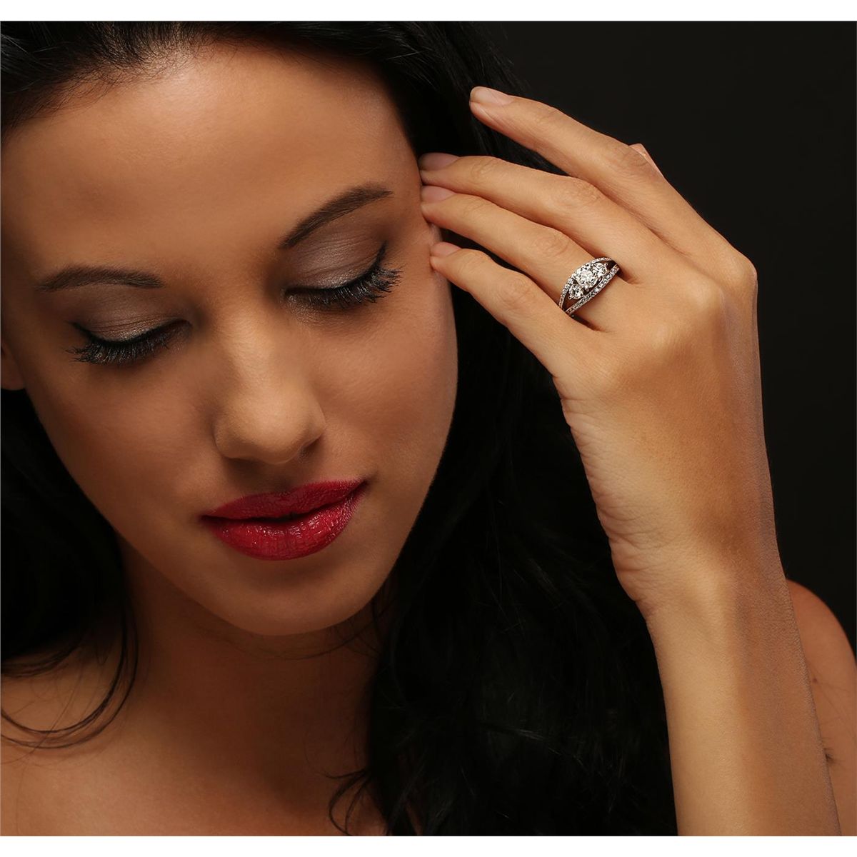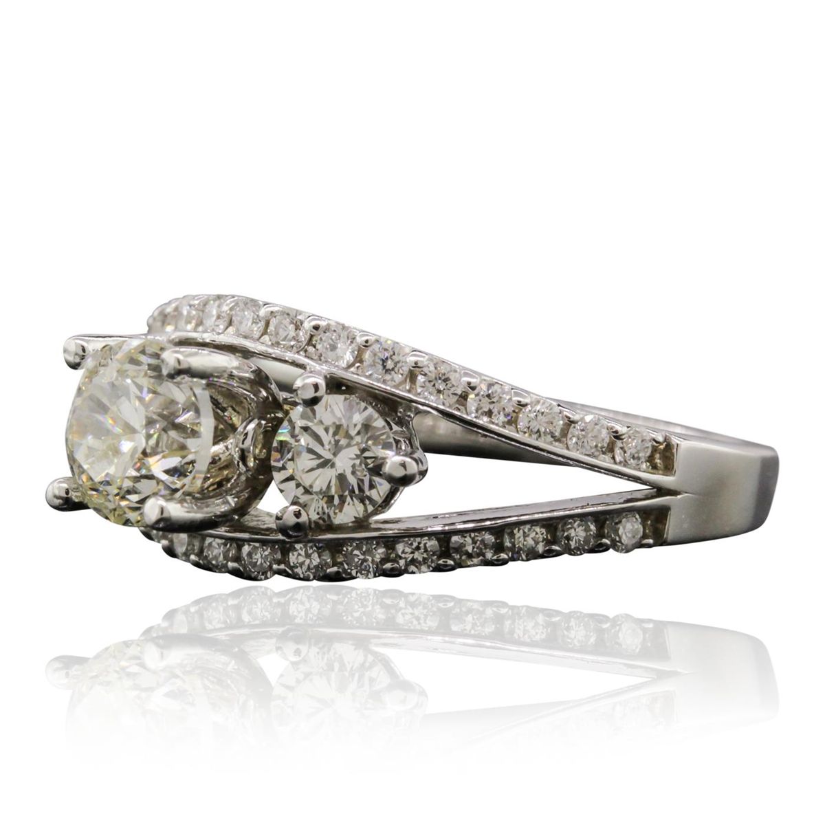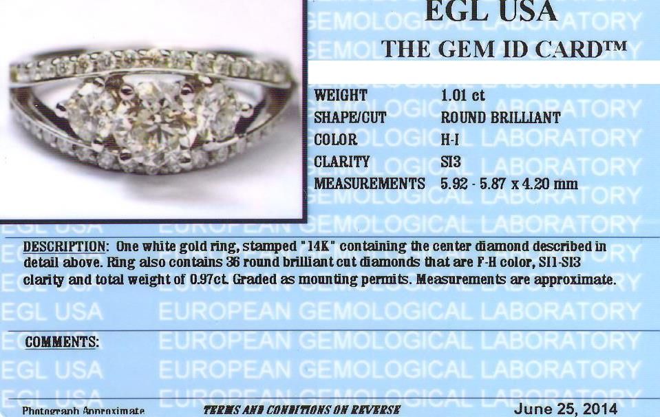 One electronically tested 14KT white gold Ladies combination cast & assembled engagement ring with a bright polish finish. Condition is new. Identified with markings of "14K". Containing: One prong set round brilliant cut diamond, measuring 5.92 - 5.87 x 3.64mm (depth est.) approximate. Total Weight of 1.01ct. Clarity: SI-3. Color: H, Cut is Good. Thirty-Four prong set round brilliant cut diamonds, measuring 1.30 - 1.30 x 0.78mm (depth est.) approximate. Total Weight of 34 Stones = 0.27ct. Clarity: SI-1 to SI-3. Color: F - H, Cut is Good. Two prong set round brilliant cut diamonds, measuring 4.60 - 4.60 x 2.76mm (depth est.) approximate. Total Weight of 2 Stones = 0.70ct. Clarity: SI-1 to SI-3. Color: H, Cut is Good. EGL USA GEM ID# US 911348436D. All diamonds are graded in the mounting, unless otherwise stated. Total Weight of Diamonds 1.98ct. Total Weight of Engagement Ring 5.70 grams. GGL Appraised at $23,225.00.