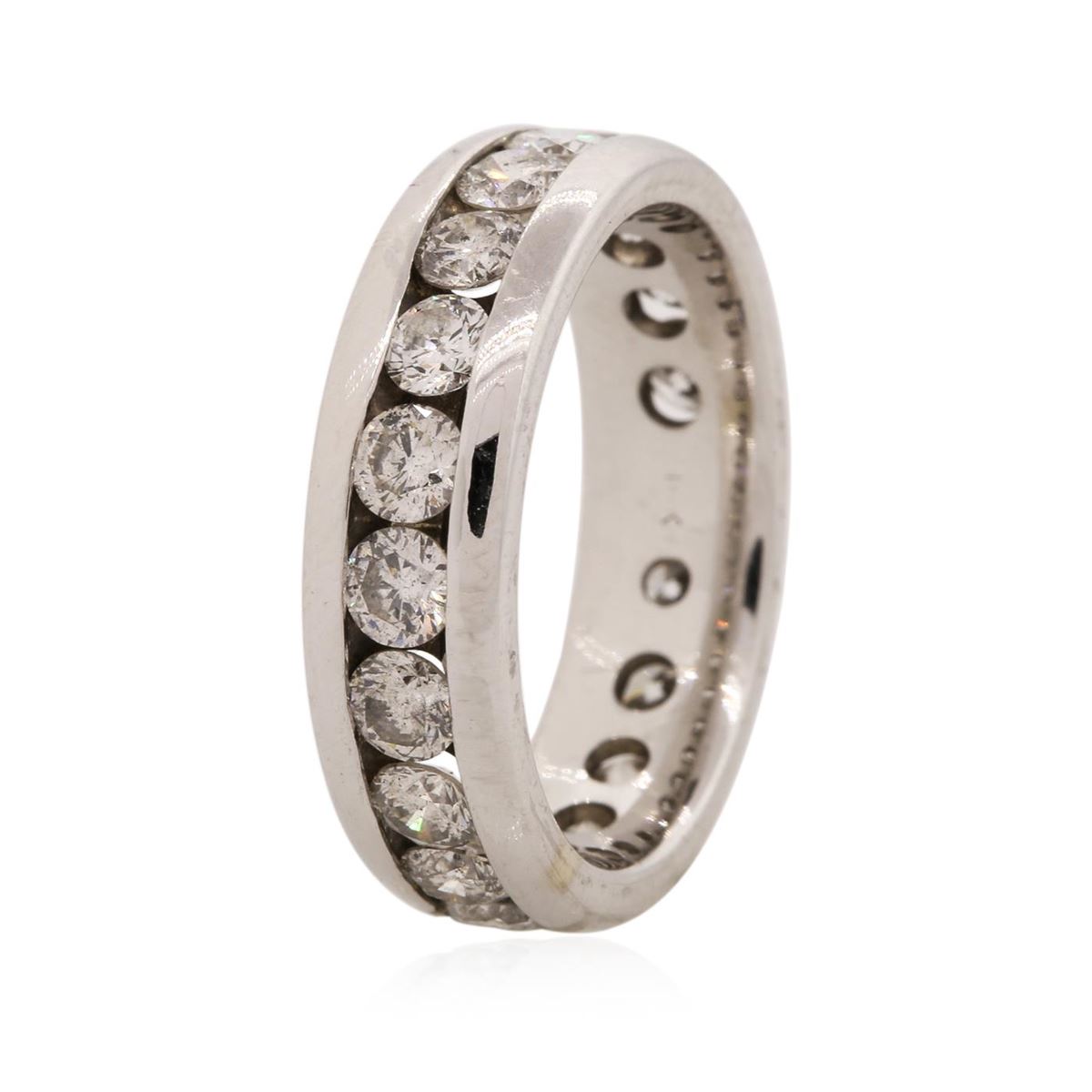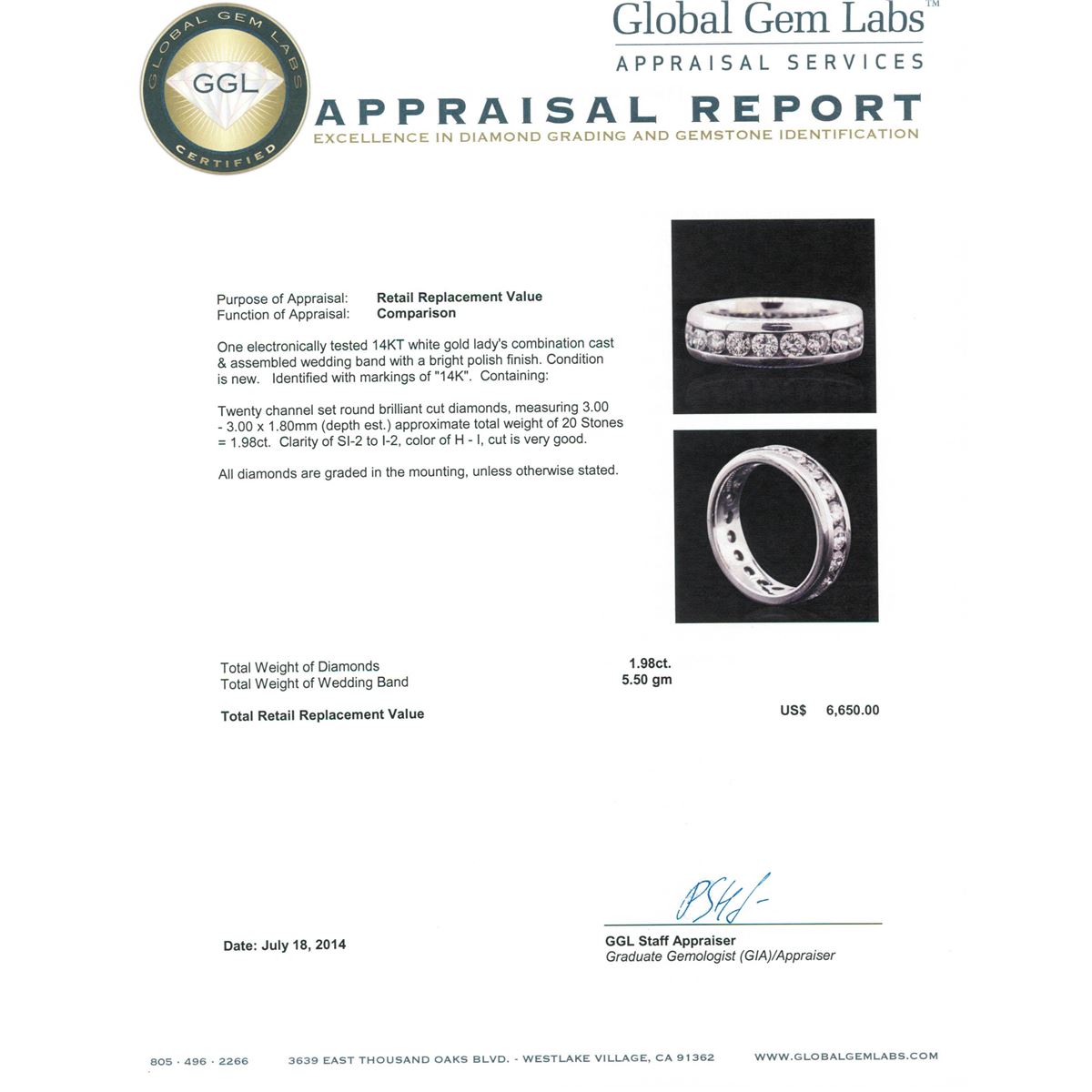 One electronically tested 14KT white gold Ladies combination cast & assembled wedding band with a bright polish finish. Condition is new. Identified with markings of "14K". Containing: Twenty channel set round brilliant cut diamonds, measuring 3.00 - 3.00 x 1.80mm (depth est.) approximate. Total Weight of 20 Stones = 1.98ct. Clarity: SI-2 to I-2. Color: H - I, Cut is Very Good. All diamonds are graded in the mounting, unless otherwise stated. Total Weight of Diamonds 1.98ct. Total Weight of Wedding Band 5.50 grams.. GGL Appraised at $6,650.00.