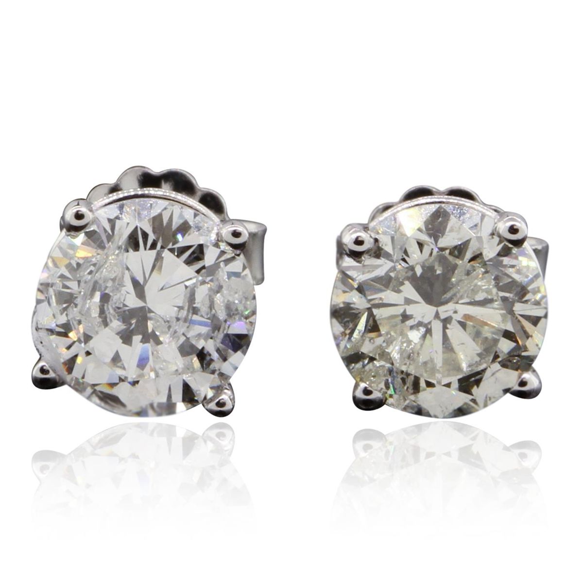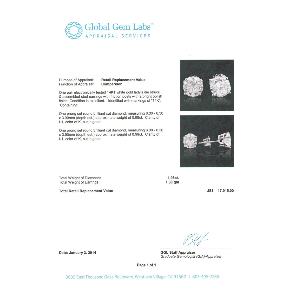 One pair electronically tested 14KT white gold Ladies die struck & assembled stud earrings with friction posts with a bright polish finish. Identified with markings of "14K". Condition is excellent. Containing: One prong set round brilliant cut diamond, measuring 6.30 - 6.30 x 3.90mm (depth est.) approximate weight of 0.99ct. Clarity of I-1, Color of K, Cut is Good. One prong set round brilliant cut diamond, measuring 6.30 - 6.30 x 3.90mm (depth est.) approximate weight of 0.99ct. Clarity of I-1, Color of K, Cut is Good. Comes with platinum posts. Total Weight of Diamonds 1.98ct. Total Weight of Earrings 1.30gm. GGL Appraised at $17,915.00.
