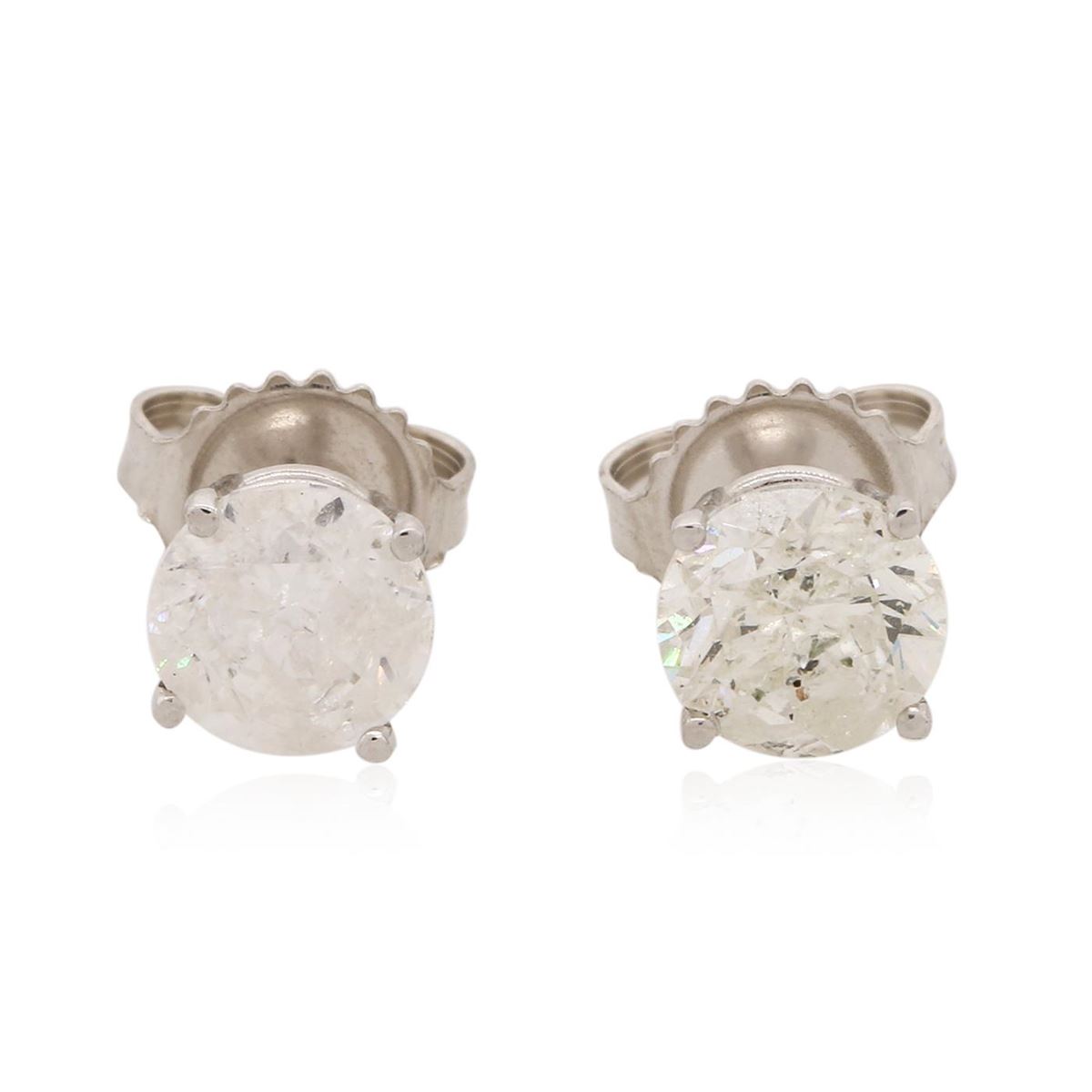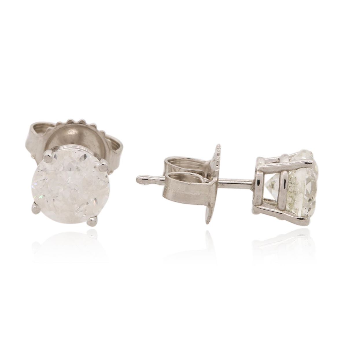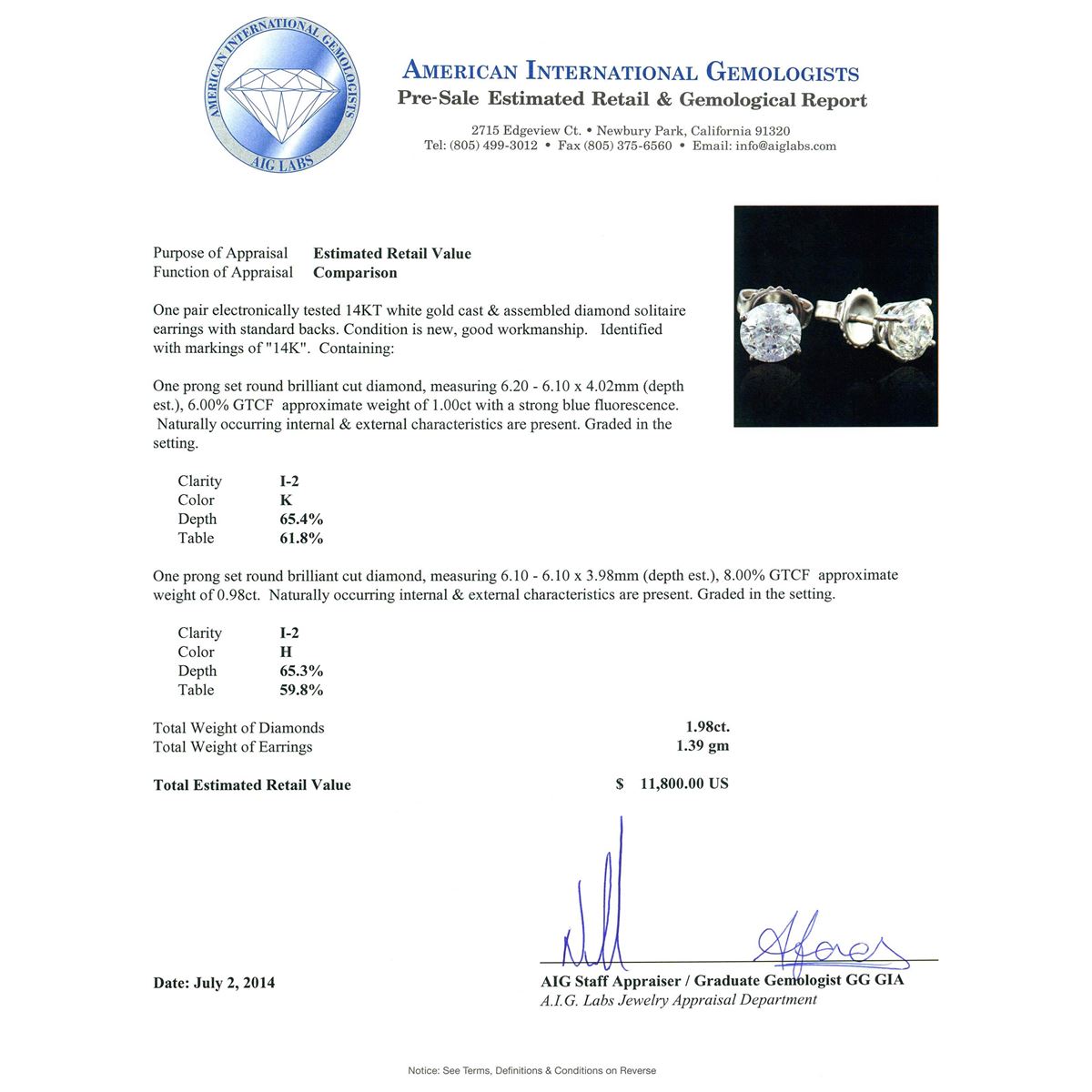 One pair electronically tested 14KT white gold cast & assembled diamond solitaire earrings with standard backs. Condition is new, good workmanship. Identified with markings of "14K". Containing: One prong set round brilliant cut diamond, measuring 6.20-6.10x4.02mm (depth est) 6.00% GTCF approximate weight of 1.00ct with a strong blue fluorescence. Graded in the setting. Clarity I-2 Color K Depth 65.40% Table 61.80%. One prong set round brilliant cut diamond, measuring 6.10-6.10x3.98mm (depth est) 8.00% GTCF approximate weight of 0.98ct. Naturally occurring internal and external characteristics are present. Graded in the setting. Clarity I-2 Color H Depth 65.30% Table 59.80%. Total weight of diamonds 1.98ct. Total weight of earrings 1.39 grams. AIG Appraised at $11,800.00.
