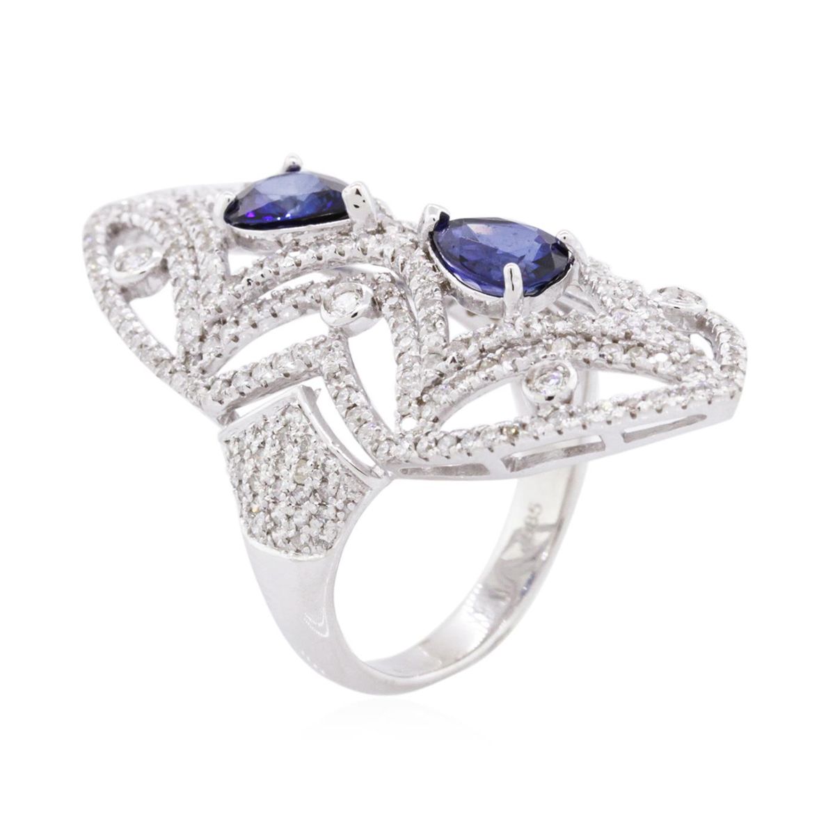 One electronically tested 14KT white gold ladies cast sapphire and diamond ring with a bright polish finish. The ring features two sapphire set within a mirroring diamond set lattice design supported by diamond set shoulders, completed by a three millimeter wide band. Identified with markings of "585". Condition is new, good workmanship. Containing: Two prong set pear mixed cut natural blue sapphires, measuring 7.30 x 5.20 x 3.10mm, approximate total weight of 1.98ct., clarity is slightly included, type II, dark, moderately strong, blue color, (GIA B 7/4), cut is good. Transmitting light with a minimum of distortion, transparent. Naturally occurring internal & external characteristics are present. Measurements & the color grade are an average for the group. Indications of laboratory high temperature diffusion treatment. Graded in the setting. Six bezel set round brilliant cut diamonds, measuring 2.10 - 2.00 x 1.23mm (depth est.) approximate total weight of 6 Stones = 0.24ct. Graded in the setting. Clarity: SI-2 to I-1. Color: G - H Two Hundred Fifty-Five prong set round brilliant cut diamonds, measuring 1.20 - 1.10 x 0.69mm (depth est.) approximate total weight of 255 Stones = 1.50ct. Graded in the setting. Clarity: I-1 to I-2. Color: G - I. Total Weight of Colored Stones 1.98ct. Total Weight of Diamonds 1.74ct. Total Weight of Ring 8.32 grams. AIG Appraised at $7,780.00.