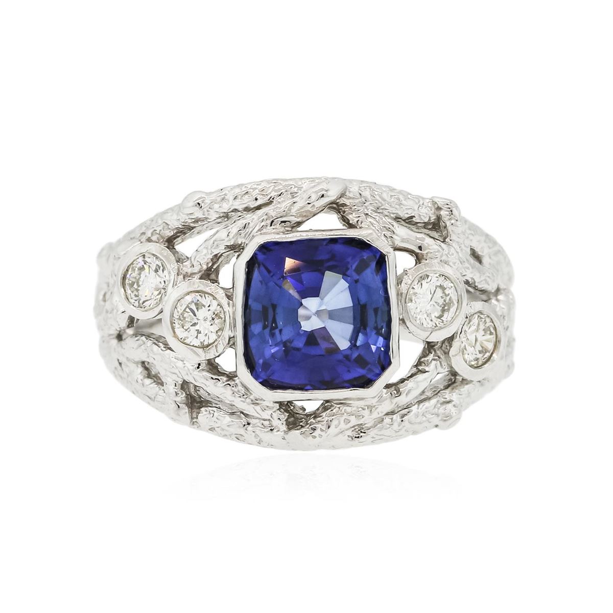 One electronically tested 14KT white gold ladies combination cast & assembled ring with a bright polish finish. Condition is new. Identified with markings of "14K". Containing: One prong set square cushion modified brilliant cut natural tanzanite, measuring 7.30 x 7.30 x 4.75mm, approximate weight of 1.99ct., clarity is eye clean, type I, medium, moderately strong, blue color, (GIA B 5/4), cut is good. Four bezel set round brilliant cut diamonds, measuring 3.00 - 3.00 x 1.80mm (depth est.) approximate total weight of 4 Stones = 0.40ct. Clarity: SI-2 to I-1. Color: I - J, Cut is Good. Colored gemstones are presumed to have been subjected to commonly used enhancement processes. All diamonds and colored gemstones are graded in the mounting, unless otherwise stated. Total Weight of Colored Stones 1.99ct. Total Weight of Diamonds 0.40ct. Total Weight of Ring 8.10 grams. GGL Appraised at $6,525.00.
