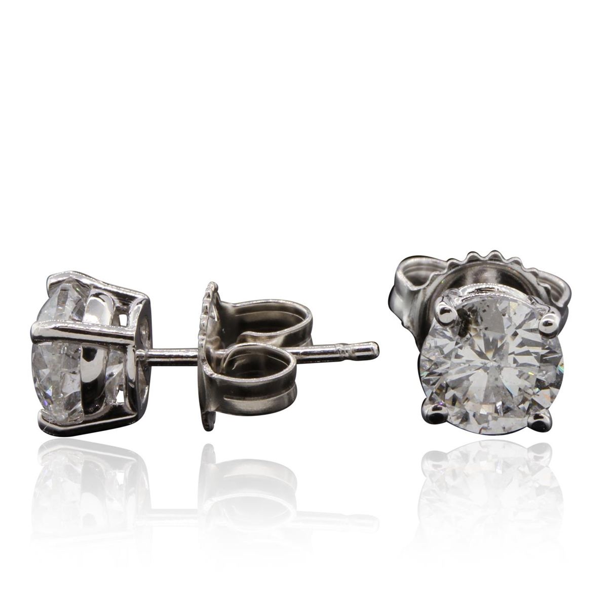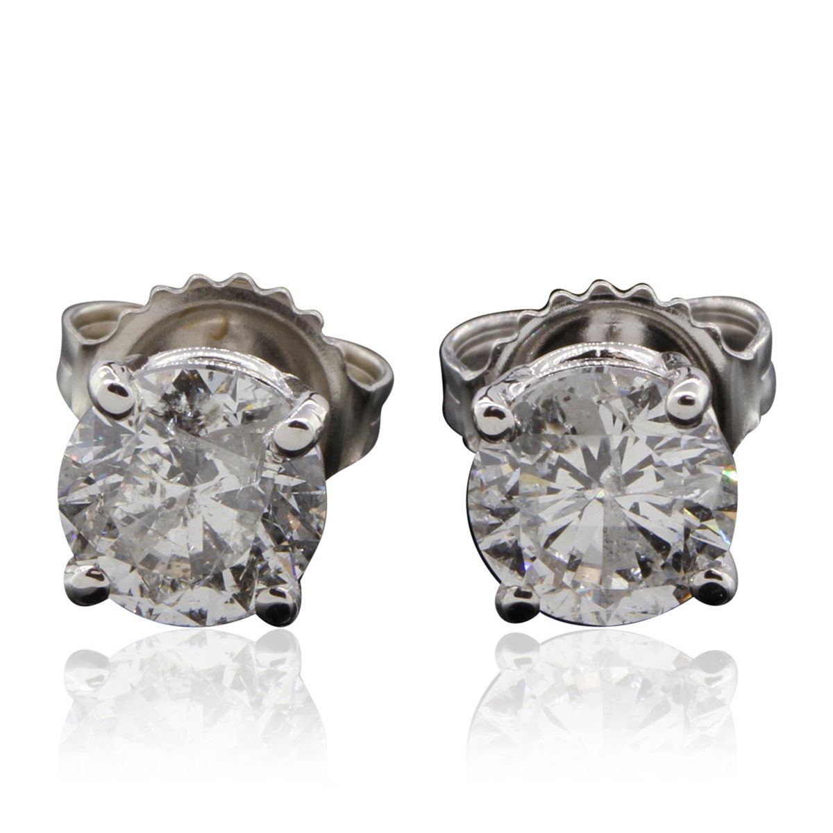 One pair electronically tested 14KT white gold Ladies die struck & assembled stud earrings with friction posts with a bright polish finish. Identified with markings of "14K". Condition is excellent. Containing: One prong set round brilliant cut diamond, measuring 6.30 - 6.20 x 4.00mm (depth est.) approximate weight of 0.99ct. Clarity of I-2, Color of H, Cut is Good. One prong set round brilliant cut diamond, measuring 6.40 - 6.30 x 4.10mm (depth est.) approximate weight of 1.00ct. Clarity of I-2, Color of H, Cut is Good. Total Weight of Diamonds 1.99ct. Total Weight of Earrings 1.50gm. GGL Appraised at $16,175.00.