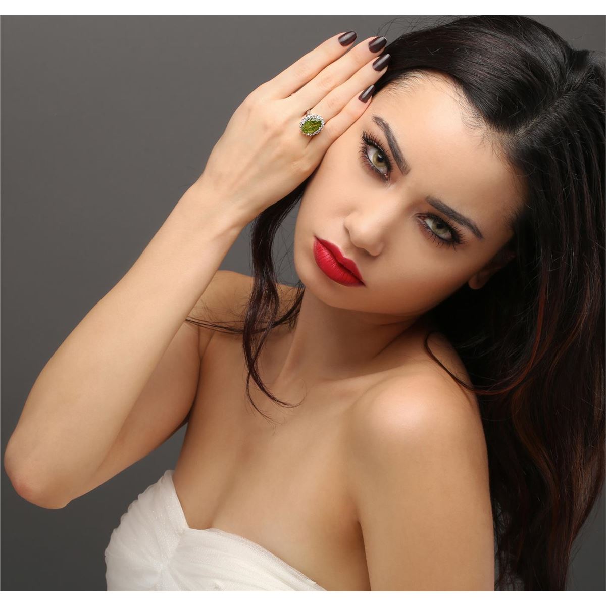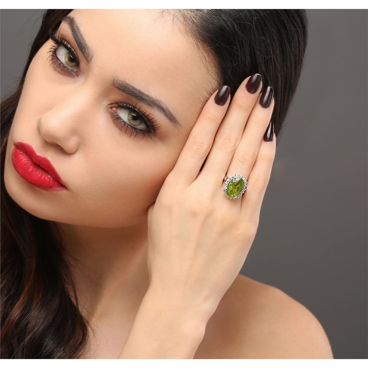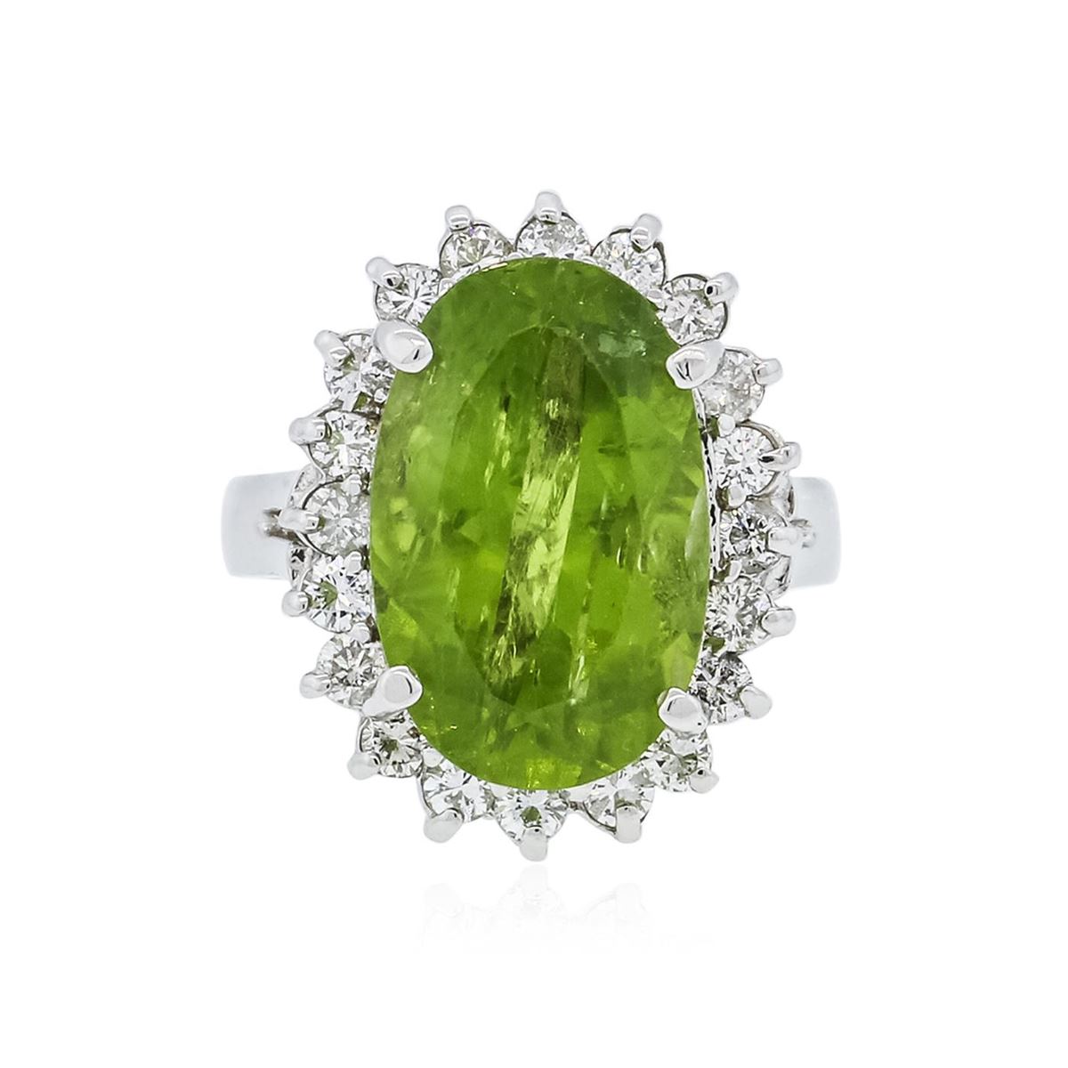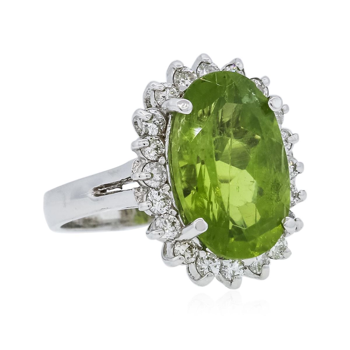 One ring featuring: 14KT white gold weighing 5.20 grams containing one peridot center stone with a total weight of 10.00ct and round diamonds with a total weight of 0.81ct.